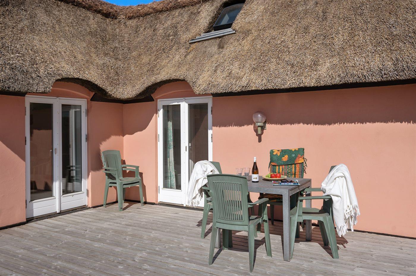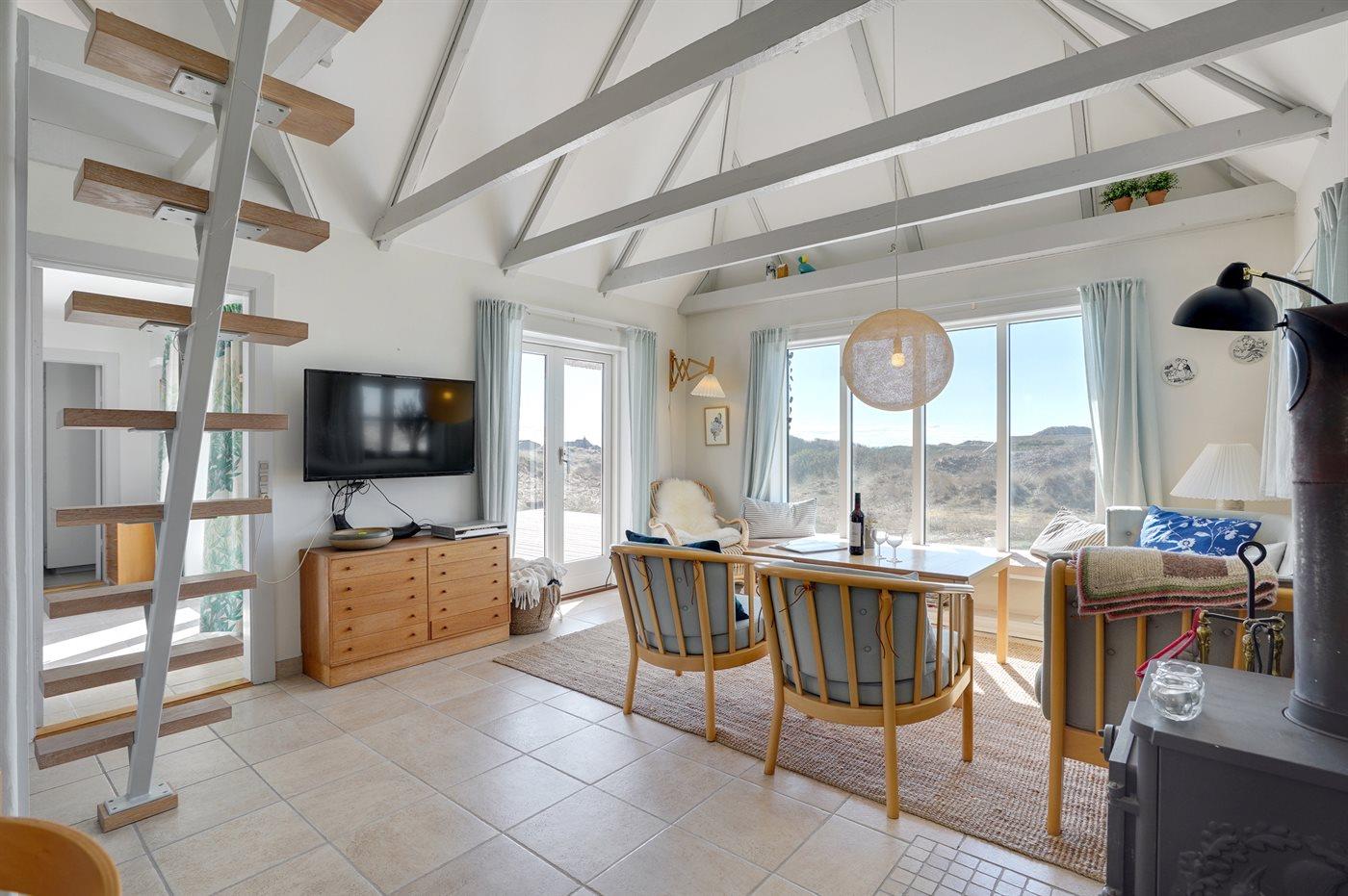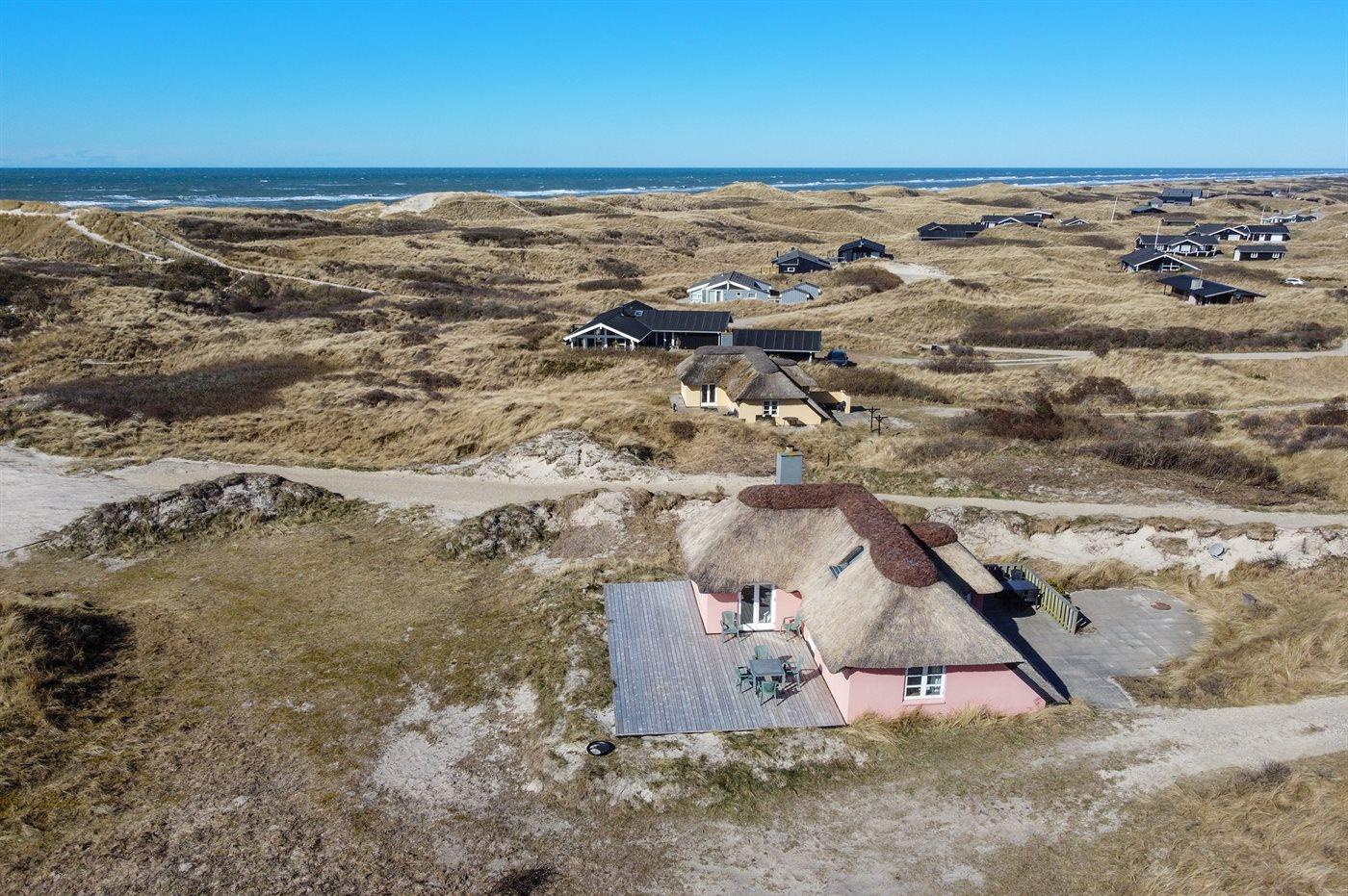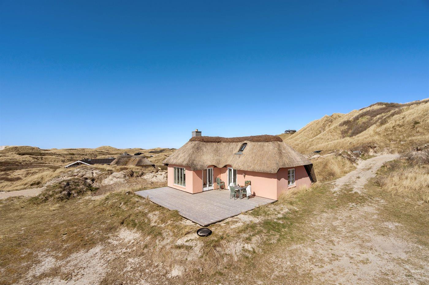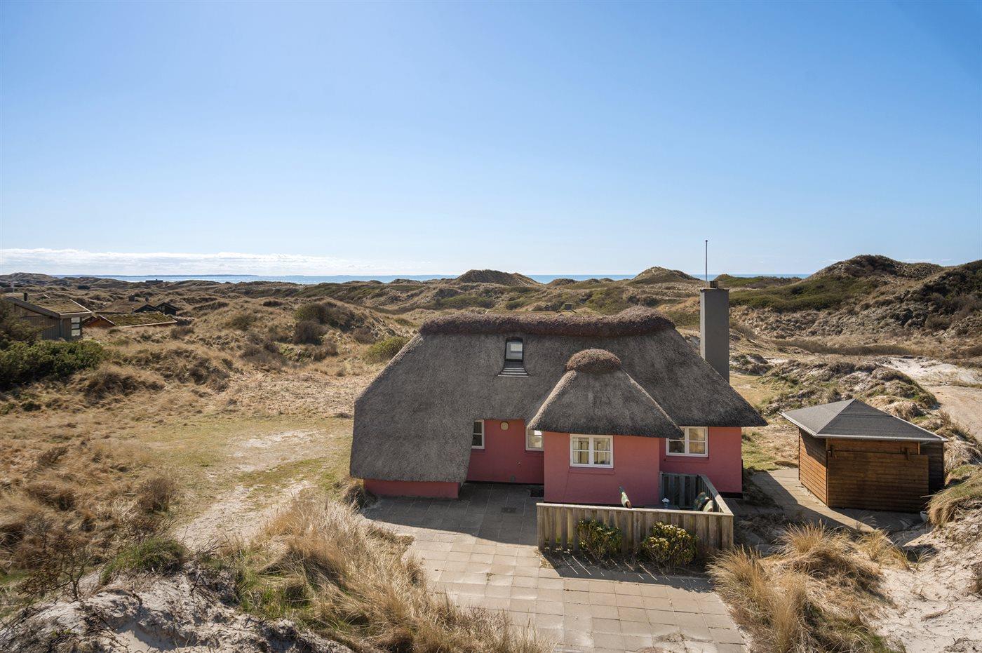 Charmerende sommerhus med stråtag beliggende i yderste klitrække, i det kuperede og naturskønne område Kettrup Bjerge, tæt på havet og dejlig badestrand. Huset er indrettet med adgang til hems, hvor 2 af sovepladserne befinder sig. Desuden er der udvendig indgang til det ene badeværelse.