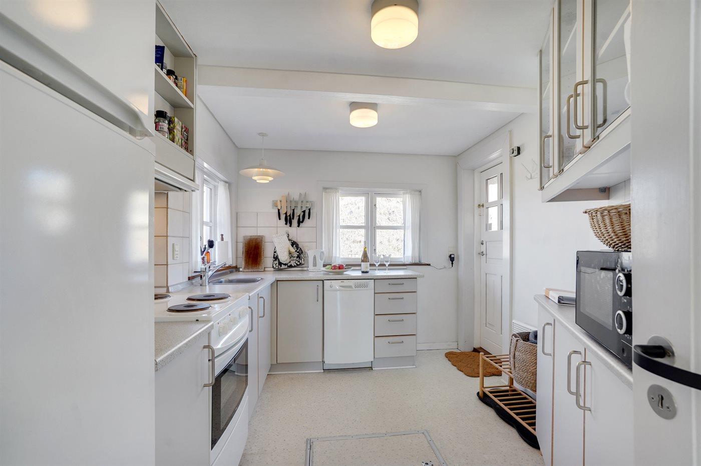 Køkkenet er udstyret med 1 køleskab. Der er 4 elkogeplader, varmluftovn, mikrobølgeovn samt opvaskemaskine.