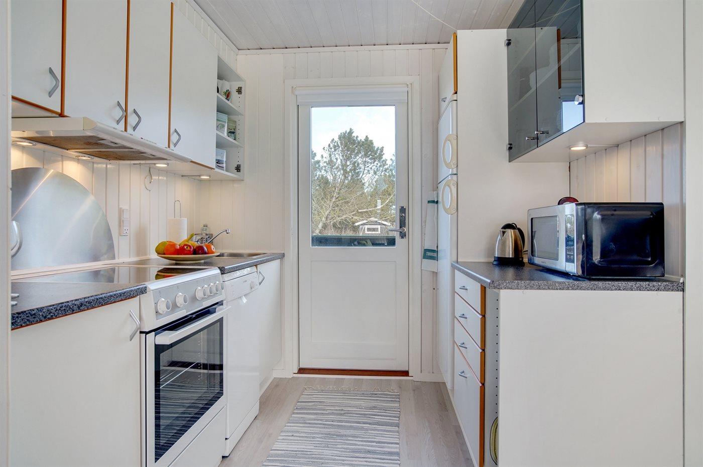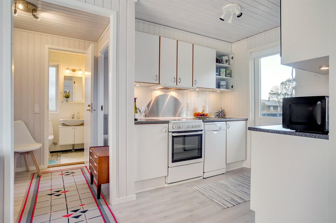 Køkkenet er udstyret med 1 køleskab. Der er 4 keramiske kogeplader, varmluftovn, mikrobølgeovn samt opvaskemaskine.