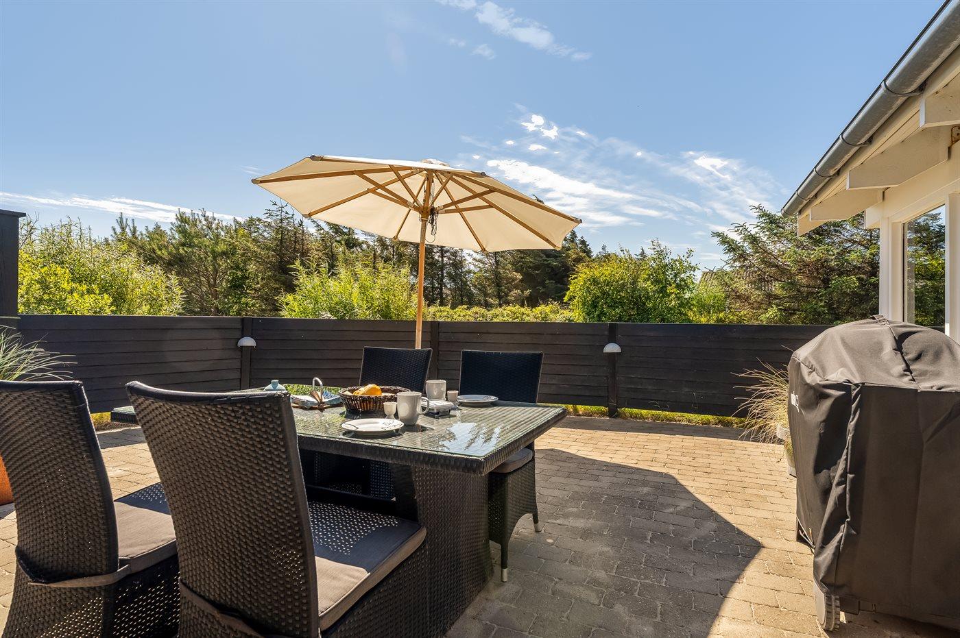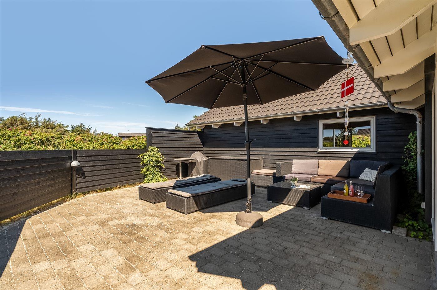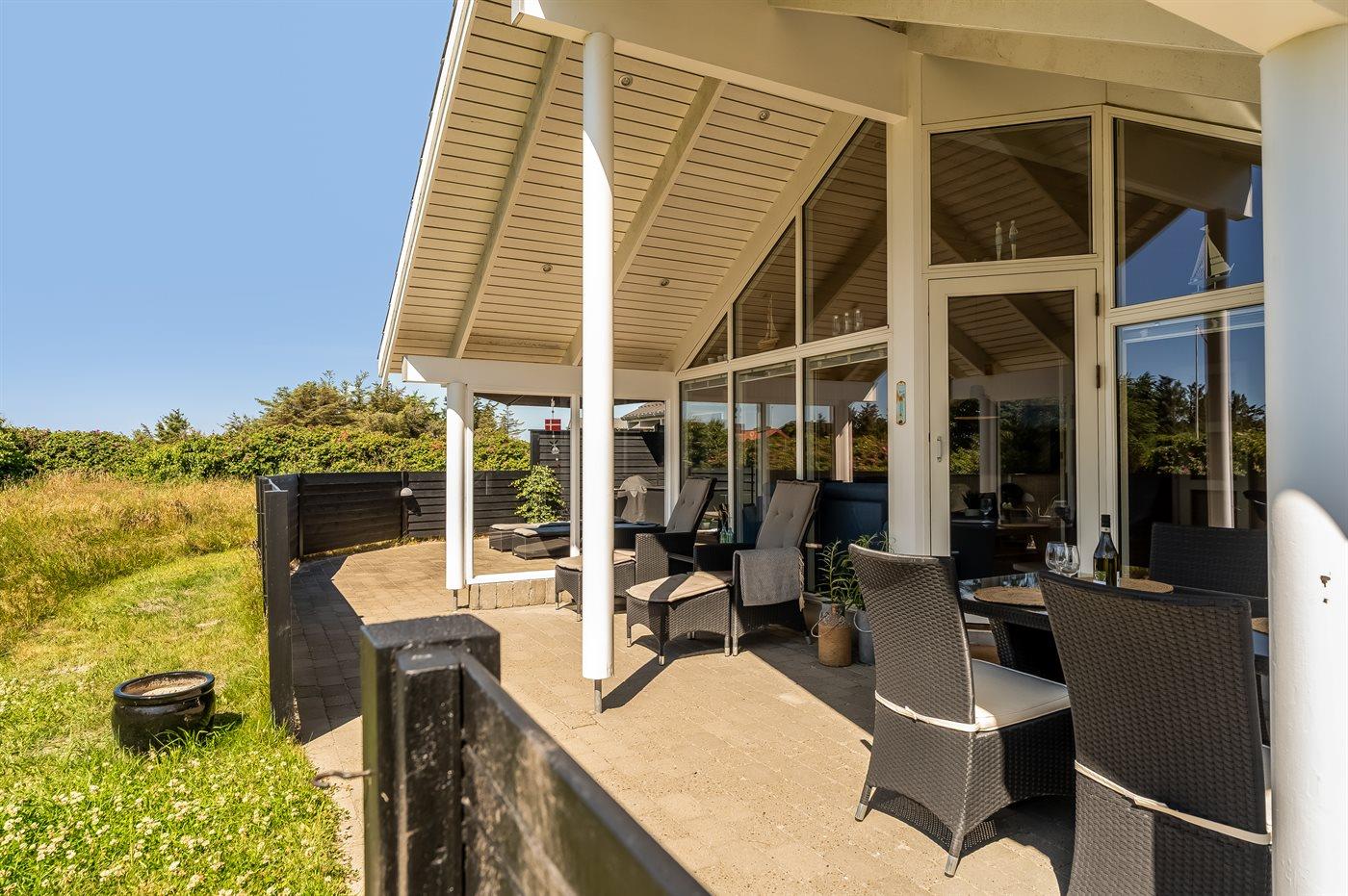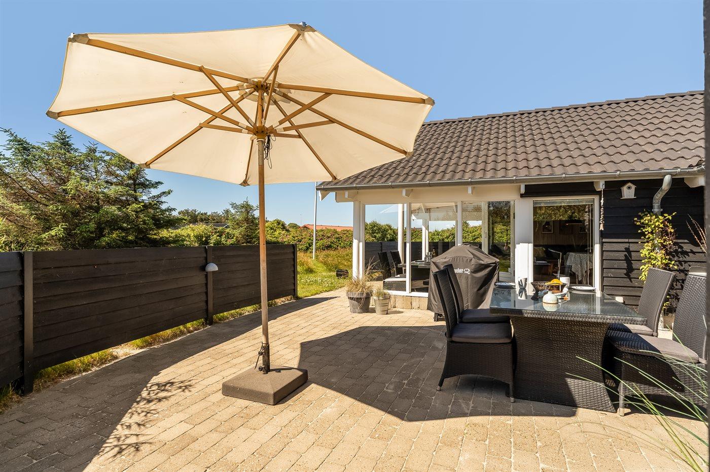 Ferieboligen er beliggende på en 1339 m² stor naturgrund. Der er 500 m til havet. Nærmeste forretning er beliggende i en afstand af 100 m. Til ferieboligen hører 60 m² terrasseareal. Desuden er der 20 m² overdækket terrasse. Der er redskabsrum. Grill til rådighed. Parkering ved ferieboligen.