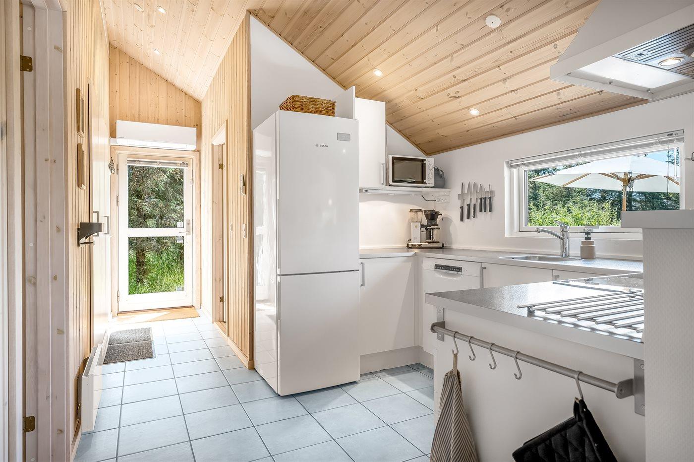 Køkkenet er udstyret med 1 køleskab. Der er 4 induktionskogeplader, varmluftovn, mikrobølgeovn samt opvaskemaskine.