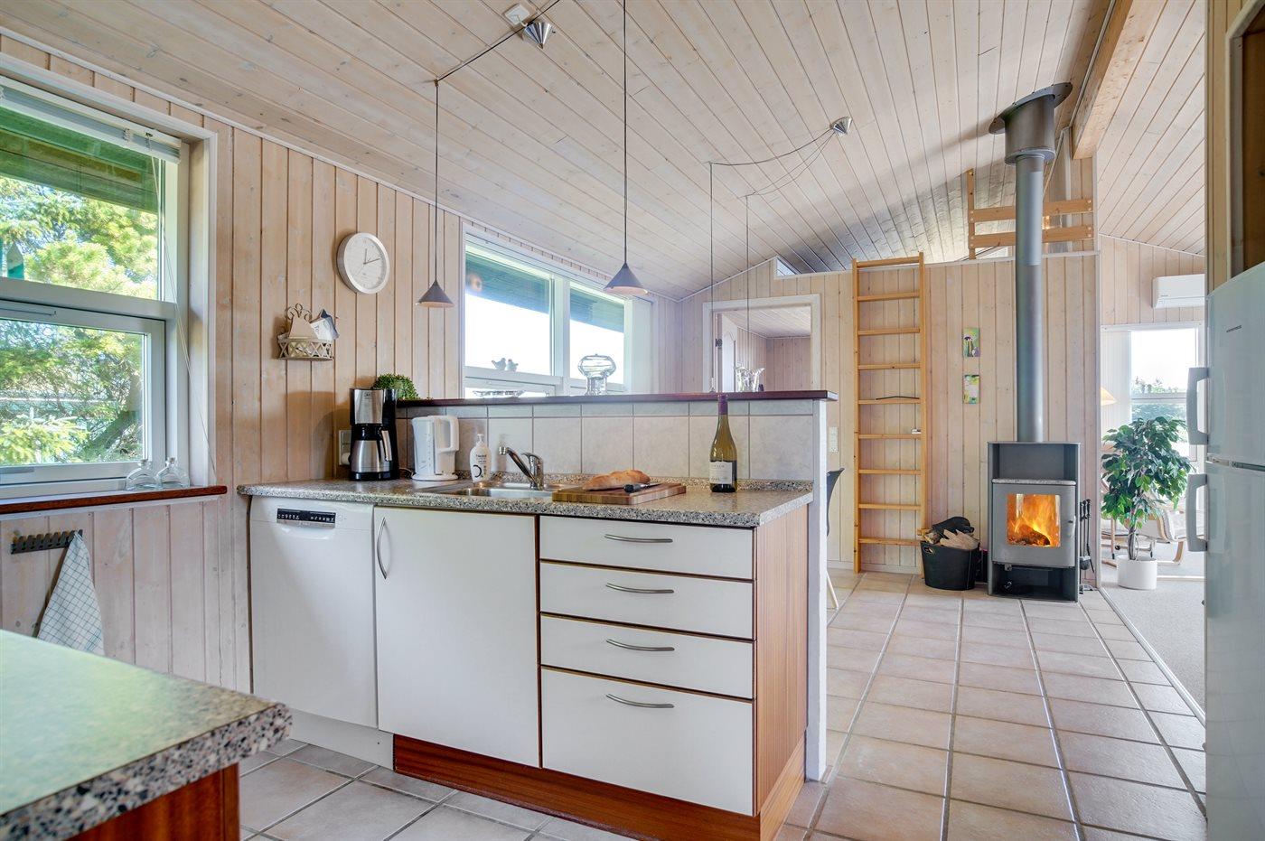 Køkkenet er udstyret med 1 køleskab. Der er 4 keramiske kogeplader, varmluftovn, mikrobølgeovn samt opvaskemaskine.