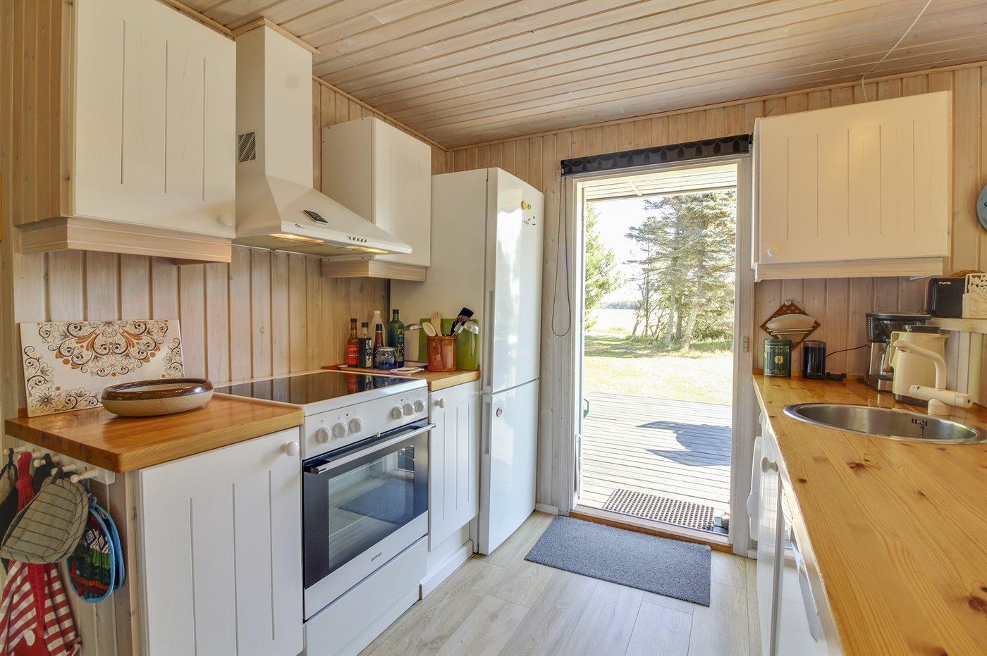Køkkenet er udstyret med 1 køleskab. Der er 4 keramiske kogeplader, varmluftovn, mikrobølgeovn samt opvaskemaskine.