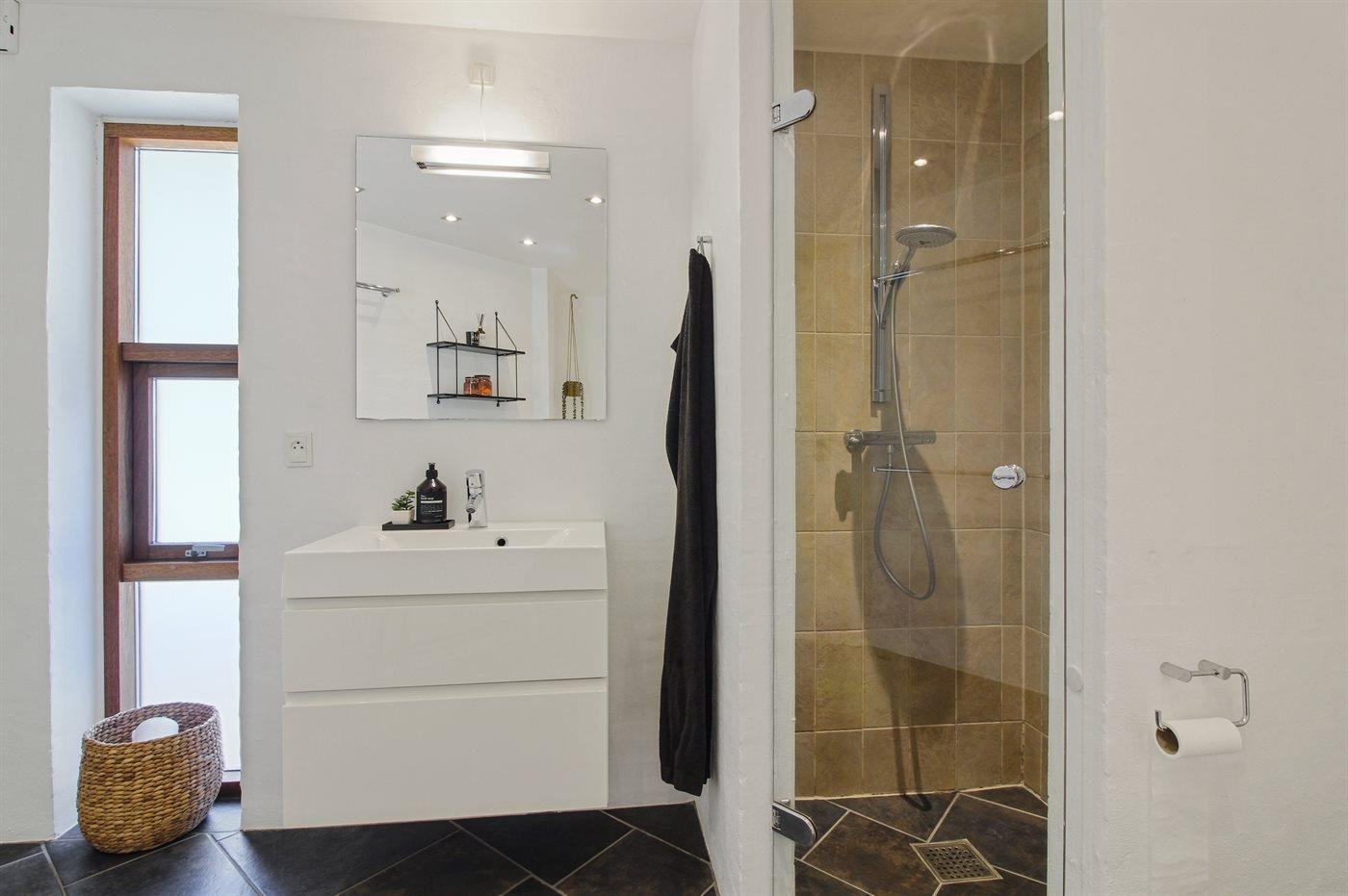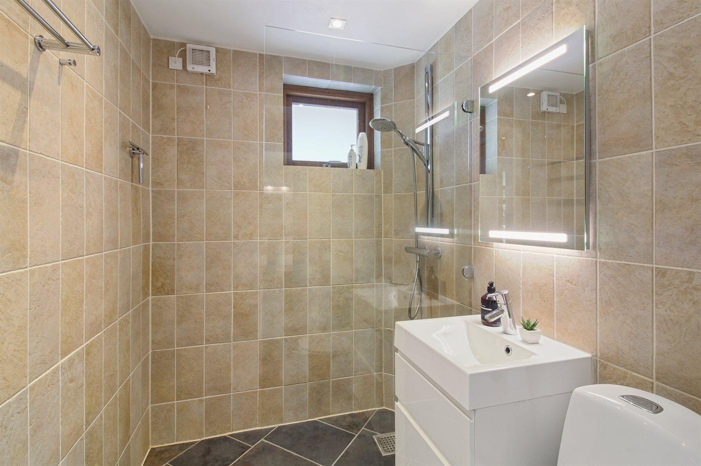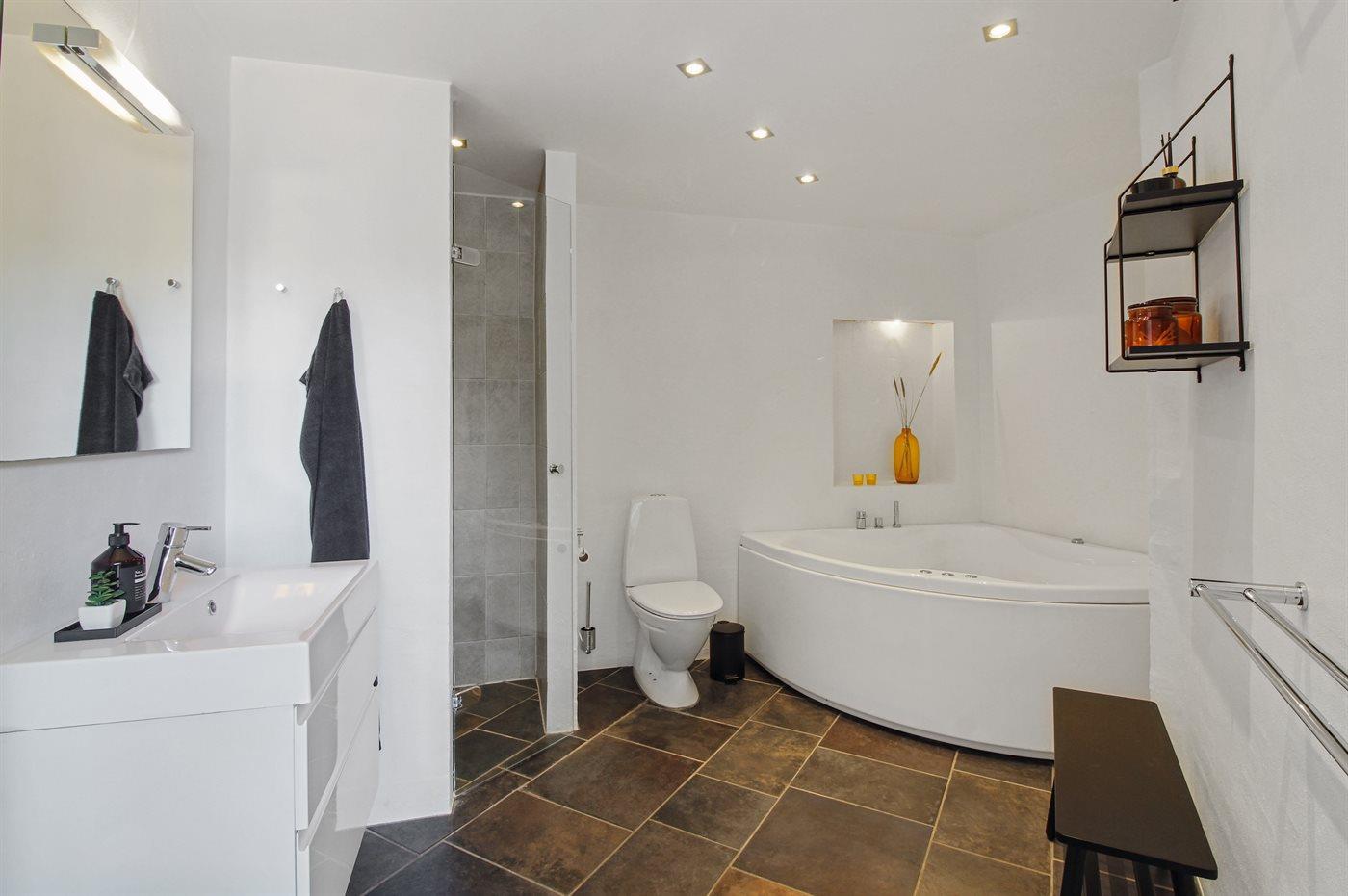 Der er 2 badeværelser med bruseniche og 2 toiletter. Der er gulvvarme på 2 badeværelser. I saunaen er der mulighed for afslapning.