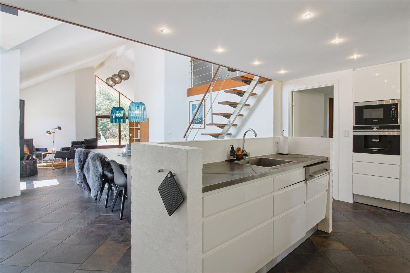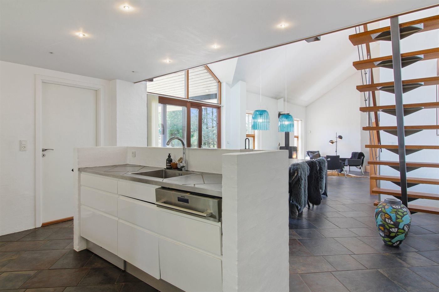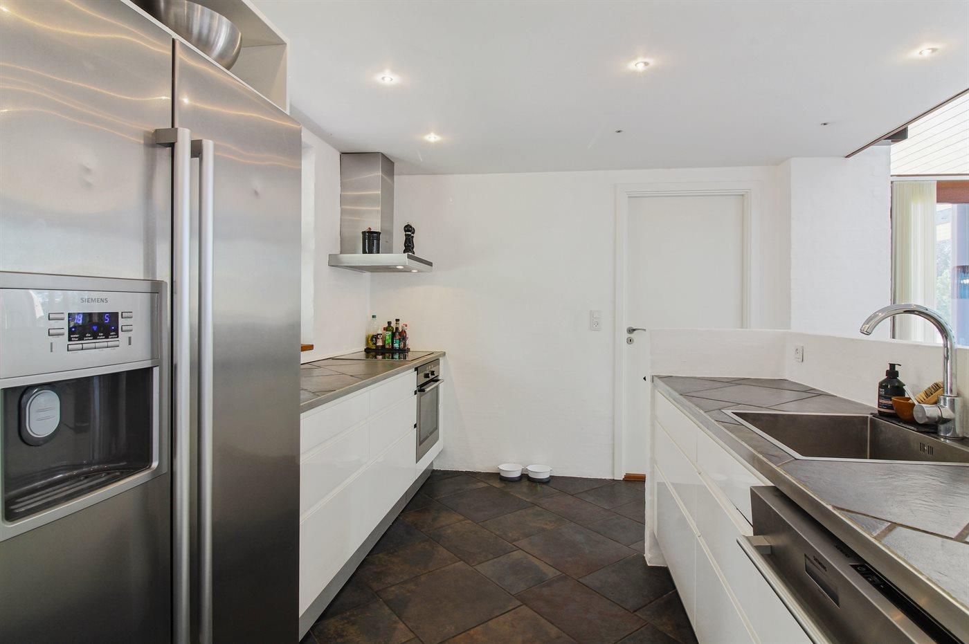 Køkkenet er udstyret med 1 amerikansk køleskab. Der er 4 keramiske kogeplader, varmluftovn, mikrobølgeovn, espressomaskine samt opvaskemaskine.