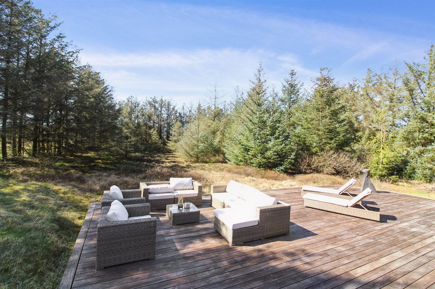 Ferieboligen er beliggende på en 3527 m² stor naturgrund. Der er 300 m til havet. Nærmeste forretning er beliggende i en afstand af 1200 m. Der er en golfbane i en afstand af 6300 m. Til ferieboligen hører 285 m² terrasseareal. Desuden er der 25 m² overdækket terrasse. Gasgrill står til rådighed. Parkering ved ferieboligen.