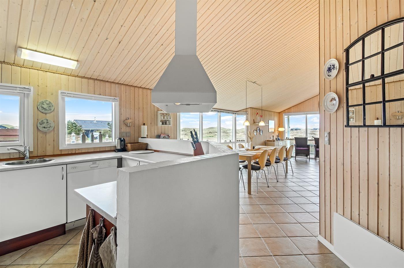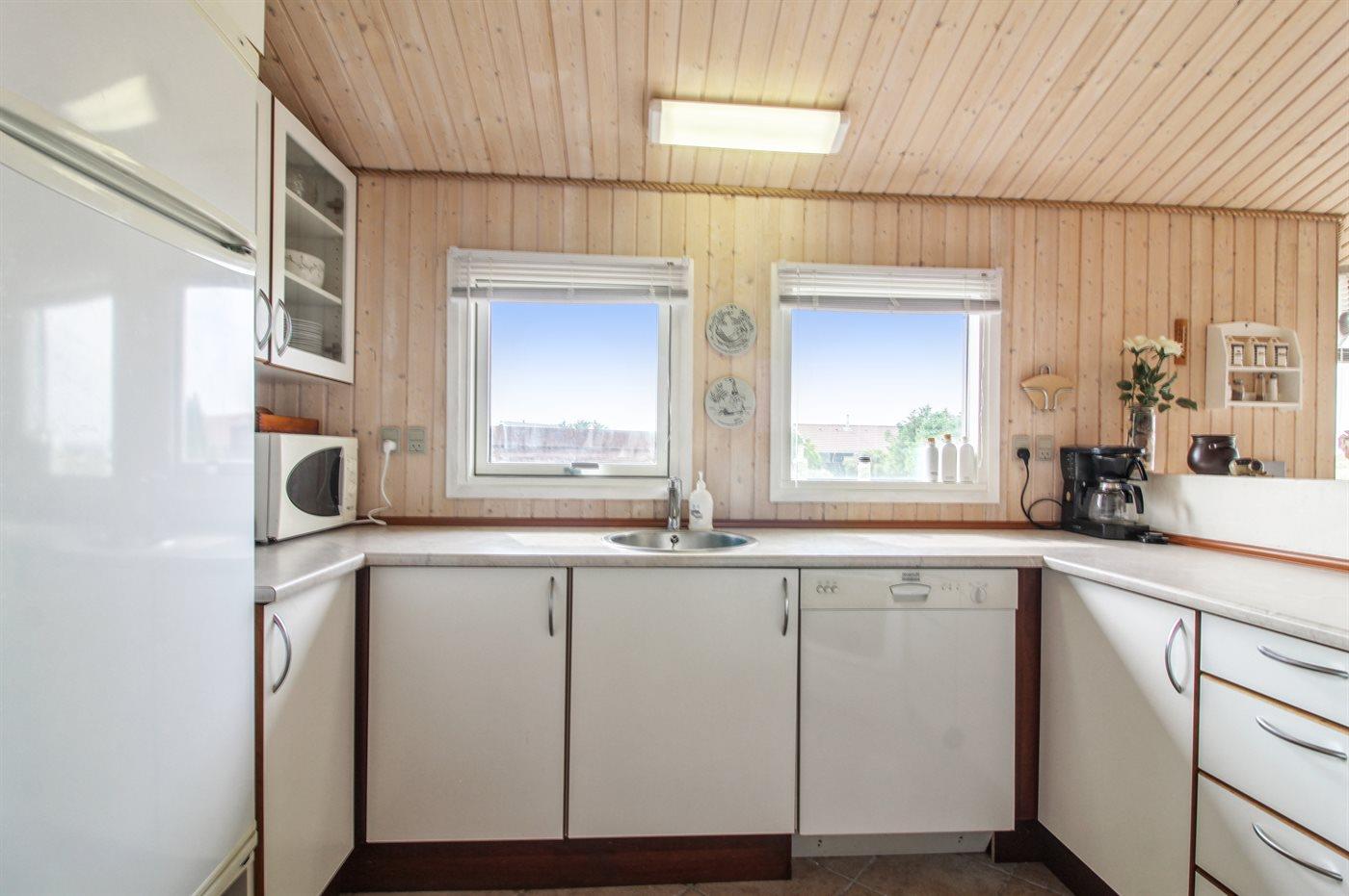 Køkkenet er udstyret med 1 køleskab. Der er 4 keramiske kogeplader, varmluftovn, mikrobølgeovn samt opvaskemaskine.