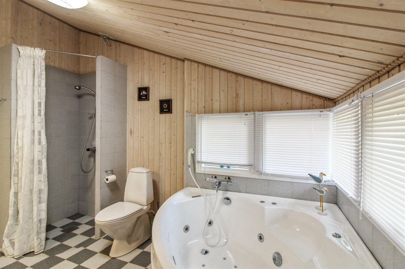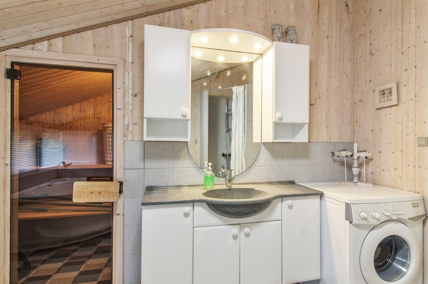 Der er 1 badeværelse med bruseniche og 2 toiletter, heraf 1 gæstetoilet. Der er gulvvarme på 1 badeværelse. I saunaen er der mulighed for afslapning.