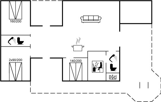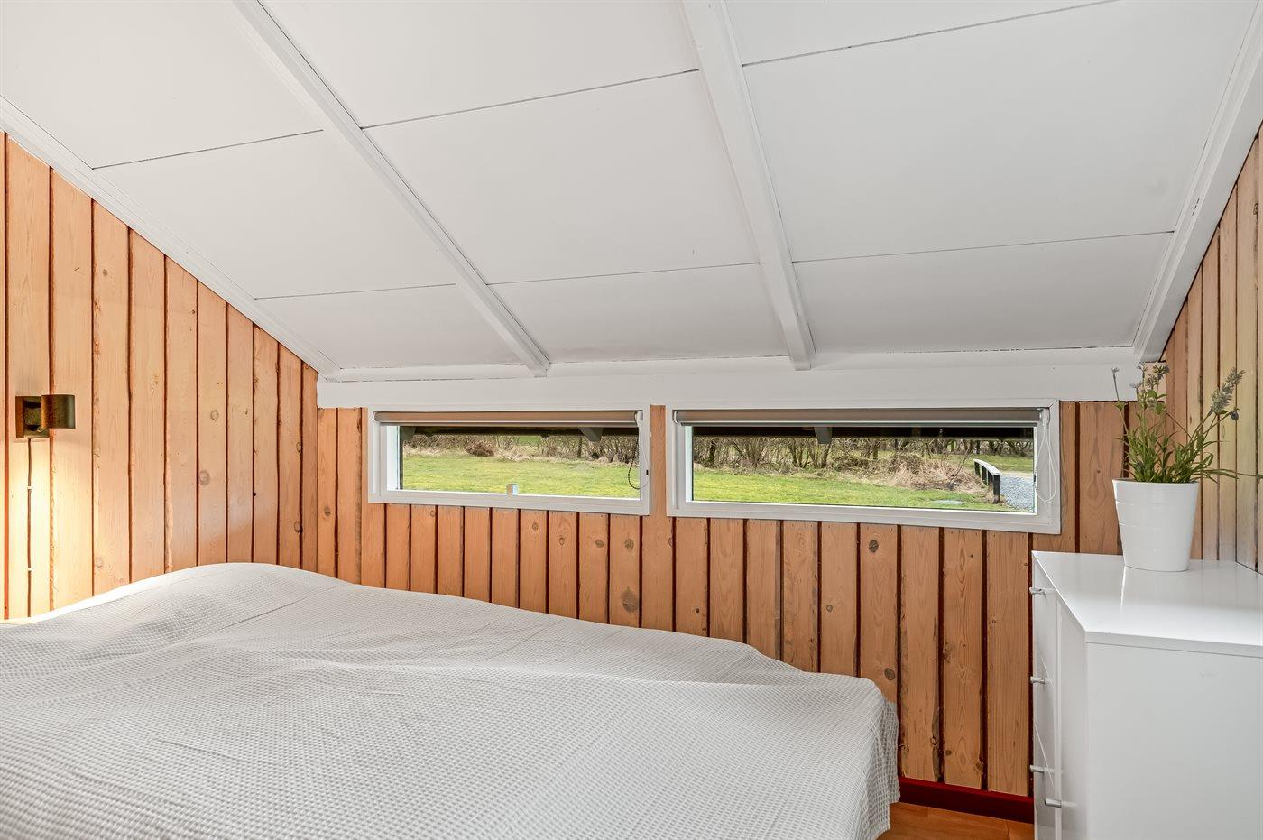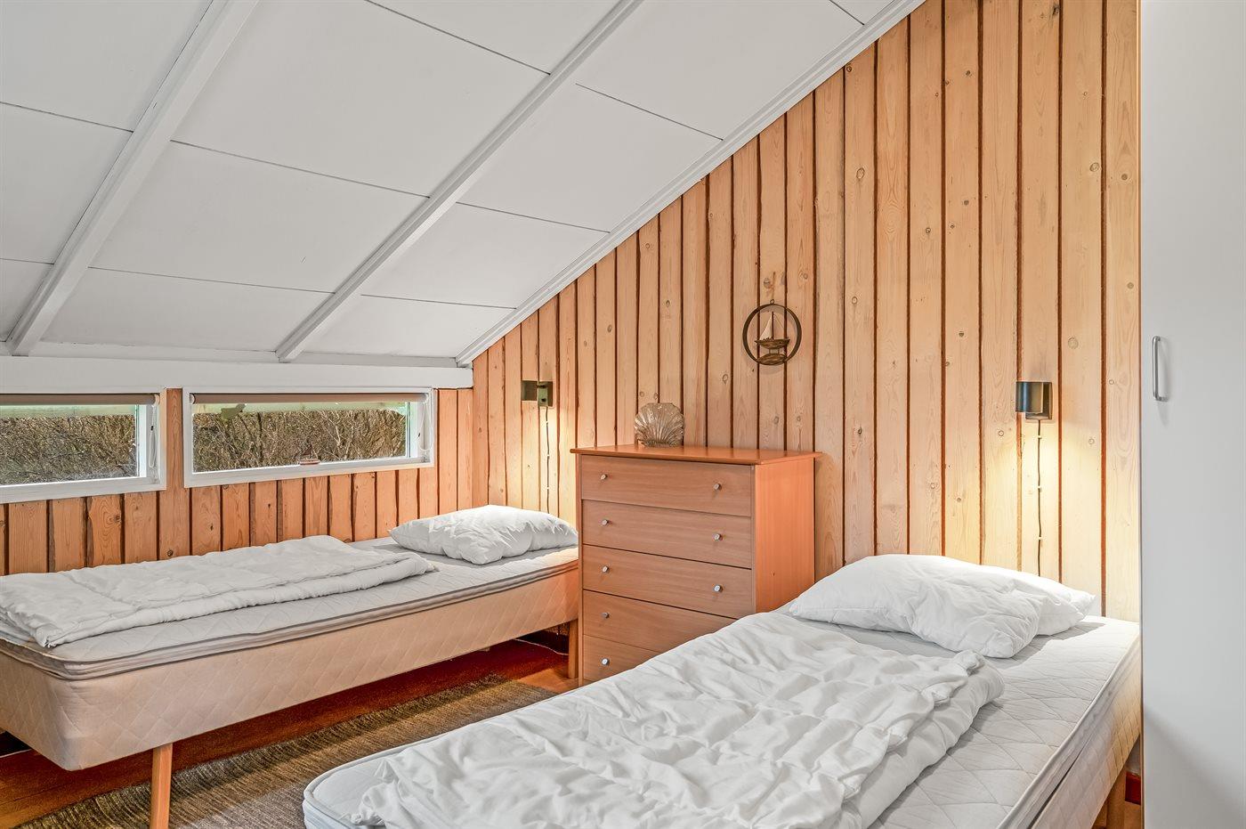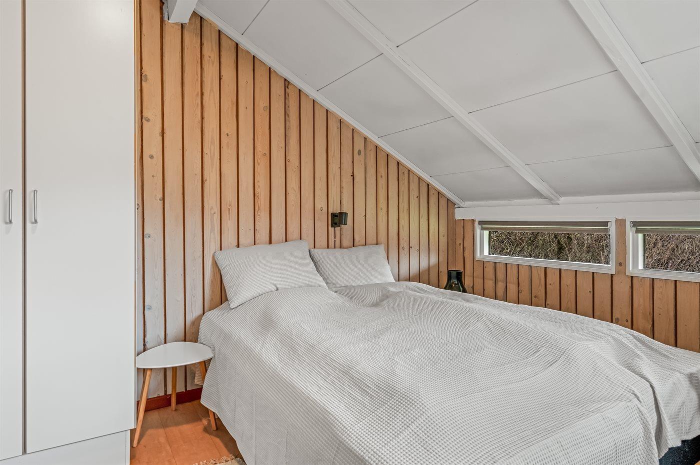 Der er i alt 3 soveværelser. Sovepladserne fordeler sig på: 4 sovepladser i dobbeltsenge. 2 sovepladser i enkeltsenge. Derudover er der 1 stk. barneseng.