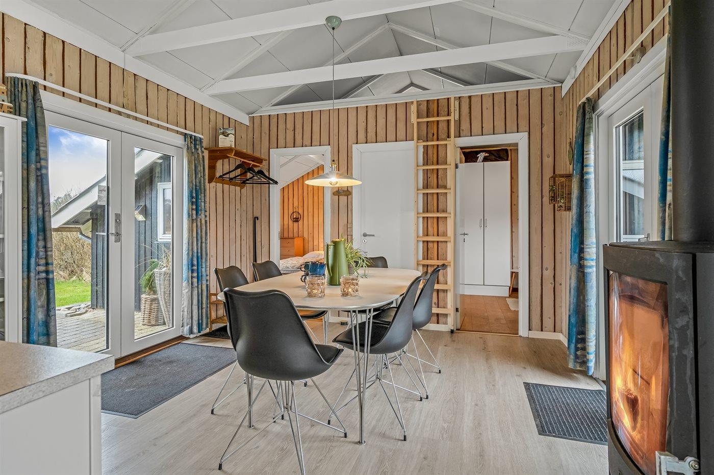Sommerhusets store vinduespartier giver et dejligt lysindfald. Køkken og stue danner sammen et stort opholdsrum til hygge og skønt samvær. I huset er brændeovn til de køligere aftner, og i det ene badeværelser finder du spa og sauna.