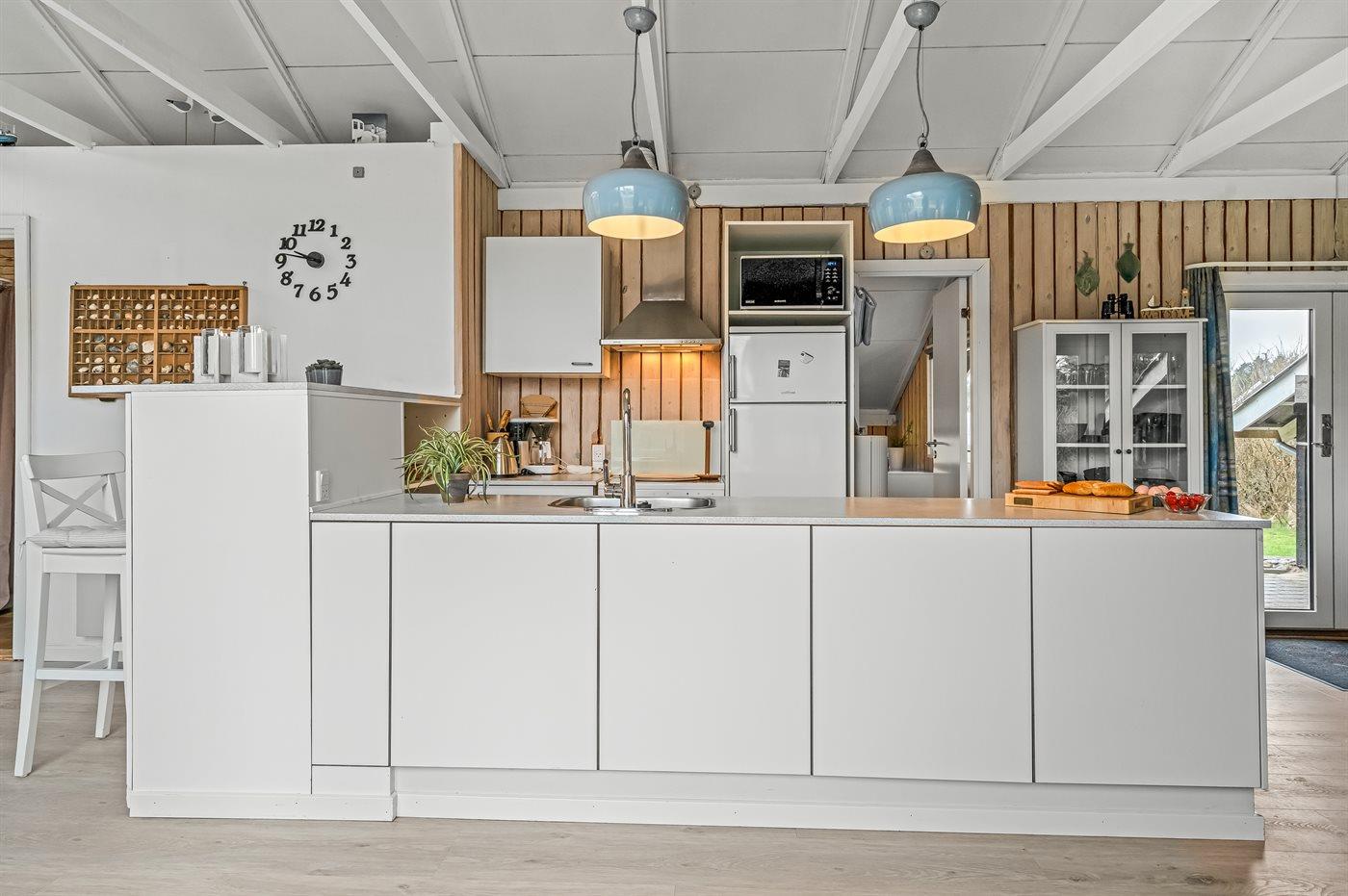 Køkkenet er udstyret med 1 køleskab. Der er 4 induktionskogeplader, varmluftovn, mikrobølgeovn samt opvaskemaskine.