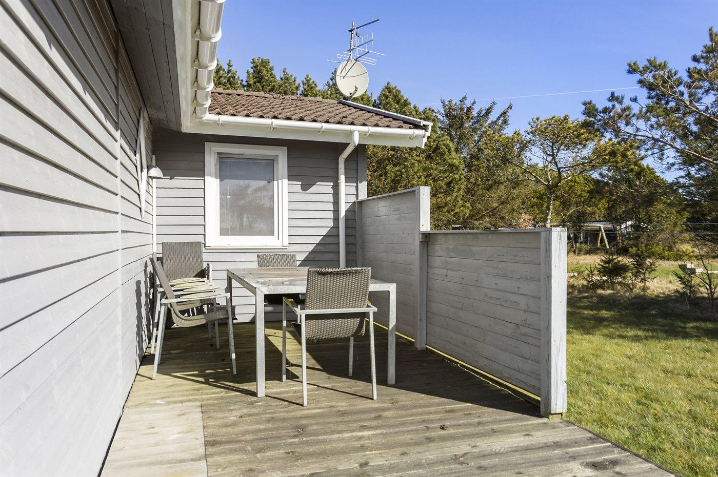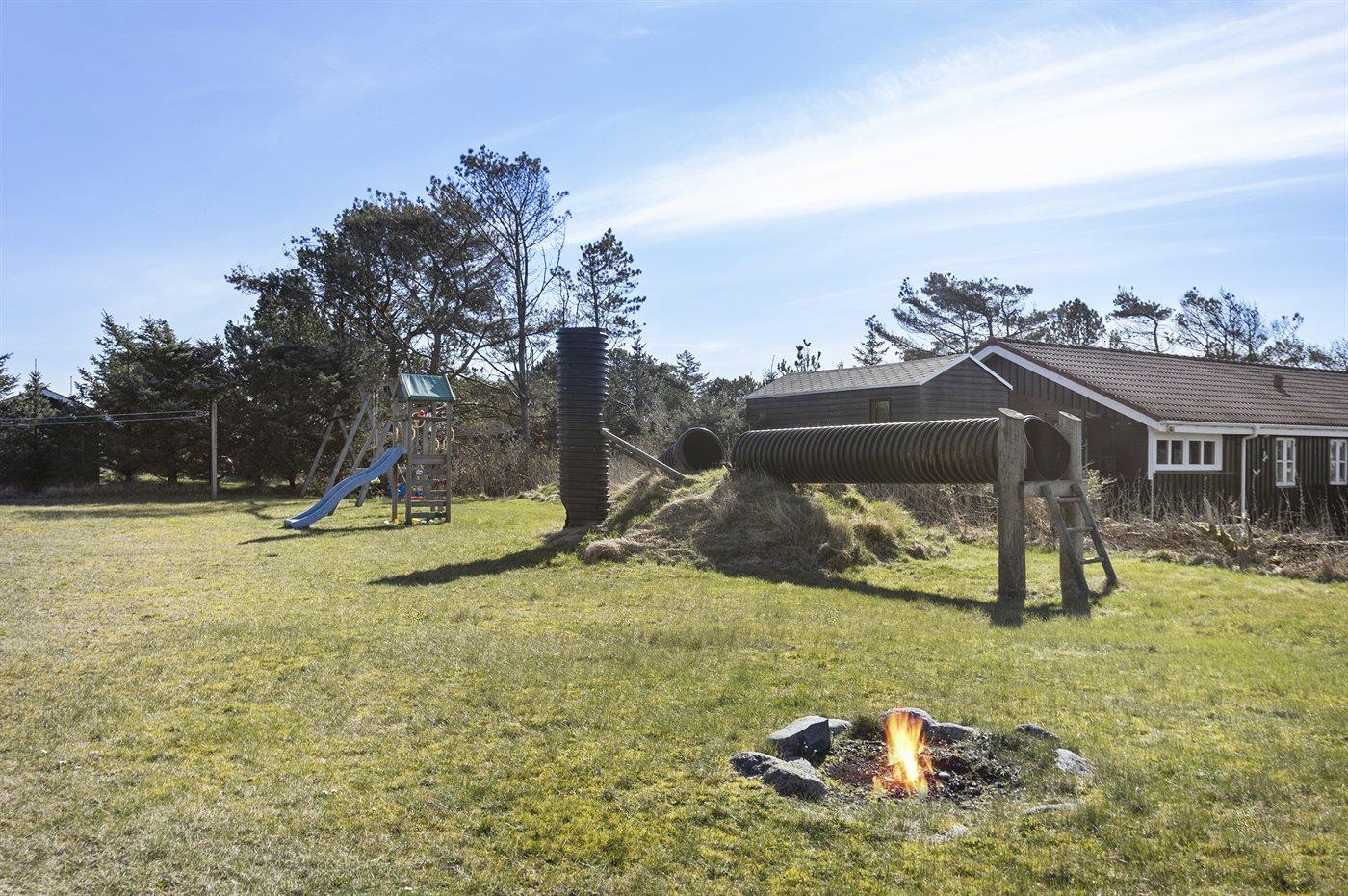 Ferieboligen er beliggende på en 1212 m² stor naturgrund. Grunden er indhegnet. Der er 1200 m til havet. Nærmeste forretning er beliggende i en afstand af 3500 m. Til ferieboligen hører åbent terrasseareal. Gynge. Legetårn. Rutchebane. Bålsted. Udendørs bruser. Grill til rådighed. Der er carport til rådighed. Der er installeret stik til opladning af elbil. Type 2 stik. Med 11 kW ladeeffekt. Parkering ved ferieboligen.