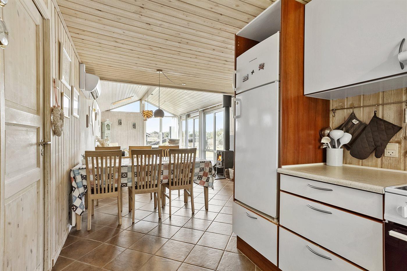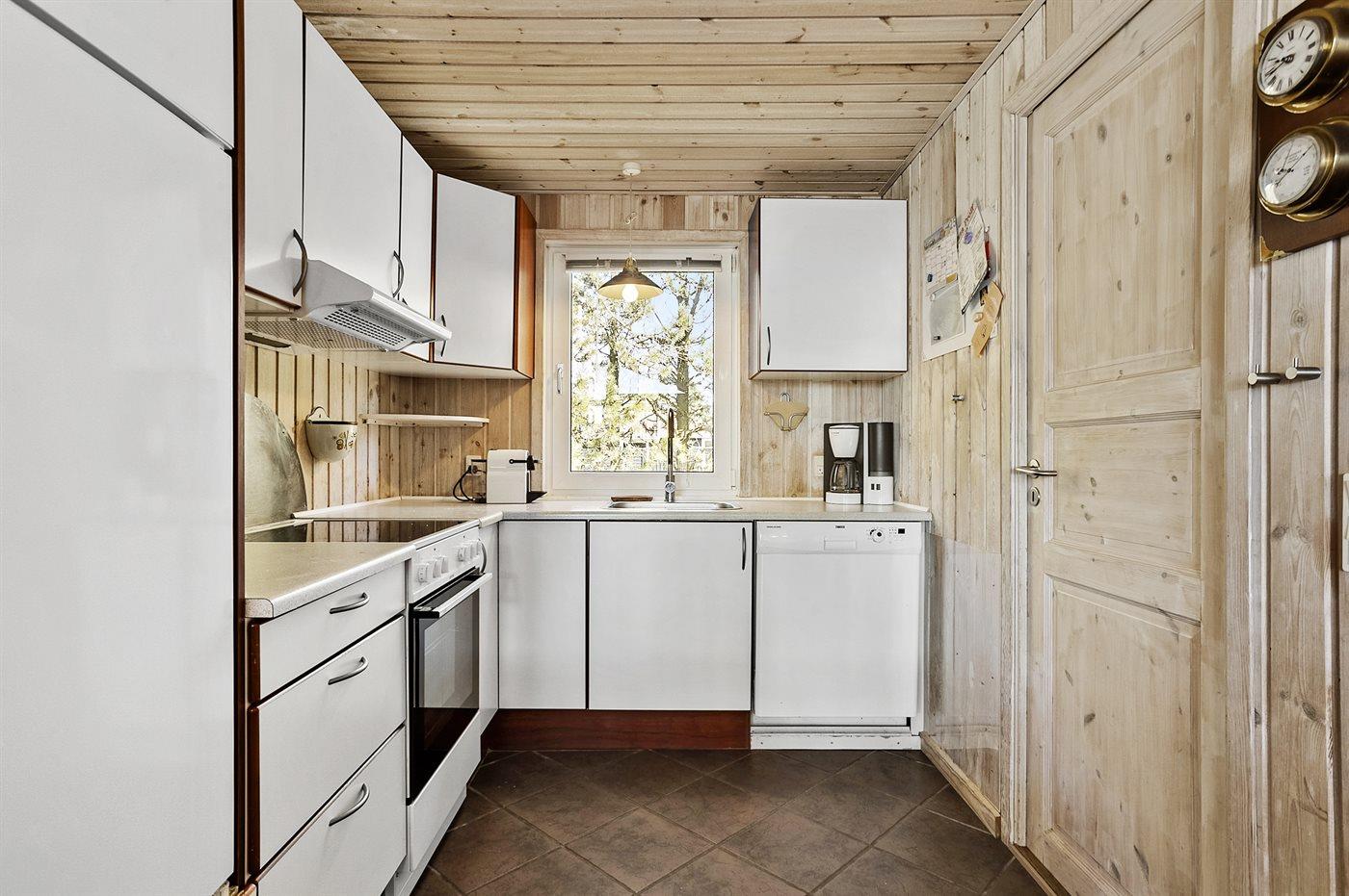 Køkkenet er udstyret med 1 køleskab. Der er 4 keramiske kogeplader, varmluftovn, mikrobølgeovn samt opvaskemaskine.
