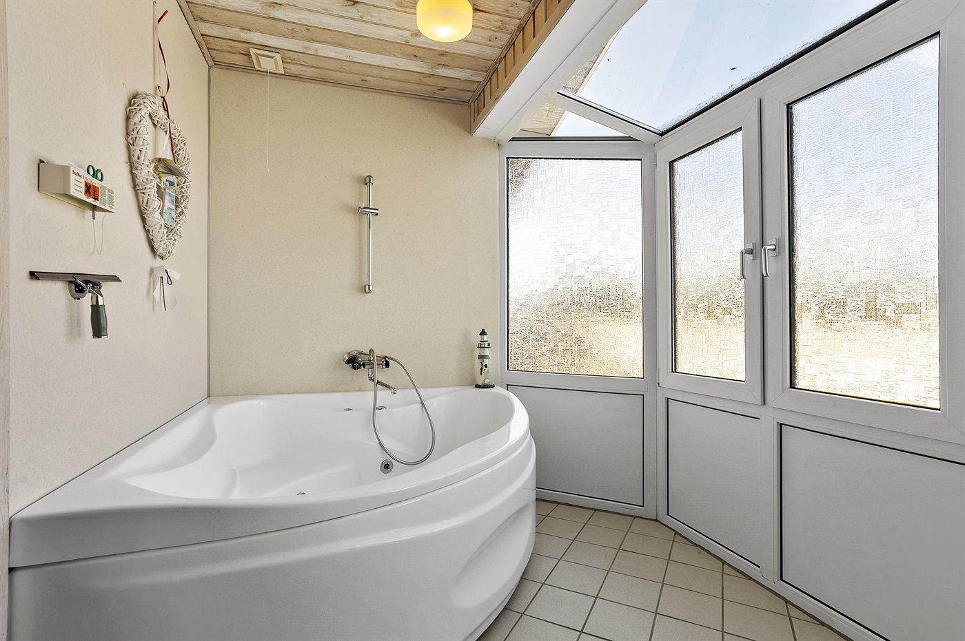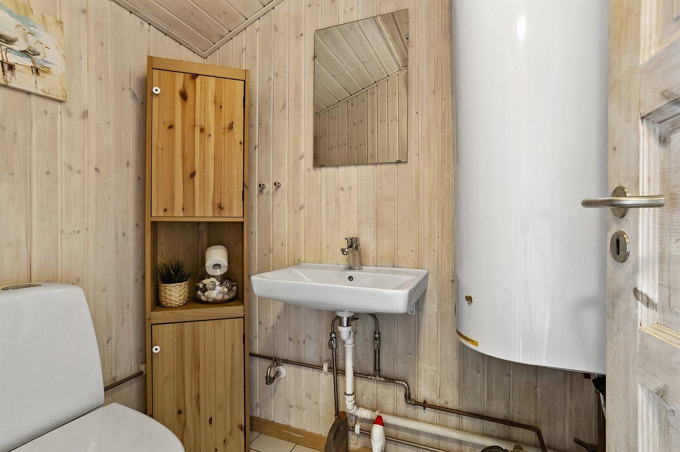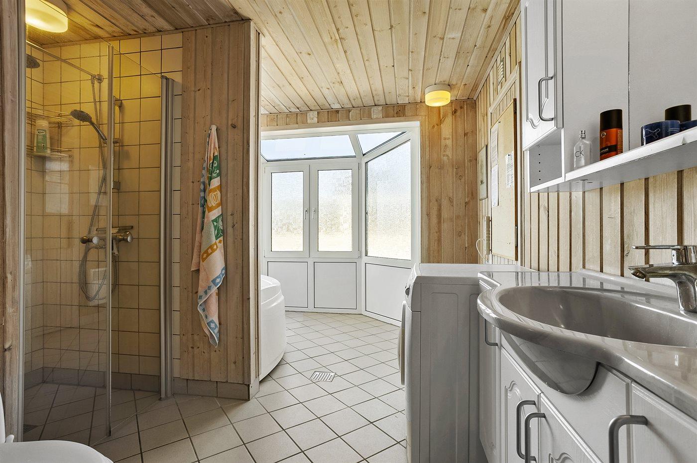 Der er 1 badeværelse med bruseniche og 2 toiletter, heraf 1 gæstetoilet. Der er gulvvarme på 1 badeværelse. Der er gulvvarme på gæstetoilettet. I saunaen er der mulighed for afslapning.