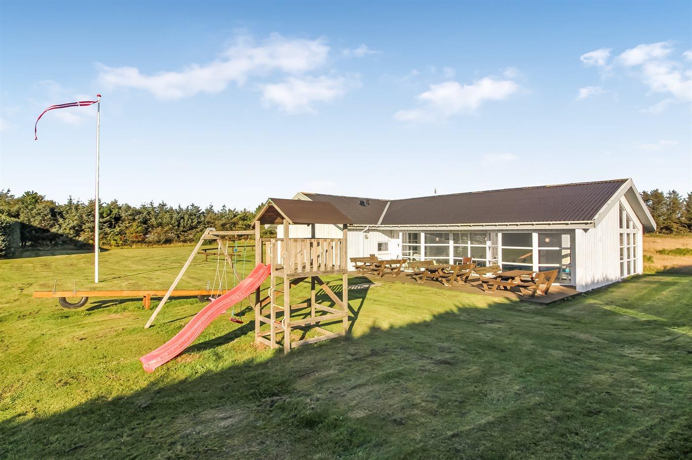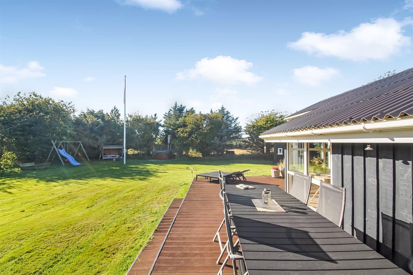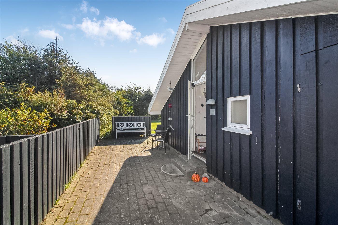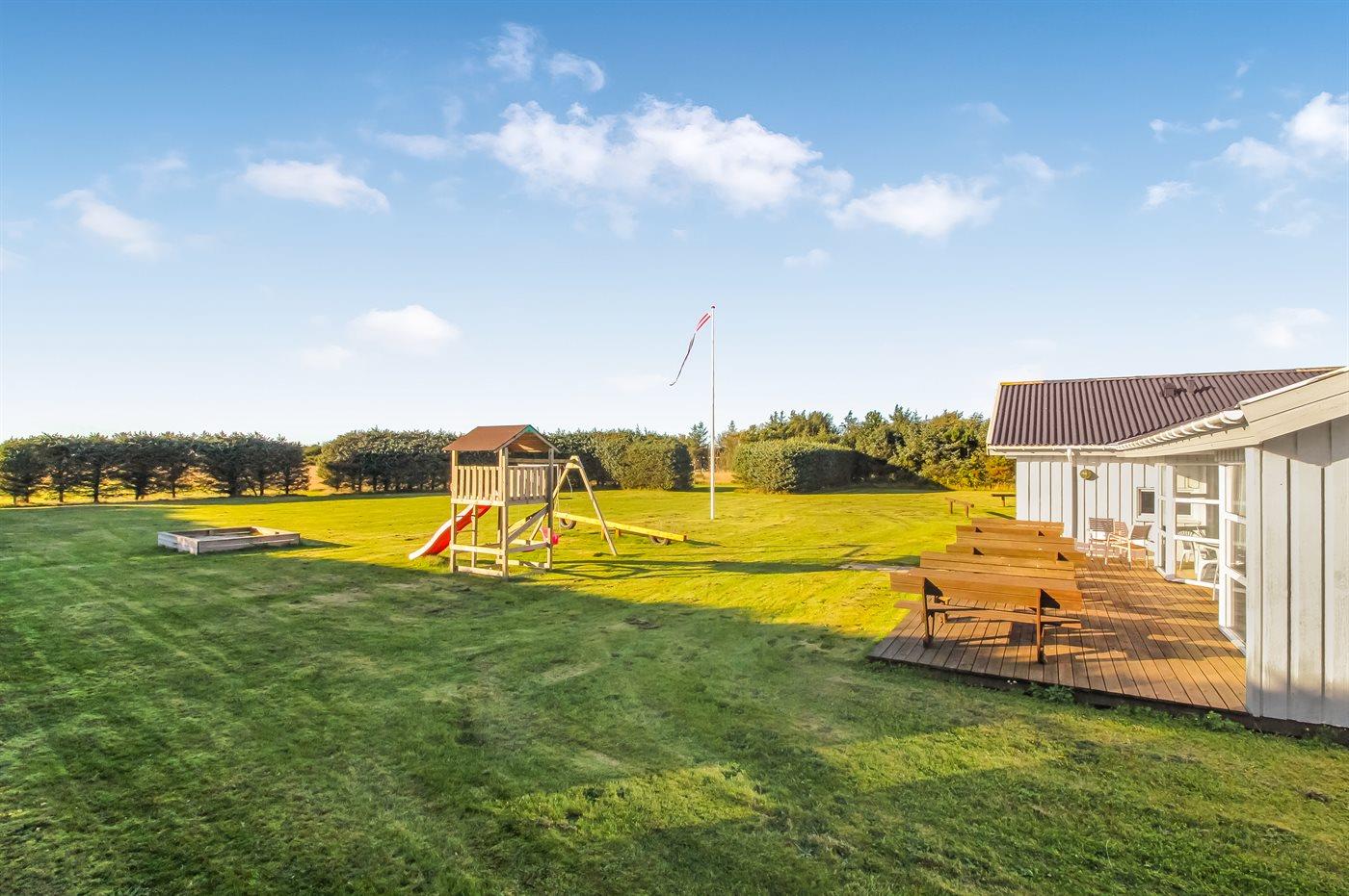 Ferieboligen er beliggende på en 1320 m² stor havegrund. Der er 900 m til havet. Nærmeste forretning er beliggende i en afstand af 1000 m. Til ferieboligen hører åbent terrasseareal. Desuden er der overdækket terrasse. Gynge. Legetårn. Rutchebane. Fodboldmål. Der ligger en legeplads i en afstand af 150 m. Bålsted. Shelter. Udendørs bruser. Grill til rådighed. Parkering ved ferieboligen.