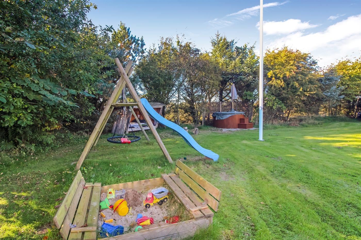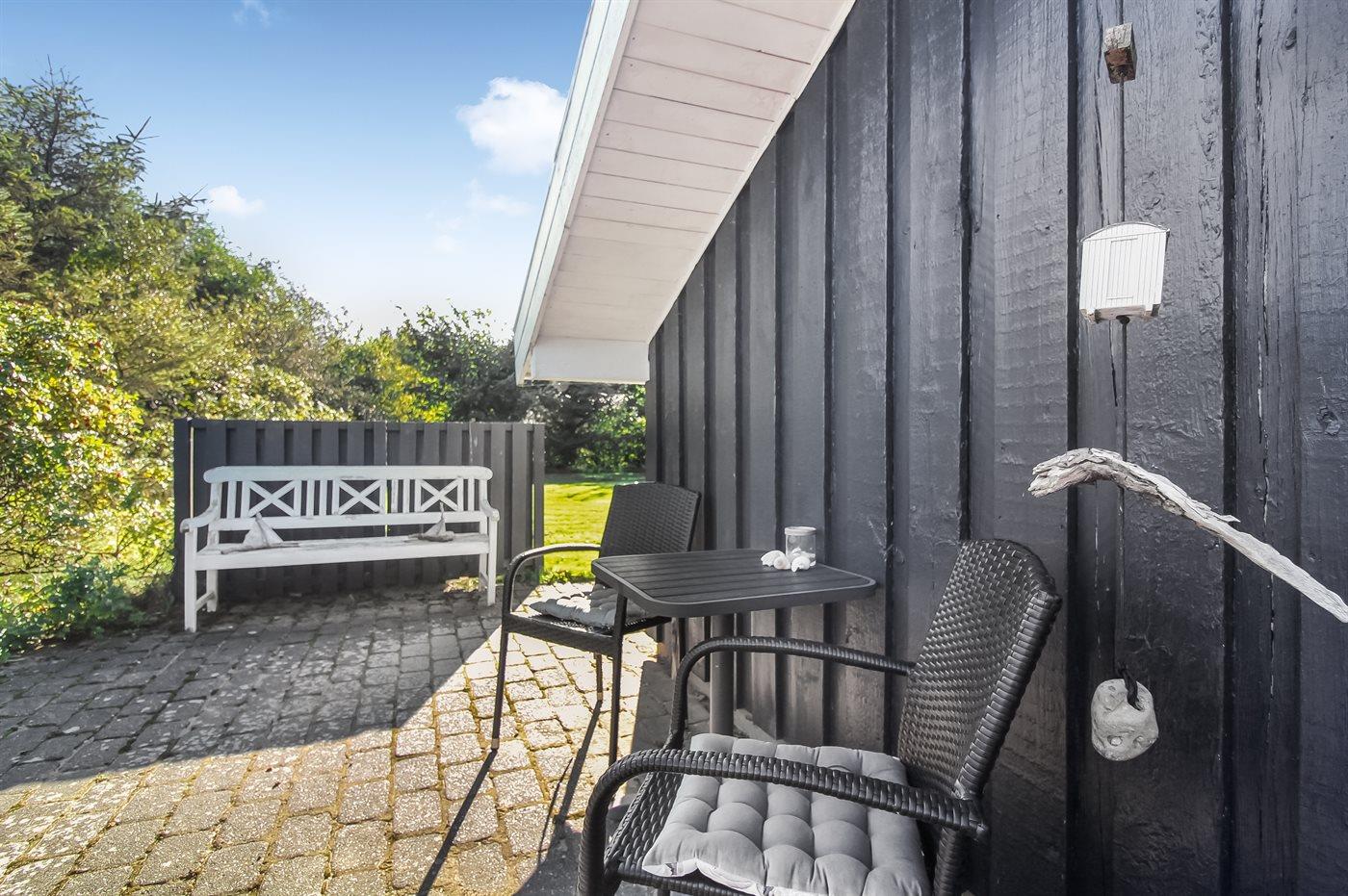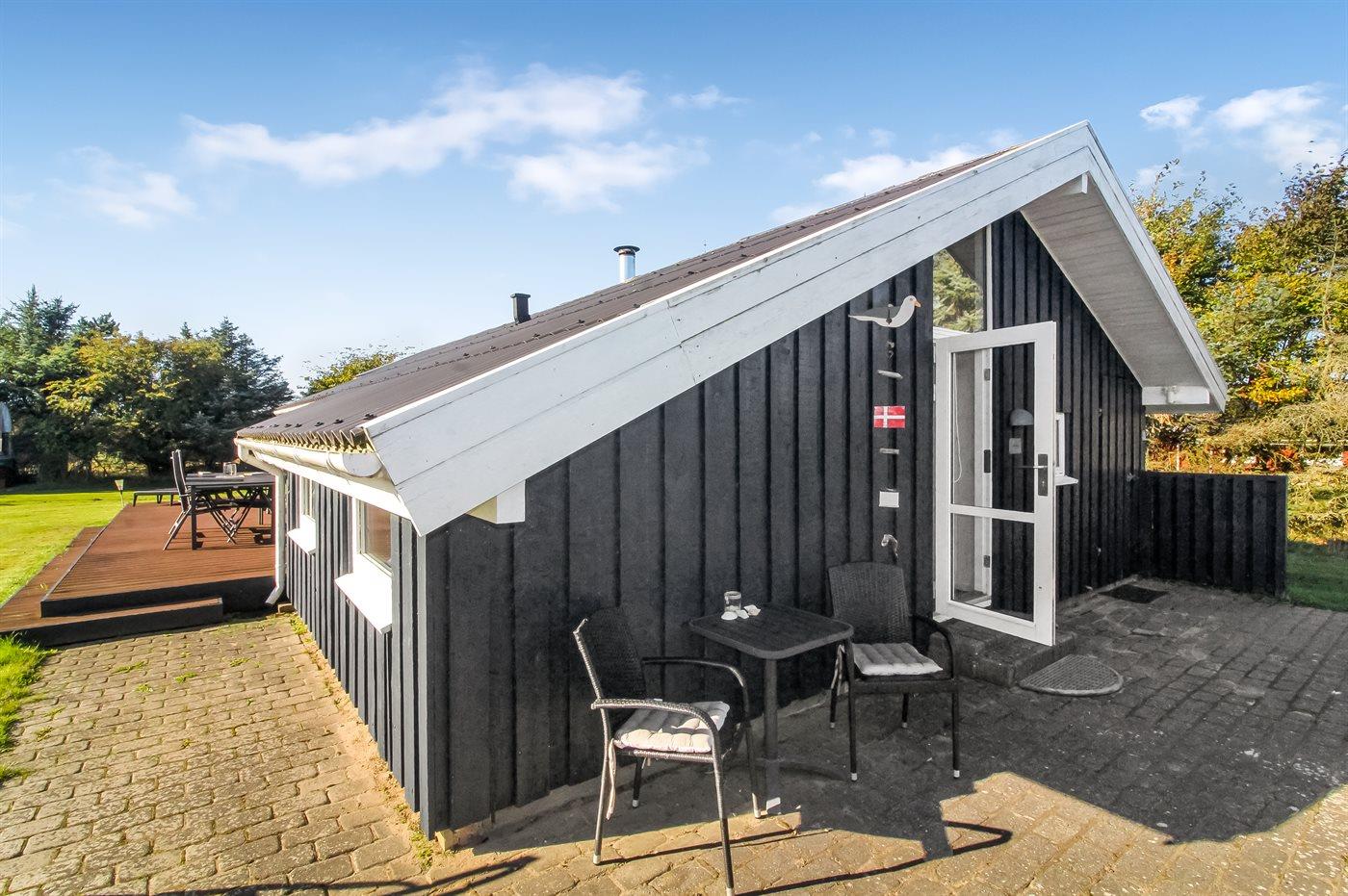 Ferieboligen er beliggende på en 1320 m² stor havegrund. Der er 900 m til havet. Nærmeste forretning er beliggende i en afstand af 1000 m. Til ferieboligen hører åbent terrasseareal. Desuden er der overdækket terrasse. Gynge. Legetårn. Rutchebane. Fodboldmål. Der ligger en legeplads i en afstand af 150 m. Bålsted. Shelter. Udendørs bruser. Grill til rådighed. Parkering ved ferieboligen.