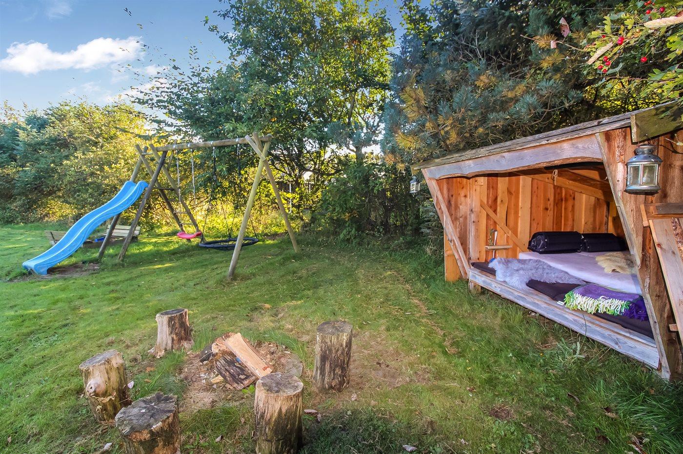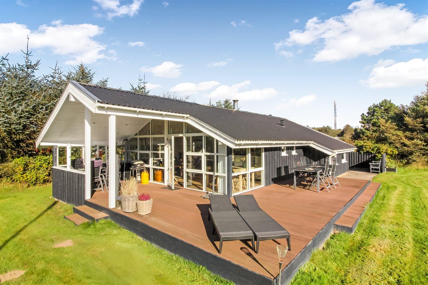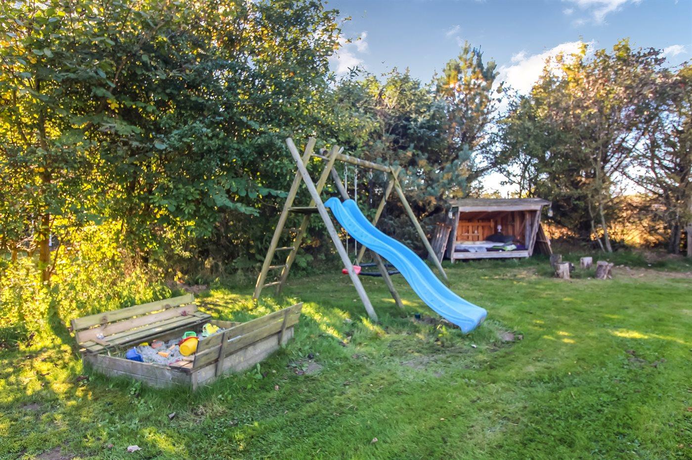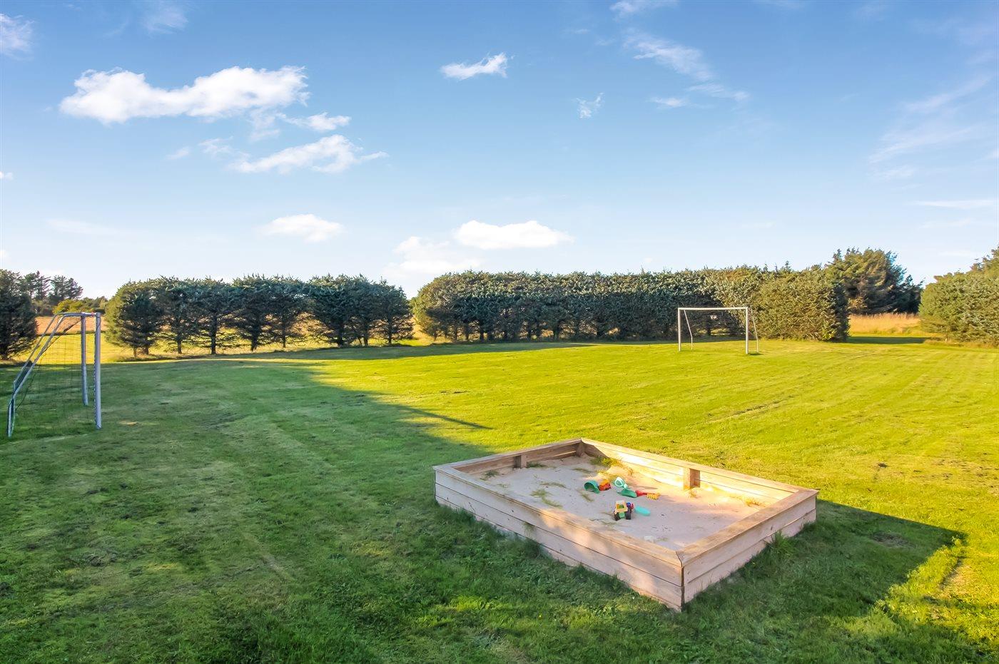 Ferieboligen er beliggende på en 1320 m² stor havegrund. Der er 900 m til havet. Nærmeste forretning er beliggende i en afstand af 1000 m. Til ferieboligen hører åbent terrasseareal. Desuden er der overdækket terrasse. Gynge. Legetårn. Rutchebane. Fodboldmål. Der ligger en legeplads i en afstand af 150 m. Bålsted. Shelter. Udendørs bruser. Grill til rådighed. Parkering ved ferieboligen.