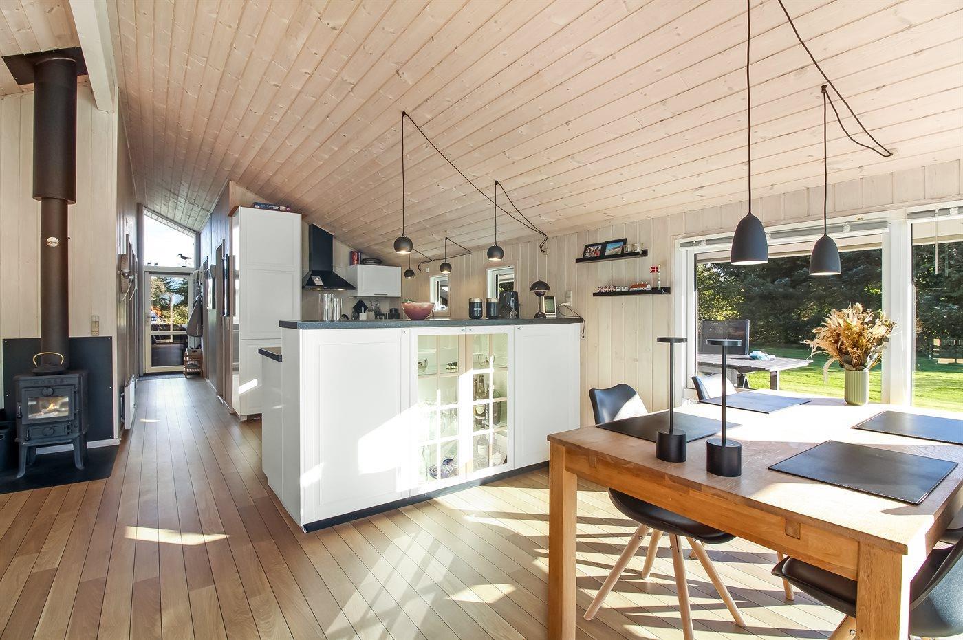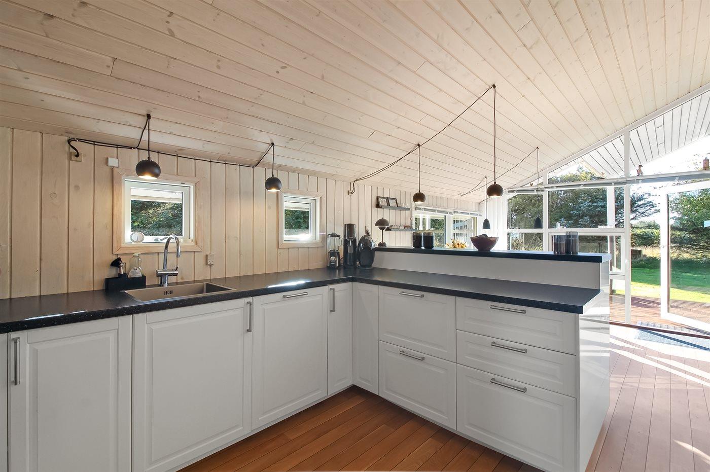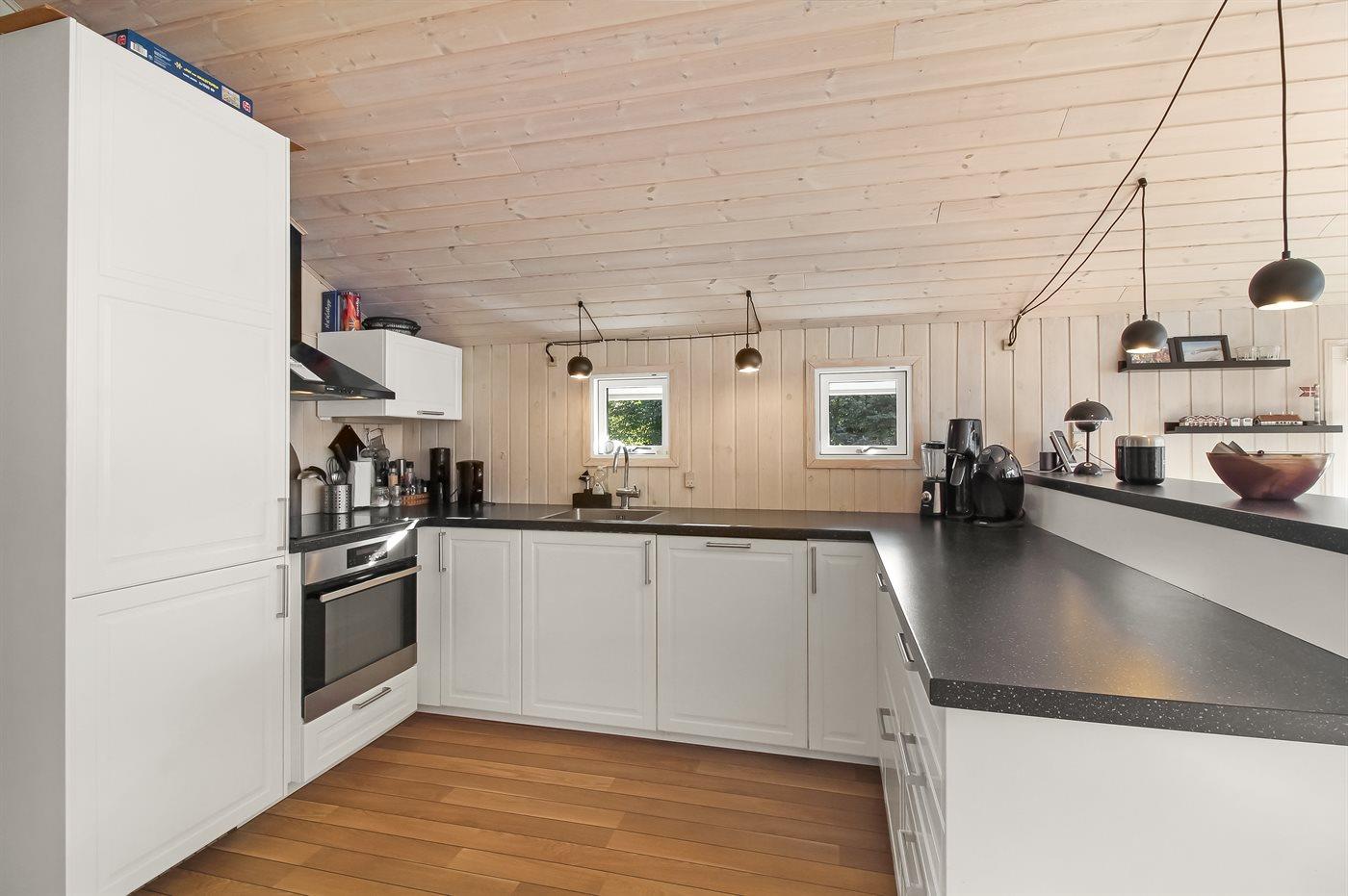 Køkkenet er udstyret med 1 køleskab. Der er 4 induktionskogeplader, varmluftovn, mikrobølgeovn samt opvaskemaskine.