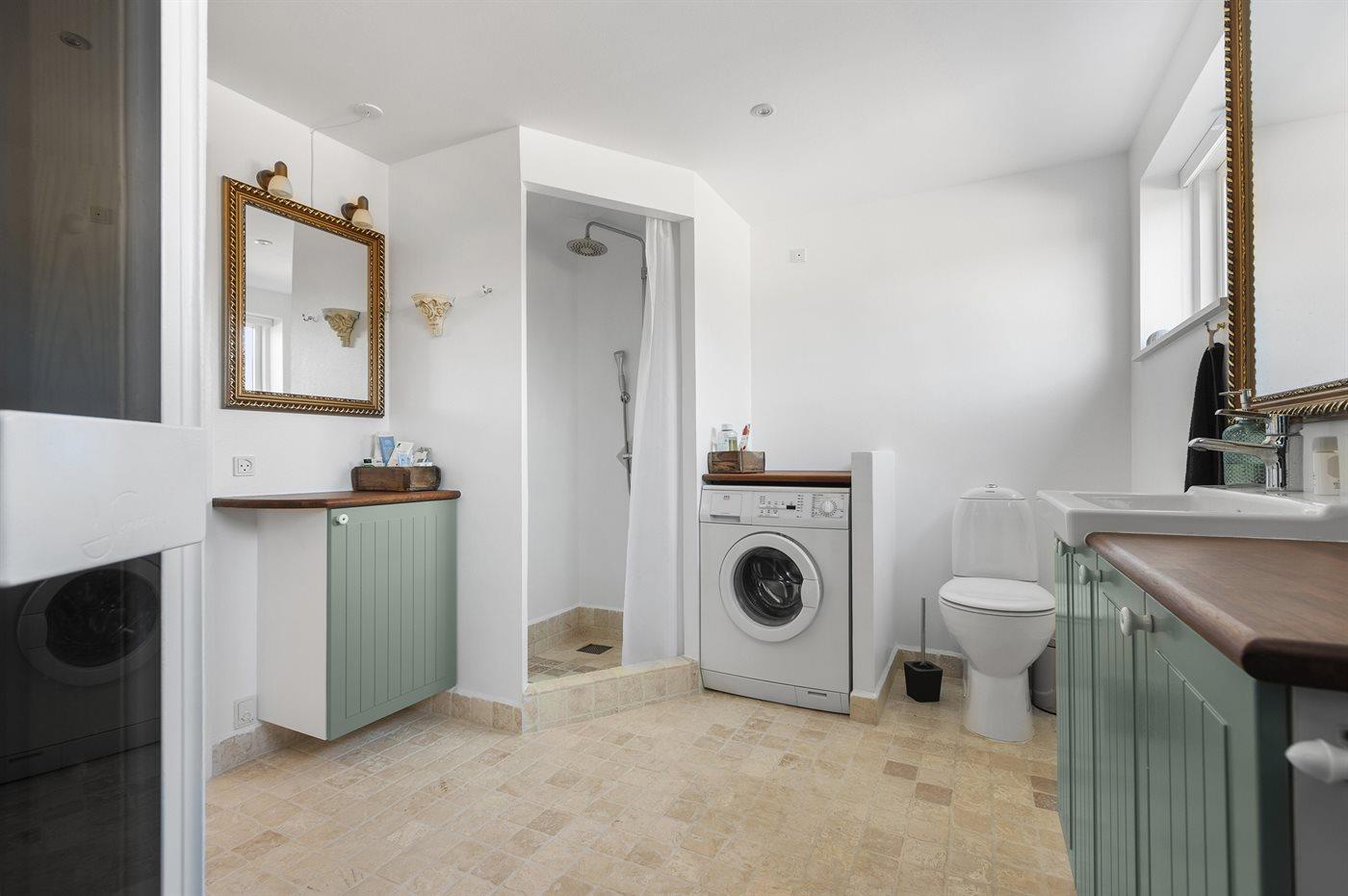 Der er 1 badeværelse med bruseniche og 1 toilet.. Der er gulvvarme på 1 badeværelse. I saunaen er der mulighed for afslapning.