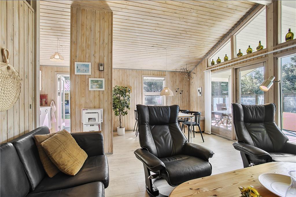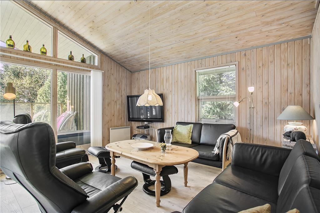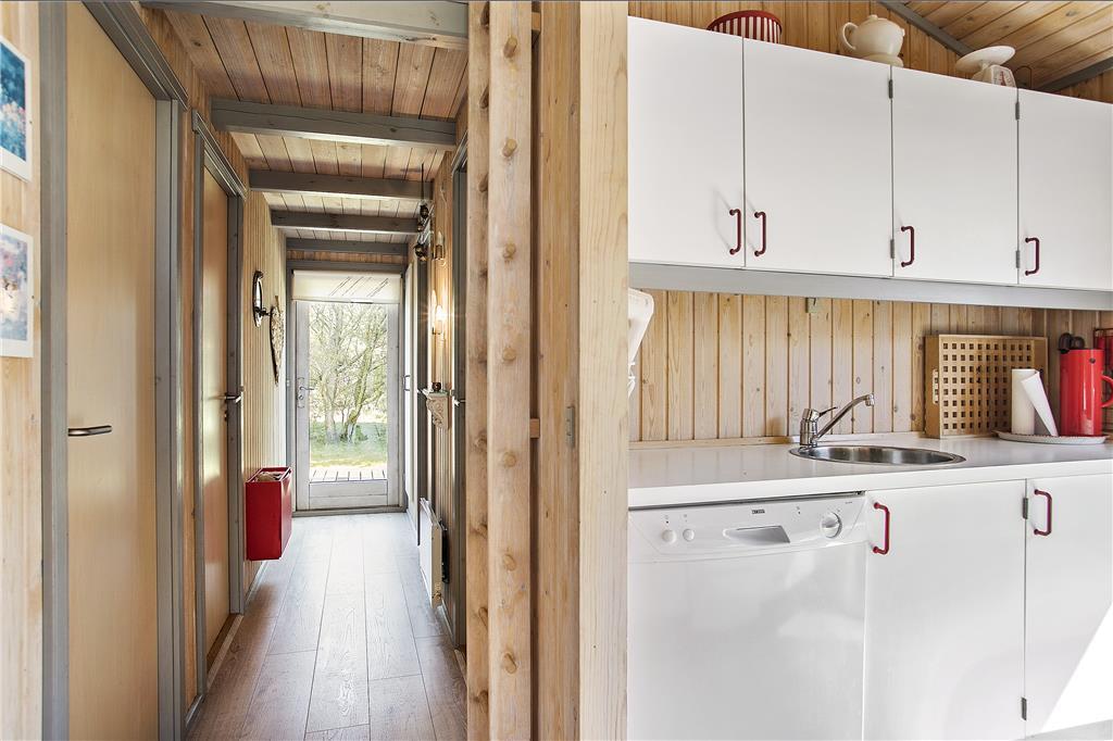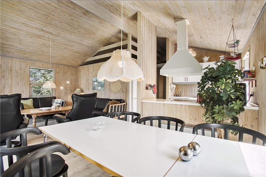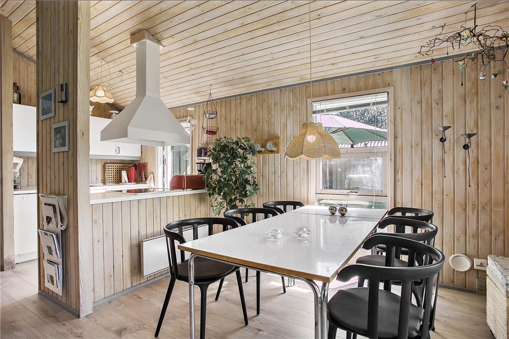 Når du træder indenfor i dette sommerhus, mødes du af en lys og indbydende atmosfære. Sommerhuset er godt indrettet med en rummelig stue, hvor du kan nyde afslapning. Herfra er der direkte adgang til den dejlige terrasse, så du kan nemt rykke udendørs og nyde solen. Køkkenet er veludstyret og indbyder til hyggelige madlavningsstunder, og der er rig mulighed for at samles om måltiderne i den åbne stue, hvor du kan slappe af med familien og vennerne. Sommerhuset har tre gode værelser, der sikrer, at alle har plads til at slappe af efter en lang dag med oplevelser. Badeværelset er funktionelt og indbydende, og med dets gode faciliteter kan du starte og afslutte dagen på bedste vis.