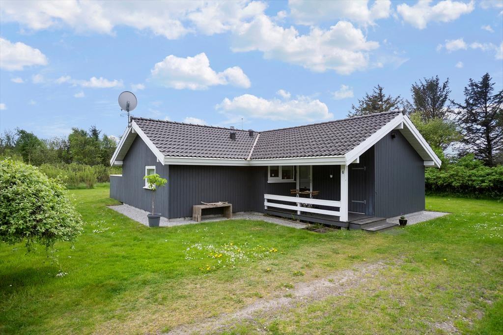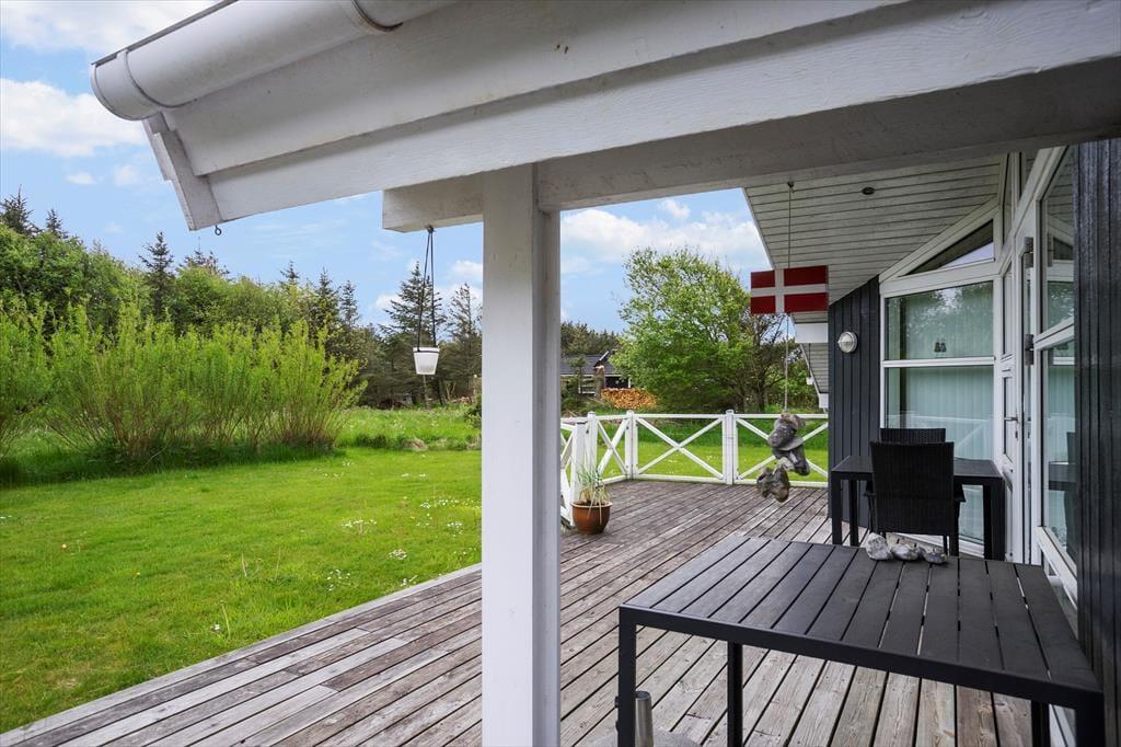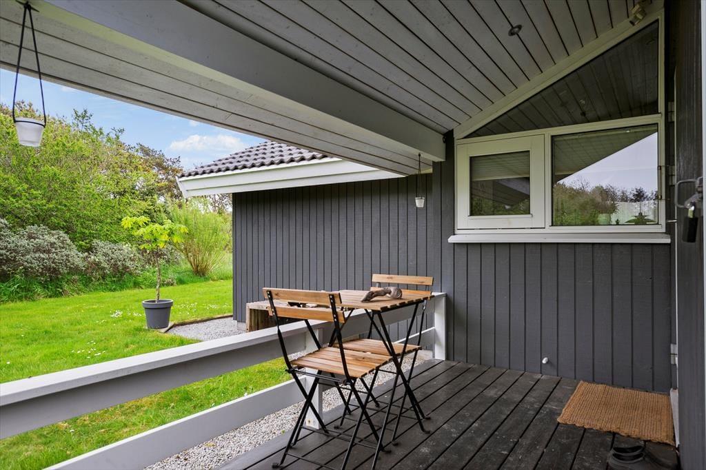 Sommerhuset ligger på en ret afskærmet plænegrund, så I kan opholde jer udendørs i ro og fred for nysgerrige blikke og tilfældigt forbipasserende. Den store terrasse giver gode muligheder for at nyde solen, og om aftenen kan I trække ind under den overdækkede del og nyde grillmåltider og sommerens ekstra lange timer. Til børnene er her gyngestativ og masser af plads til boldspil og leg på plænen.