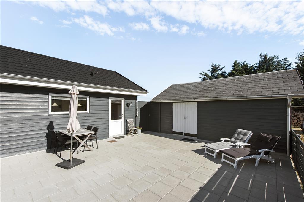 Naturgrunden er omgivet af høje træer, som giver godt med læ for Vestenvinden, og foran terrassen er også lavet et lille læhegn. Der er masser af plads til at lege og tumle og derudover en bålplads til glæde for både børn og voksne. Den flotte stenterrasse løber på øst, vest og sydsiden af sommerhuset, så man kan fange solen hele dagen lang, og om aftenen kan man sidde ude og nyde et dejligt måltid mad tilberedt på grillen.
