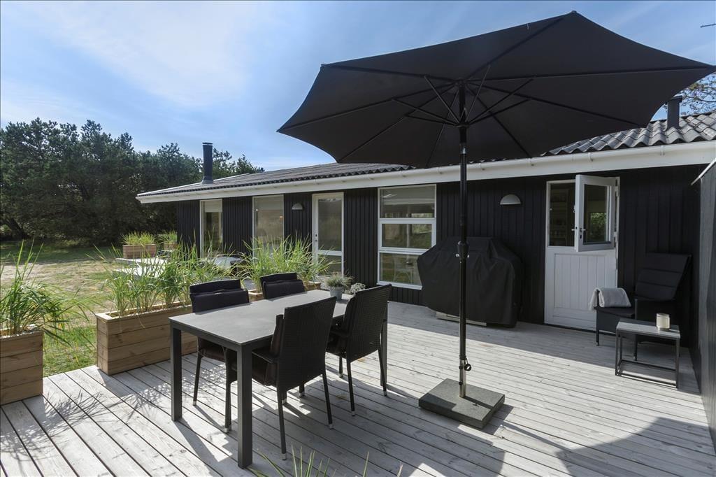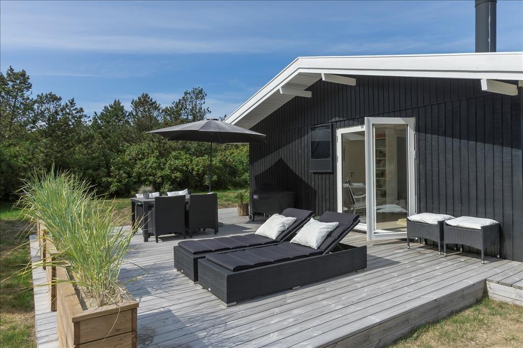 Et af husets kendetegn er det gode terrassemiljø. Rundt om tre af husets sider breder der sig nemlig en træterrasse, som er udstyret med havemøbler og liggestole samt parasol og grill. En del af terrassen ligger afskærmet af både huset, carporten og et plankeværk, men generelt er alle solkroge ugenerede takket være havens tætte randbeplantning.