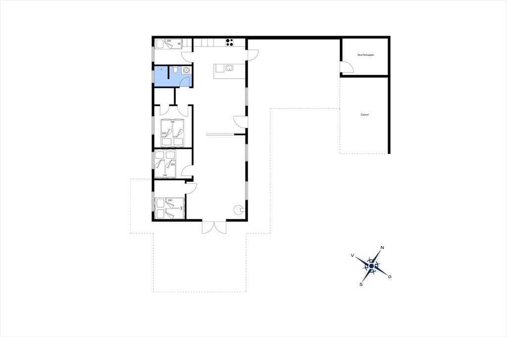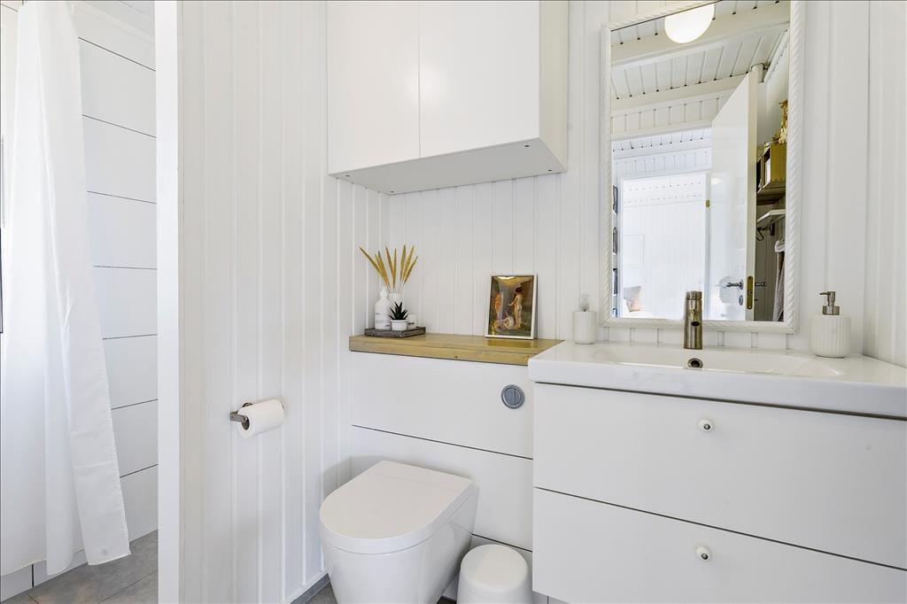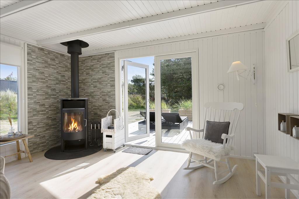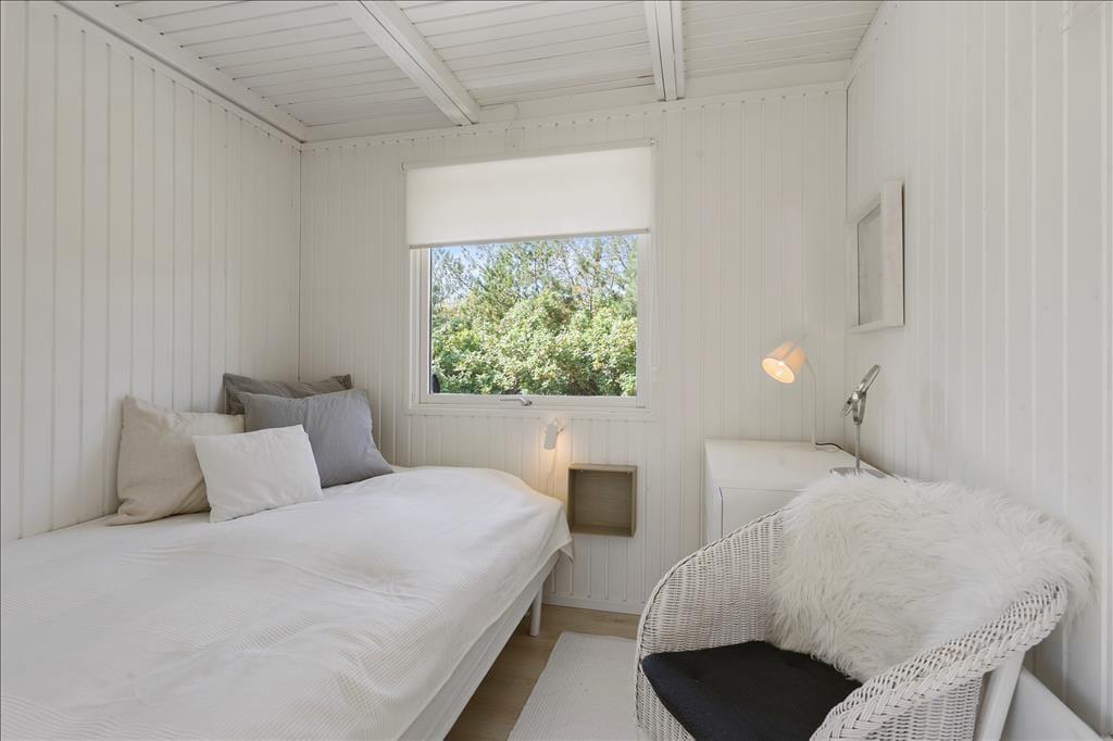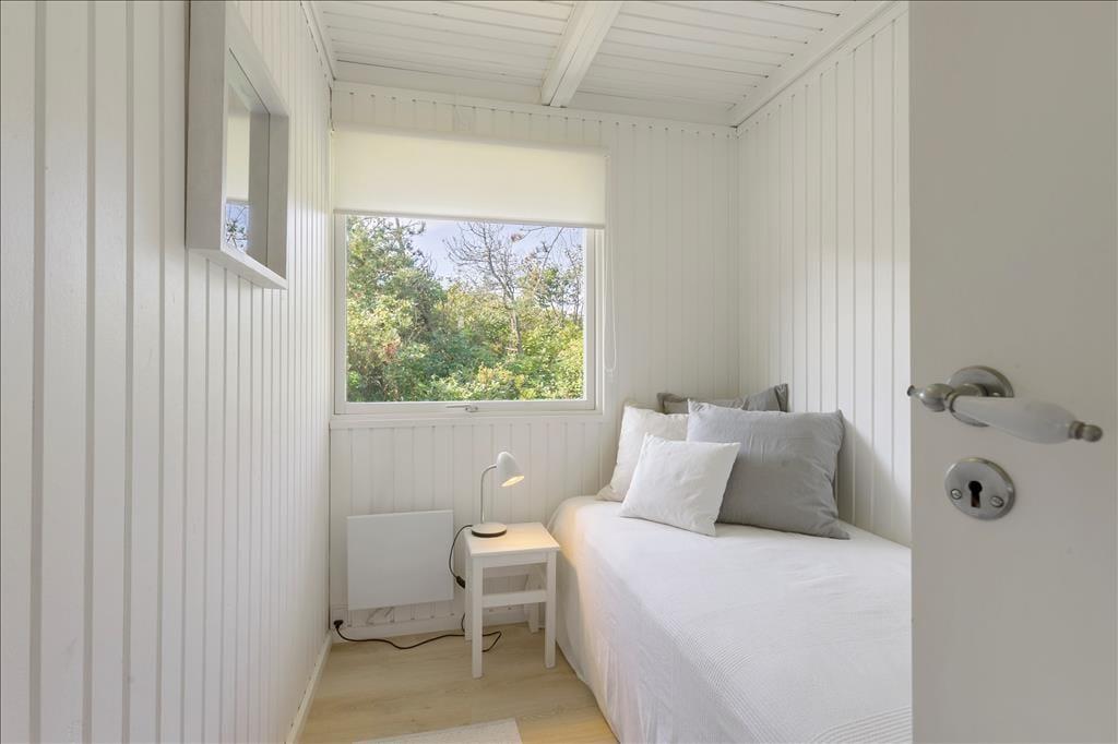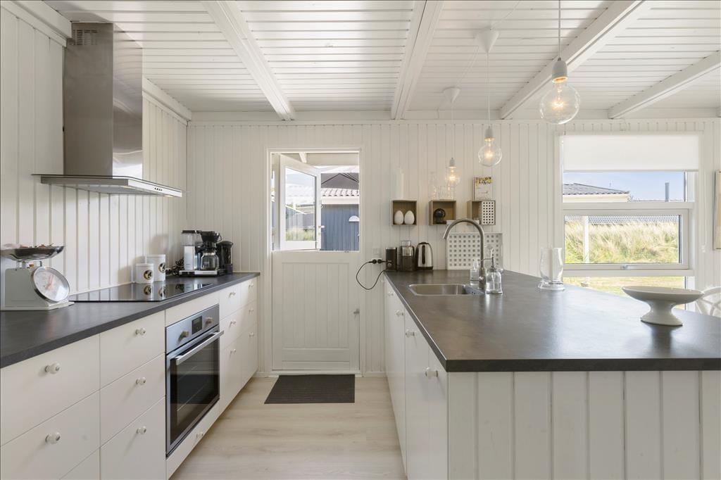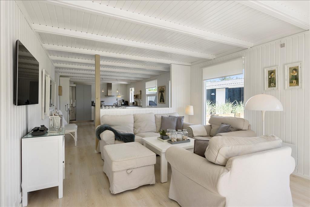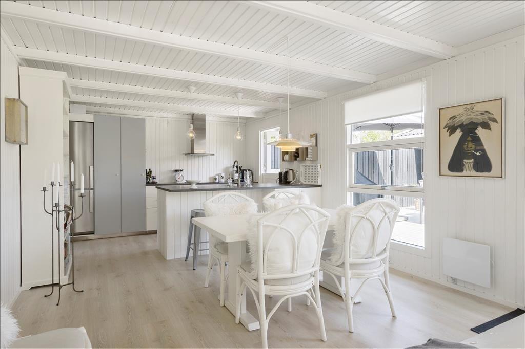 Huset, som nærmere bestemt er et klassisk træsommerhus på 82 m2, fungerer som en god base for ferien. Det fremstår velholdt med en lys og behagelig atmosfære inden døre. Trævæggene er nemlig hvidmalede i alle rum – selv på badeværelset – og også møblementet er holdt i rolige farvenuancer i klassisk feriehusstil. Stuen og køkkenet ligger i åben forbindelse, så brætspil, krimilæsning, hyggesnakke og madlavning kan foregå i samme fælles opholdsrum. Efter aftensmaden kan I tænde op i brændeovnen, hvis vejret indbyder til det, og når det er sengetid, har I fire soveværelser at fordele jer på.