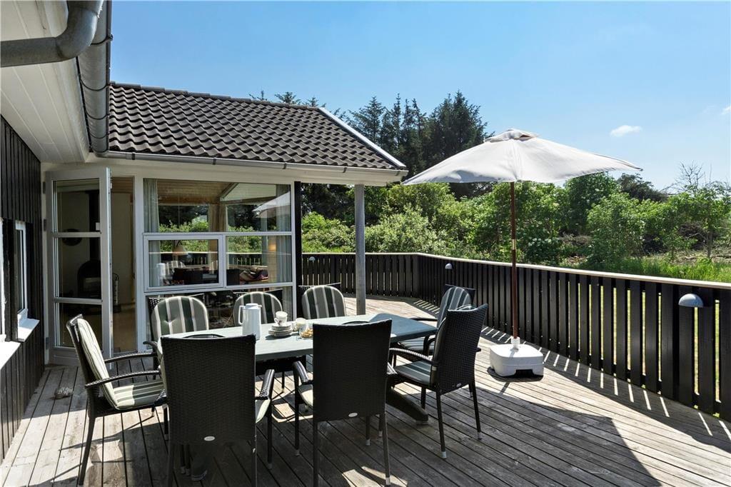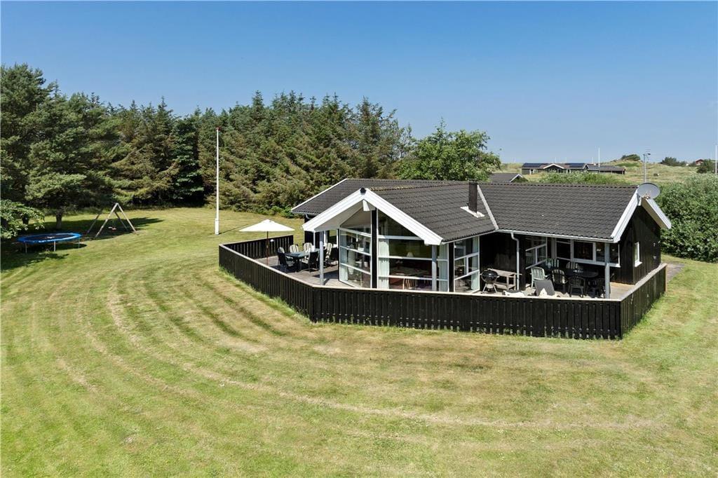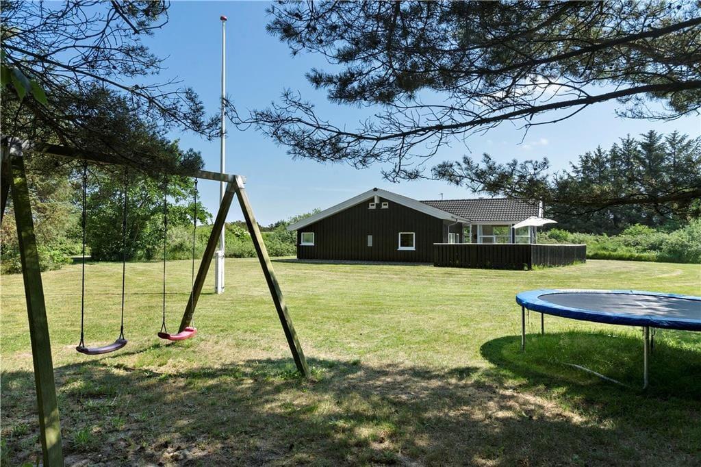 Fra stuen kan I træde direkte ud på den sydvendte terrasse, som er stor og solrig. En del af terrassen er overdækket, og der er også mulighed for at sætte sig på den nordvendte, mindre terrasse, hvis I trænger til en skyggefuld opholdsplads. Er det på tide at komme op af havestolene, er der masser af plads til leg og havespil på græsplænen, og til de yngste feriegæster er der gynger og trampolin i den store og ugenerede have.