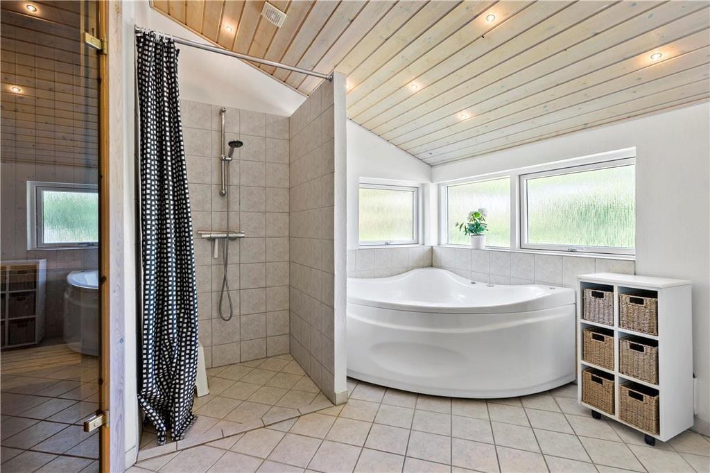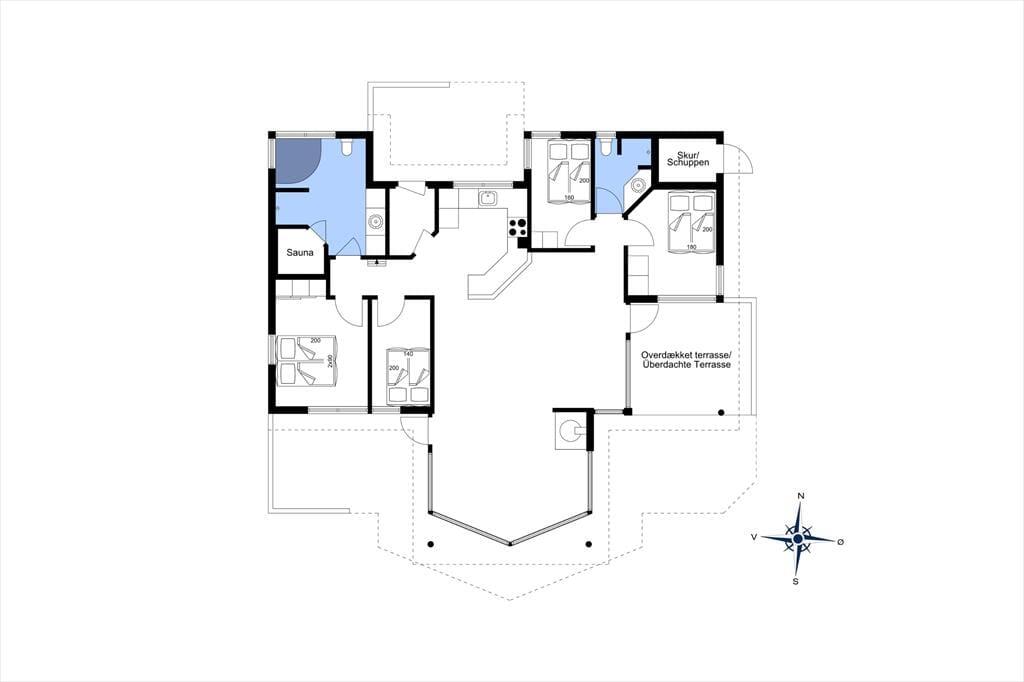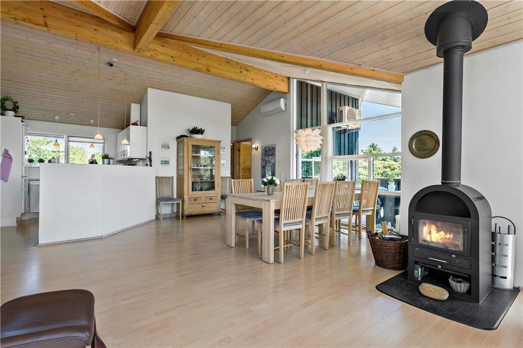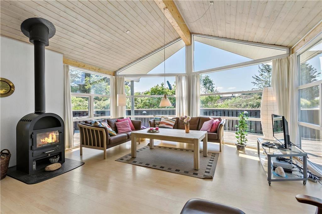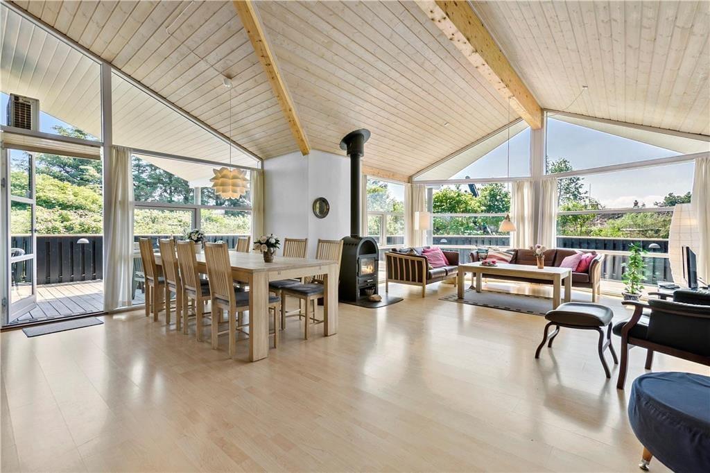 Mere præcist er der tale om et gedigent og solidt træsommerhus fra 2004. Stort og rummeligt er huset også, og der er tænkt over planløsningen, som på fornuftig vis byder på fire soveværelser, to badeværelser og et stort opholdsrum med integreret køkkenafdeling. Sovegemakkerne og badeværelserne er tilmed opdelt i to afsnit, så hvis I er to børnefamilier samlet, kan I pakke feriekufferterne ud i hver jeres afdeling. De sociale afslapningsstunder kan foregå i opholdsrummet, der ligger helt centralt i huset. Her er der brændeovn, loft til kip og komfortable møbler, der passer godt ind i rummet, og de store gavlvinduer sørger for et dejligt lysindfald. Kort sagt er atmosfæren i top, så det er et skønt sted at slappe helt af – og hvis der skal lidt ekstra til, kan I forkæle jer selv med et spabad og en tur i saunaen, som det største badeværelse er udstyret med.