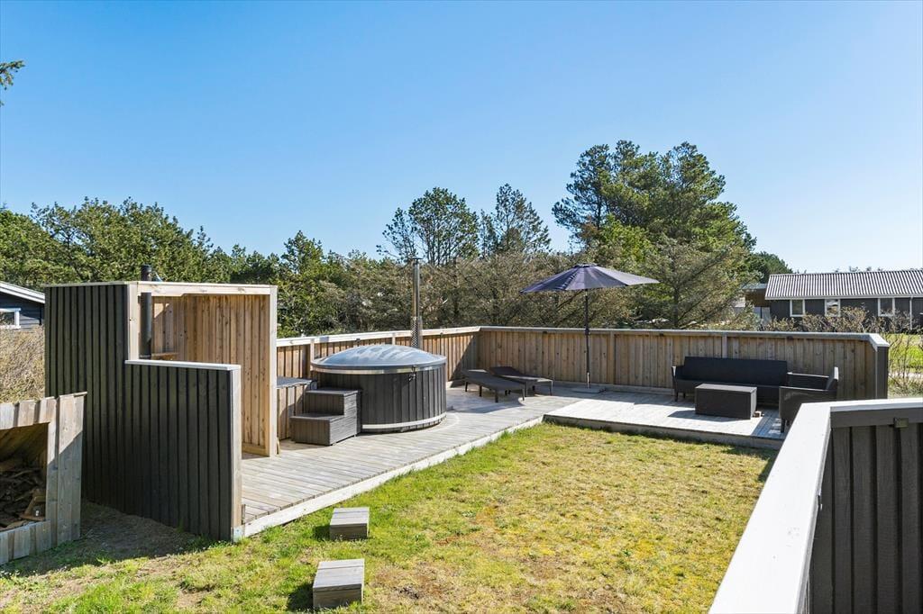 Vil I ikke nyde solen indenfor, men ude i det fri, behøver I bare åbne havedøren og træde ud på terrassen. Den er stor, så der er flere gode solkroge at vælge imellem – og så ligger der endda endnu en solrig terrasse på den 1.302 m2 store grund. Her er der både installeret en udendørs bruser og et vildmarksbad, og derfor er der lagt op til både et opkvikkende morgenbad og en afslappende wellness-stund under stjernehimlen.