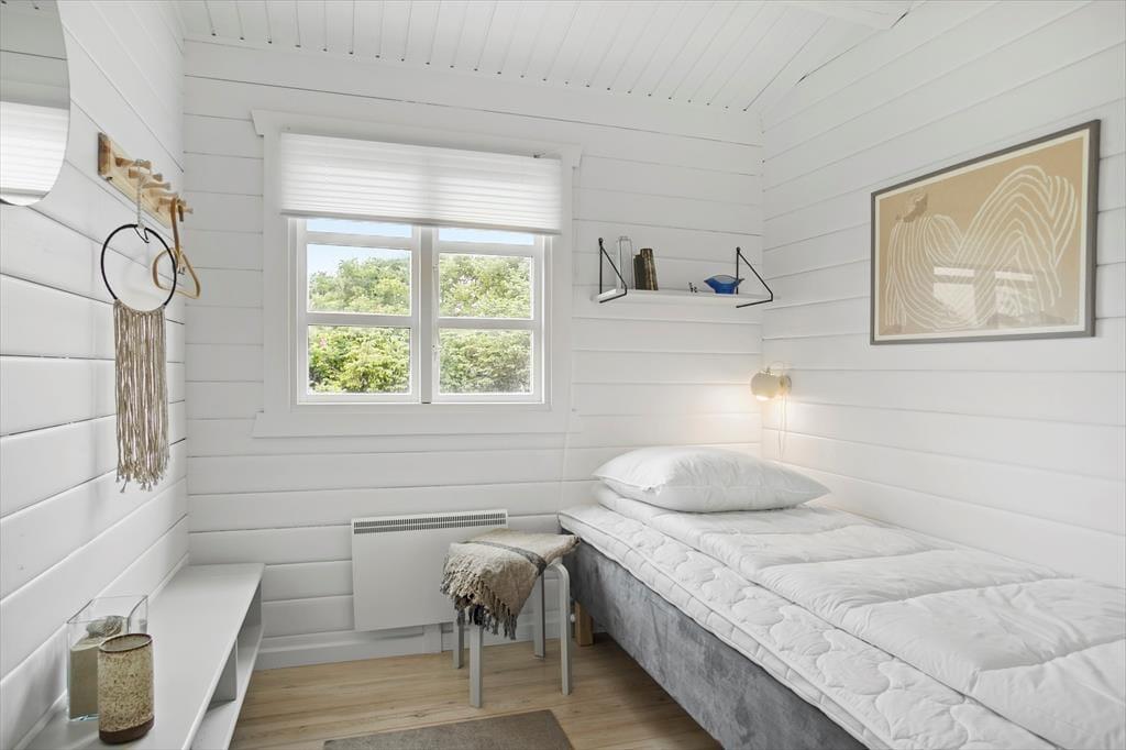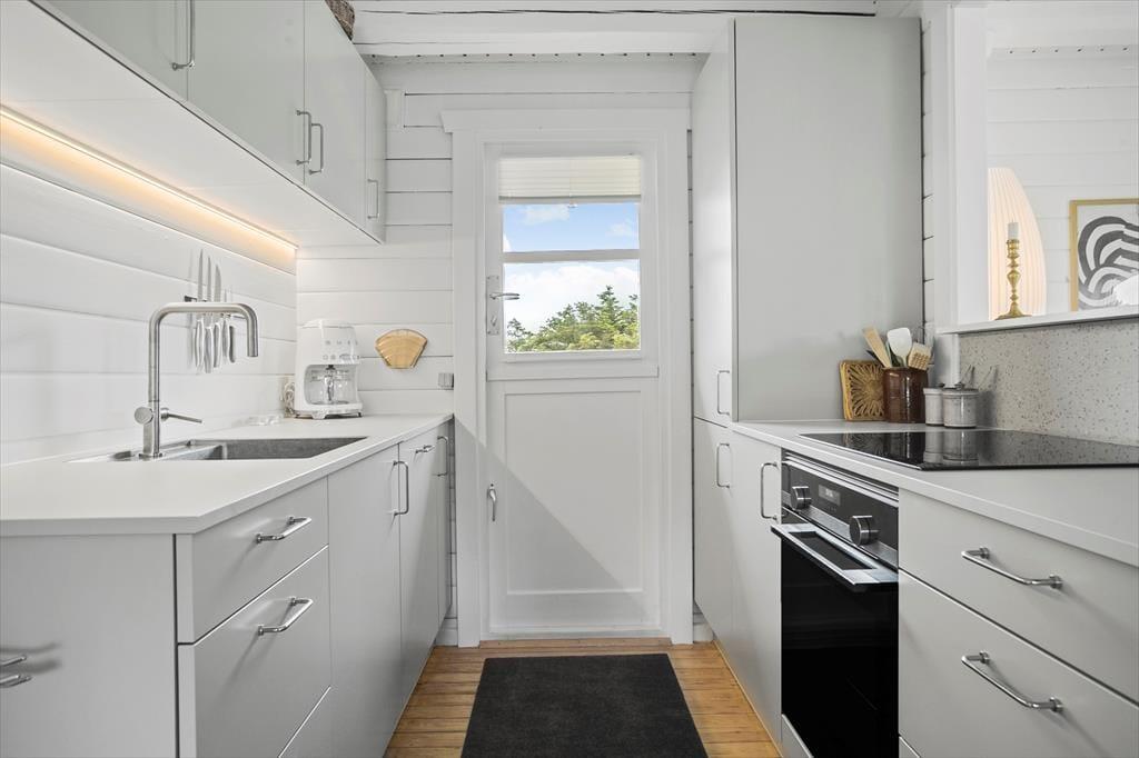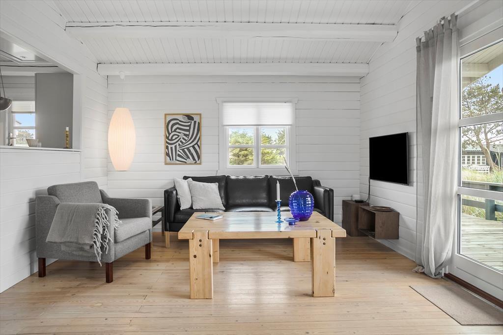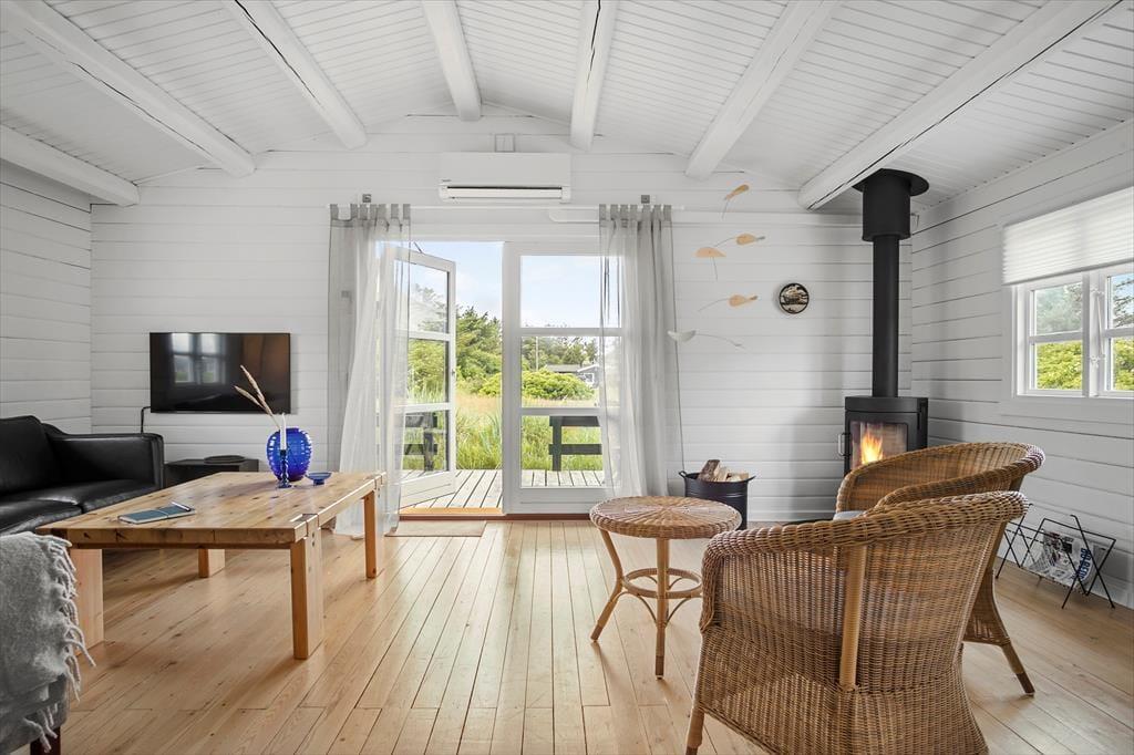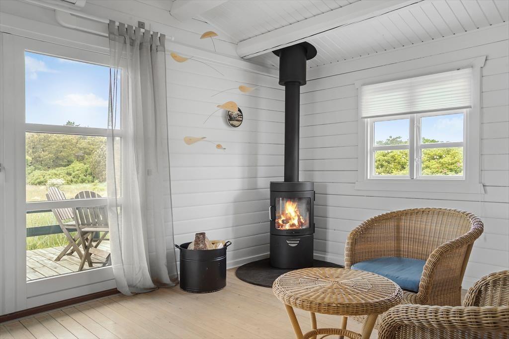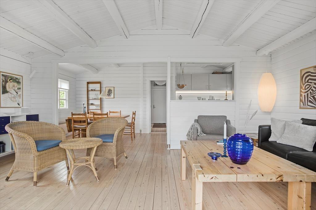 Sommerhuset på Laurasvej 10 byder på en lys og indbydende atmosfære, hvor den rummelige indretning og de store vinduer giver et skønt lysindfald. Her kan hele familien samles i den åbne stue, hvor brændeovnen knitrer og skaber en hyggelig stemning. Det veludstyrede køkken er integreret med stuen, så du kan nyde samværet, mens du tilbereder måltider med friske, lokale råvarer. Huset indeholder tre gode soveværelser og et badeværelse, hvilket giver god plads til både børn og voksne. Efter en dag fuld af oplevelser er det skønt at samles i sofaen foran brændeovnen, hvor roen kan sænke sig, mens mørket falder på udenfor.