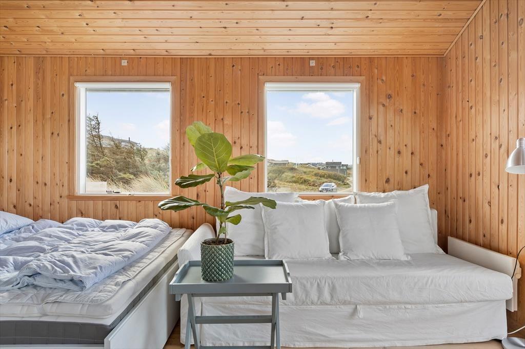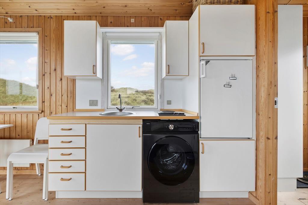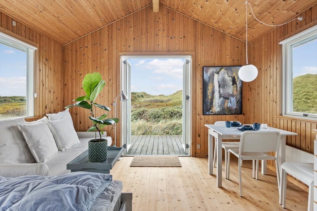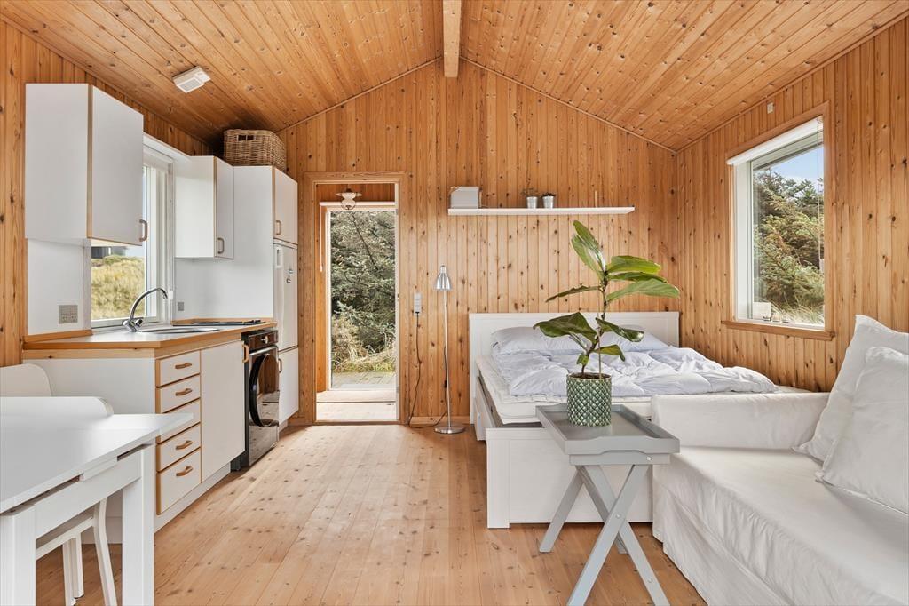 Et sommerhus på 30 m2 lyder umiddelbart ikke af meget, men takket være den hyggelige og funktionelle indretning har I alt det nødvendige inden døre. Sofaen er det helt rette sted at flette fingre eller sidde fordybet i en god bog – bare I husker at kigge op engang imellem for at beundre det flotte klitlandskab, der breder sig udenfor vinduerne. Rummets kvadratmeter er godt udnyttet, for der er også plads til et spisebord/skrivebord, en dobbeltseng og et simpelt, men pænt køkken, og alt interiør er for øvrigt holdt i lyse farvetoner, hvilket giver en charmerende kontrast til træbeklædningen på vægge og lofter. I entréen har I plads til at hænge overtøjet og stille skoene, og endelig er der et brusebadeværelse i huset.