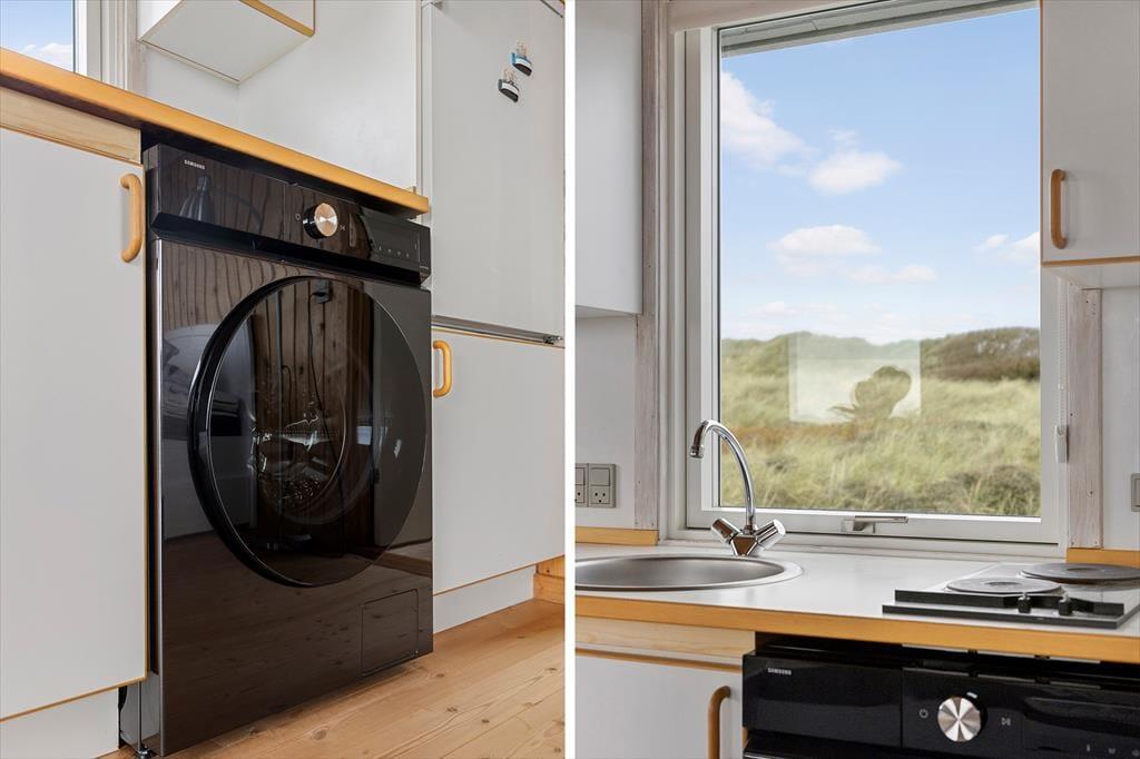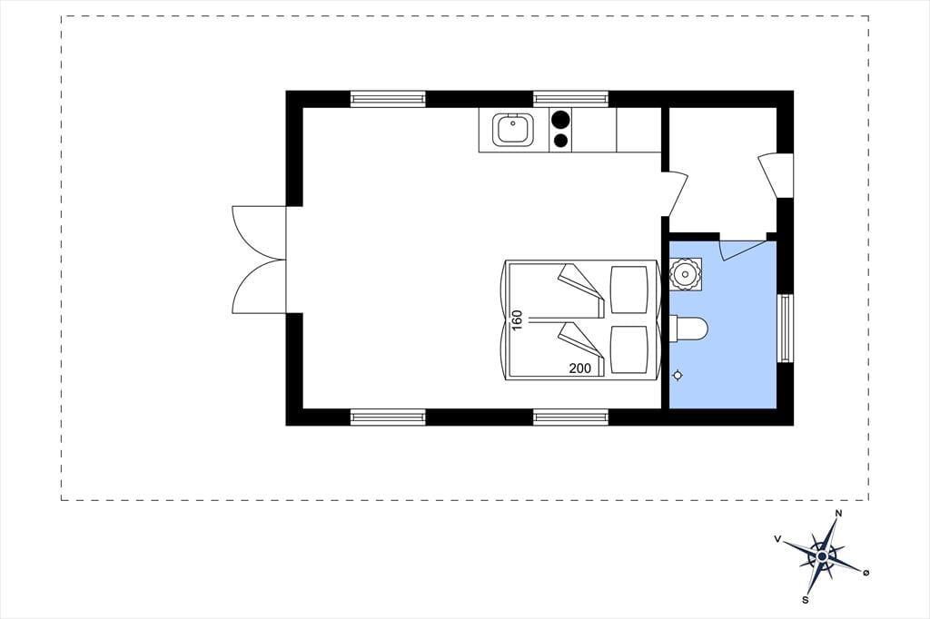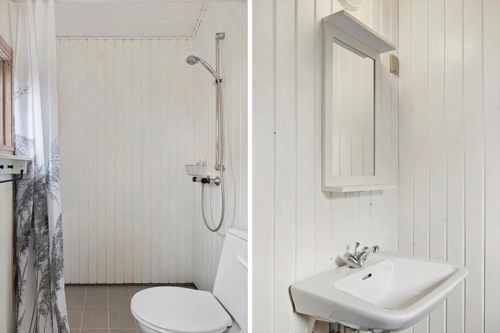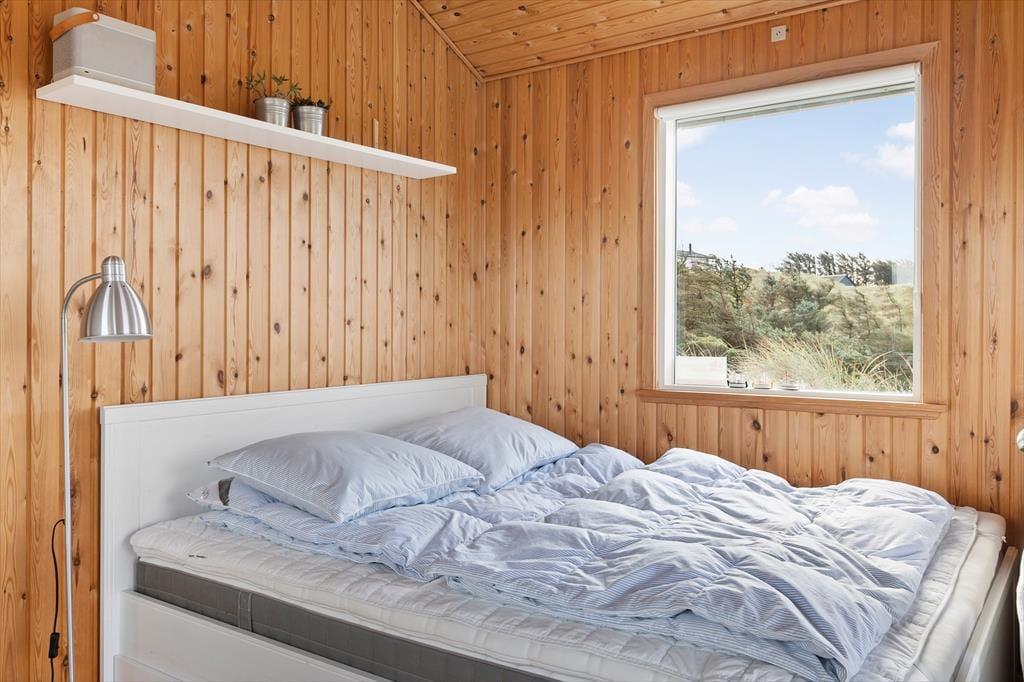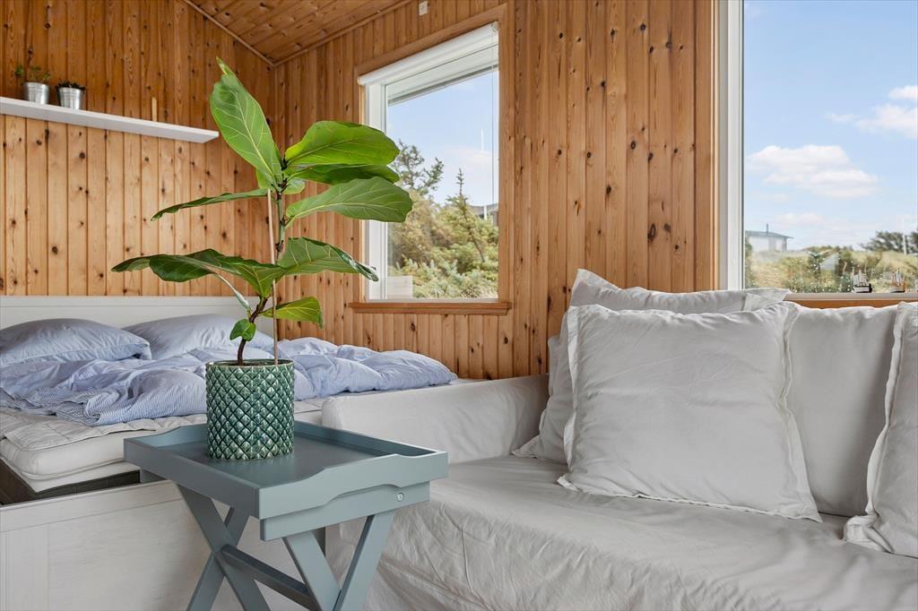 Et sommerhus på 30 m2 lyder umiddelbart ikke af meget, men takket være den hyggelige og funktionelle indretning har I alt det nødvendige inden døre. Sofaen er det helt rette sted at flette fingre eller sidde fordybet i en god bog – bare I husker at kigge op engang imellem for at beundre det flotte klitlandskab, der breder sig udenfor vinduerne. Rummets kvadratmeter er godt udnyttet, for der er også plads til et spisebord/skrivebord, en dobbeltseng og et simpelt, men pænt køkken, og alt interiør er for øvrigt holdt i lyse farvetoner, hvilket giver en charmerende kontrast til træbeklædningen på vægge og lofter. I entréen har I plads til at hænge overtøjet og stille skoene, og endelig er der et brusebadeværelse i huset.