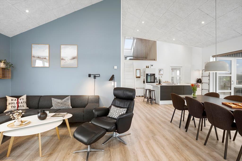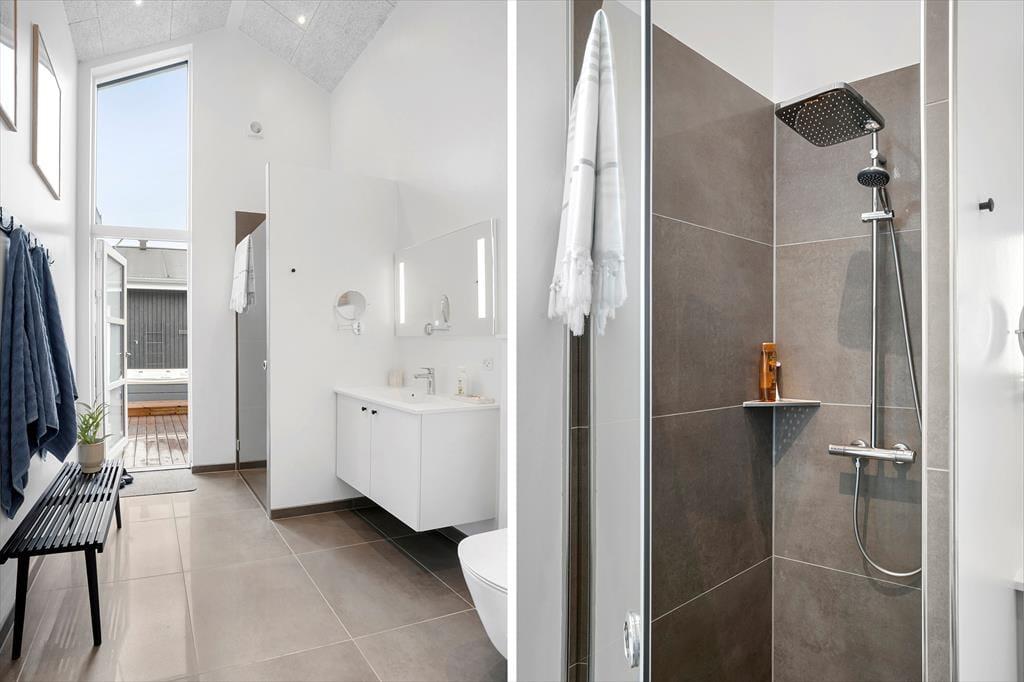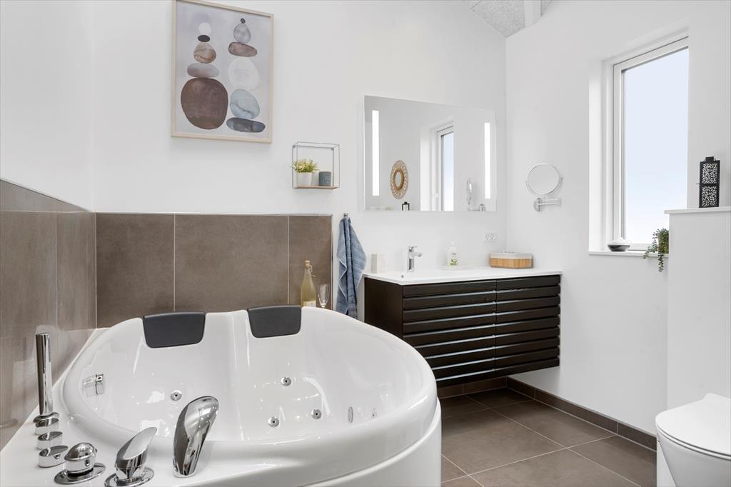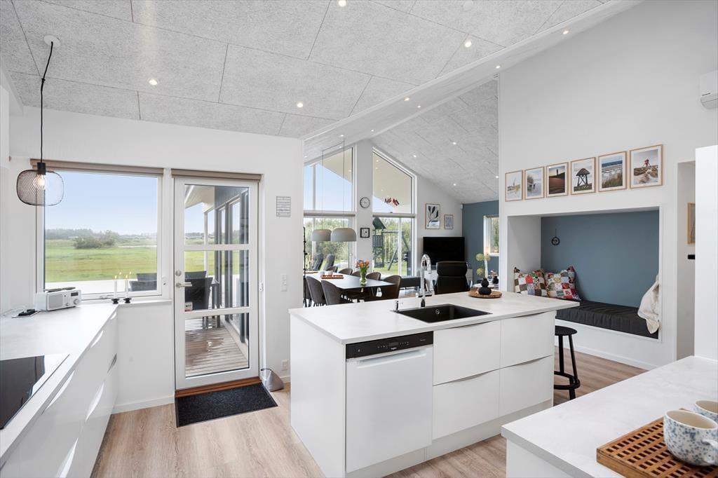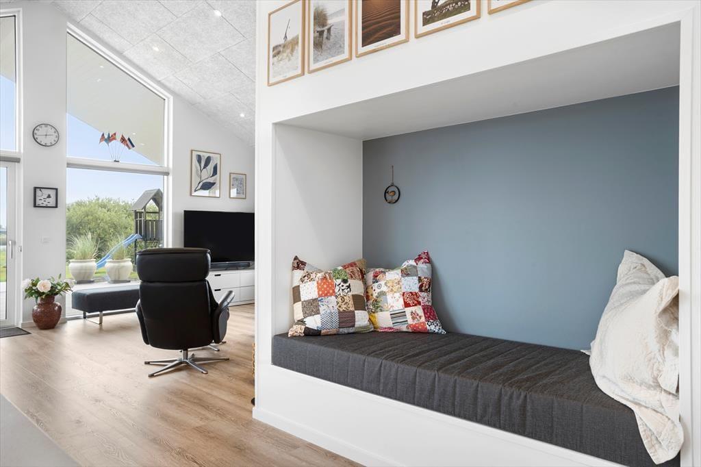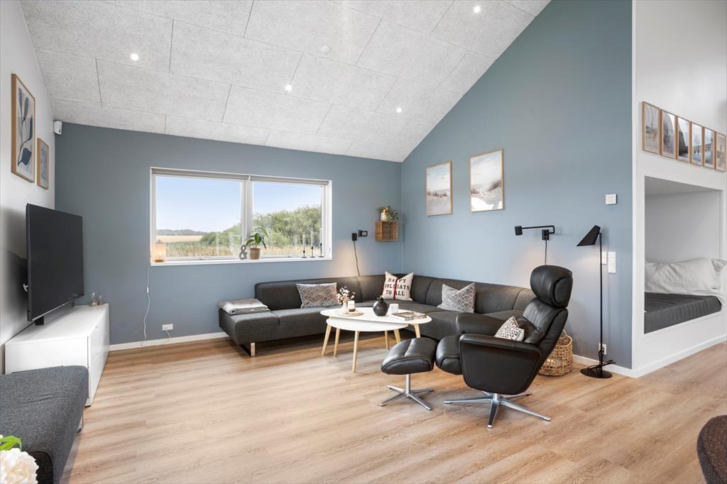 Dette fantastiske sommerhus emmer af stil og komfort med en planløsning, der giver rum til både samvær og privatliv. De lyse og rummelige stuer er indrettet i en moderne nordisk stil, hvor store vinduespartier trækker naturens lys ind i boligen. Stuen åbner op til en overdækket terrasse, der forlænger sommerhuset ud i det fri, og inviterer til hyggelige stunder under åben himmel – også når duggen falder. Huset byder på tre veludstyrede badeværelser, hvoraf det ene har en indendørs spa, der indbyder til afslapning efter en dag fyldt med oplevelser. Med fire gode soveværelser og en hems, der er perfekt til børnene, er der masser af plads til hele familien. Alkoven giver yderligere hyggekroge, hvor du kan trække dig tilbage med en god bog eller en lille lur.