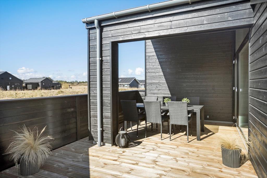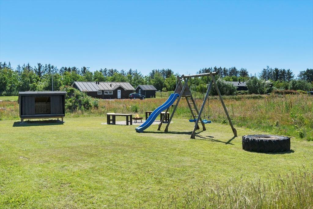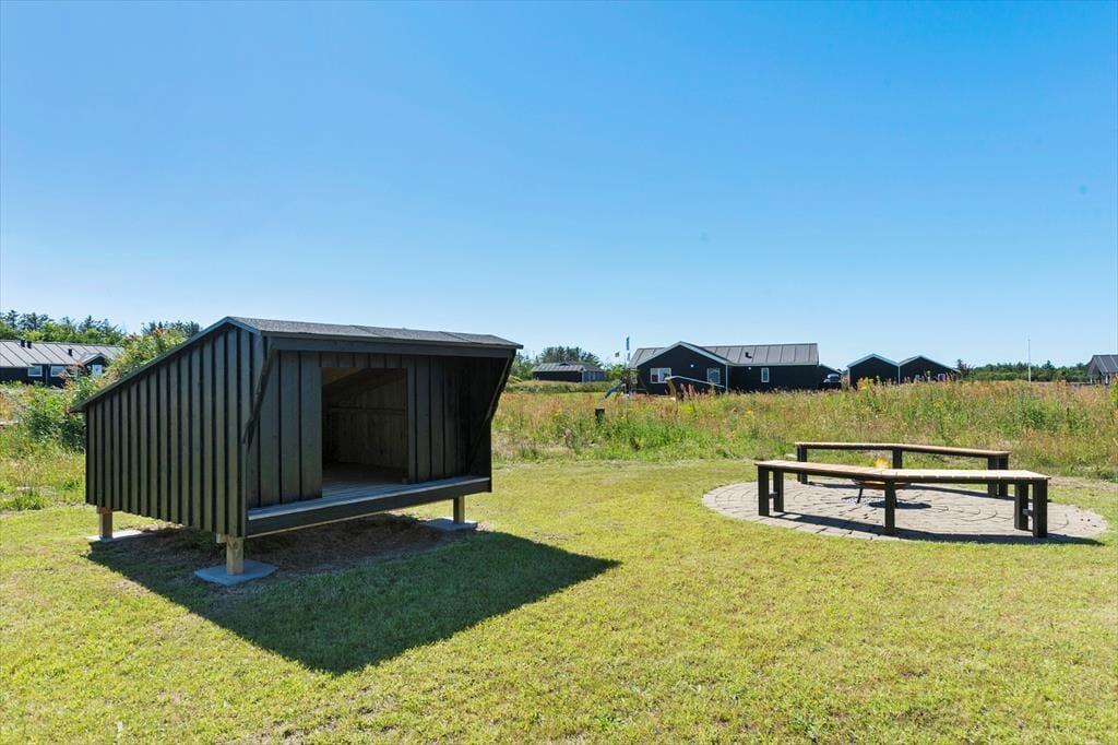 Er vejret godt, kan driverlivet oplagt udspille sig på den flotte træterrasse, der breder sig rundt om sommerhuset. Her har I havemøbler og liggestole til rådighed, og bliver det for hedt at sidde i solen, kan I slå parasollen op. Grunden er med sine 2200 m2 ganske stor, så der er masser af plads til at lege og boltre sig – og så står der for øvrigt både et shelter og et bålsted på grunden.