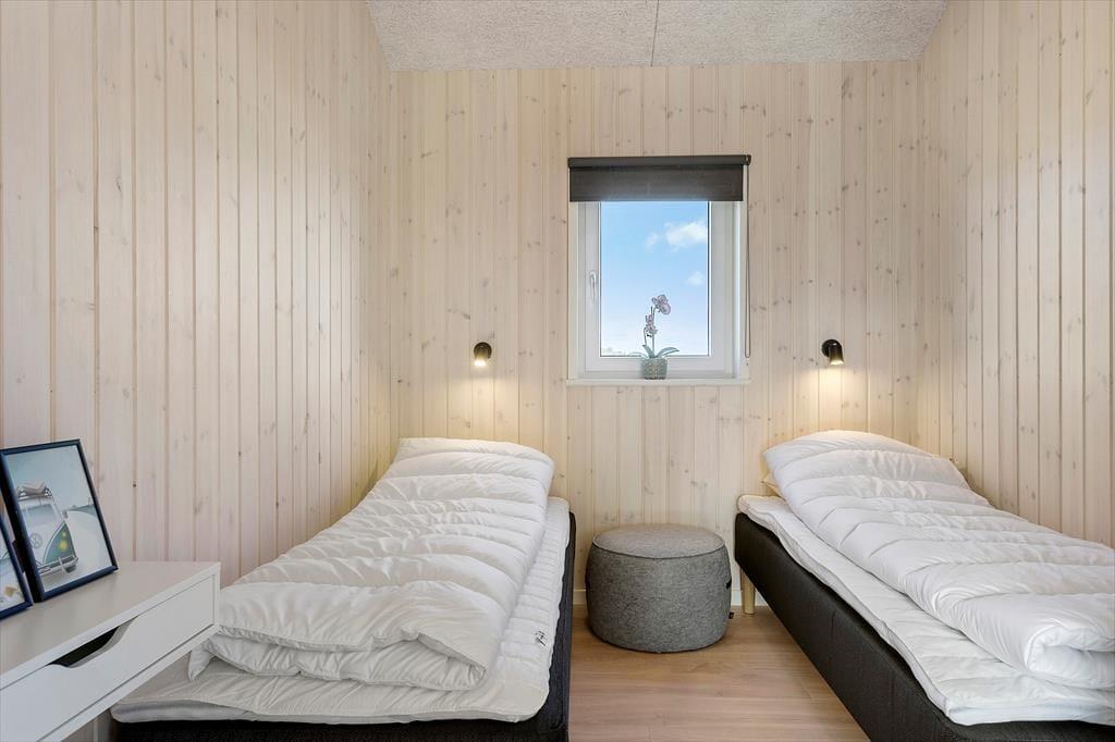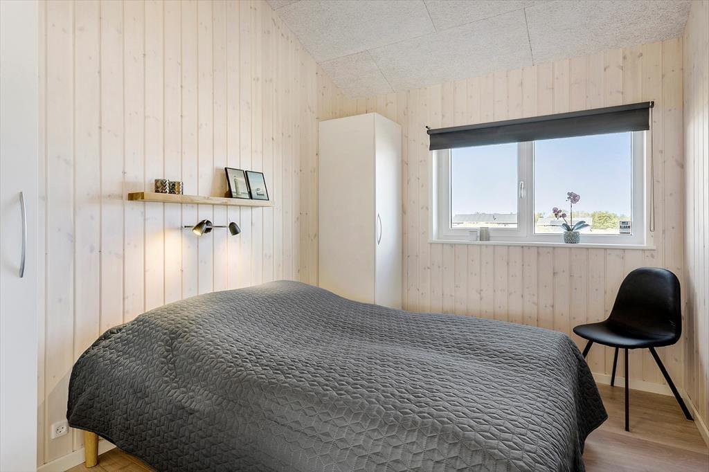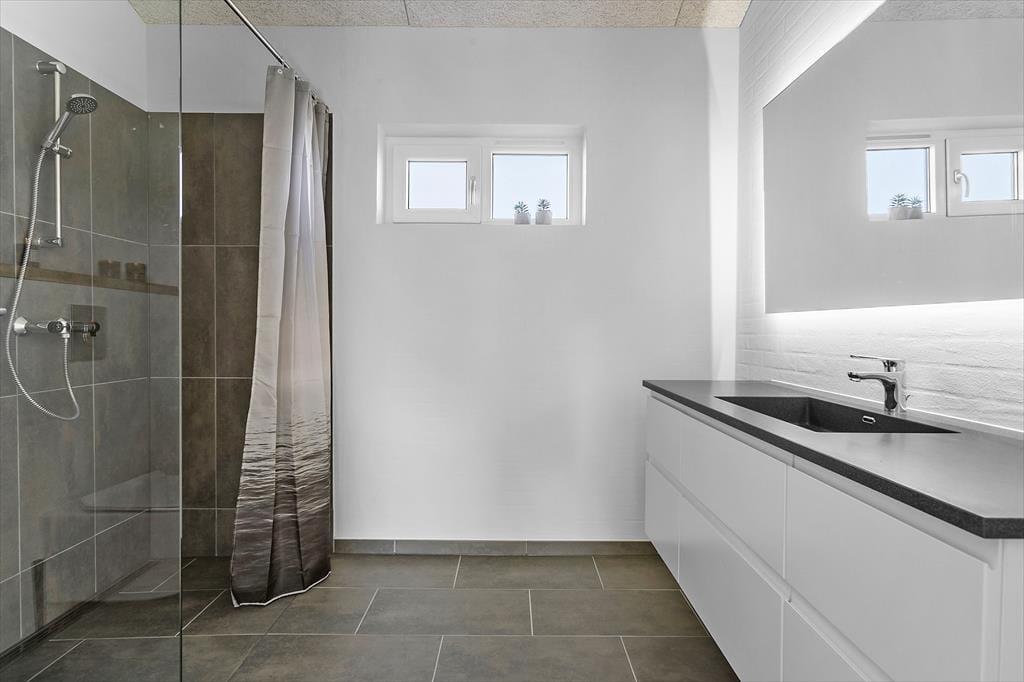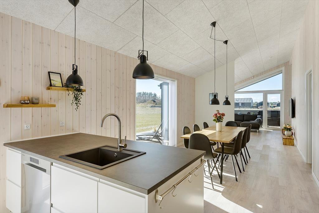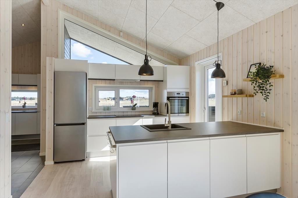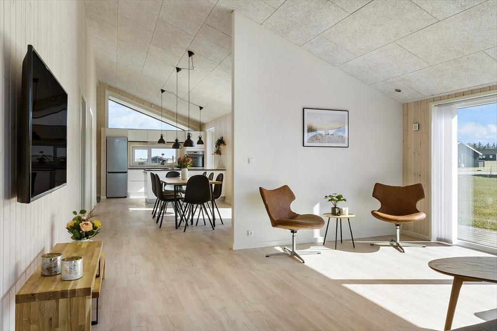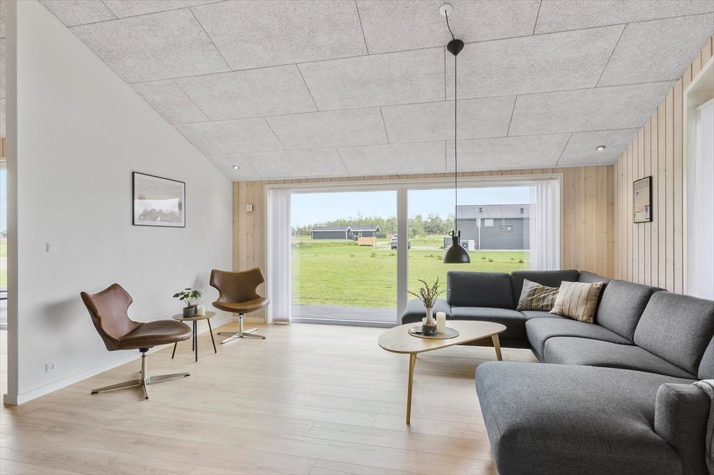 Inden døre har I hele 123 m2 at brede jer på, så I kan uden problemer samles med venner eller familie her i huset. Alle rum er lyse, højloftede og indbydende – og selv entréen og de to badeværelser er stilrent indrettet med enkelt møblement og rene linjer. Derudover er der fire gode soveværelser. Sommerhusets centrale samlingspunkt er stuen, som er et stort og smukt opholdsrum, hvor I kan samles om spisebordet, slænge jer i sofaafdelingen og hygge jer med madlavningen i det åbne køkken.