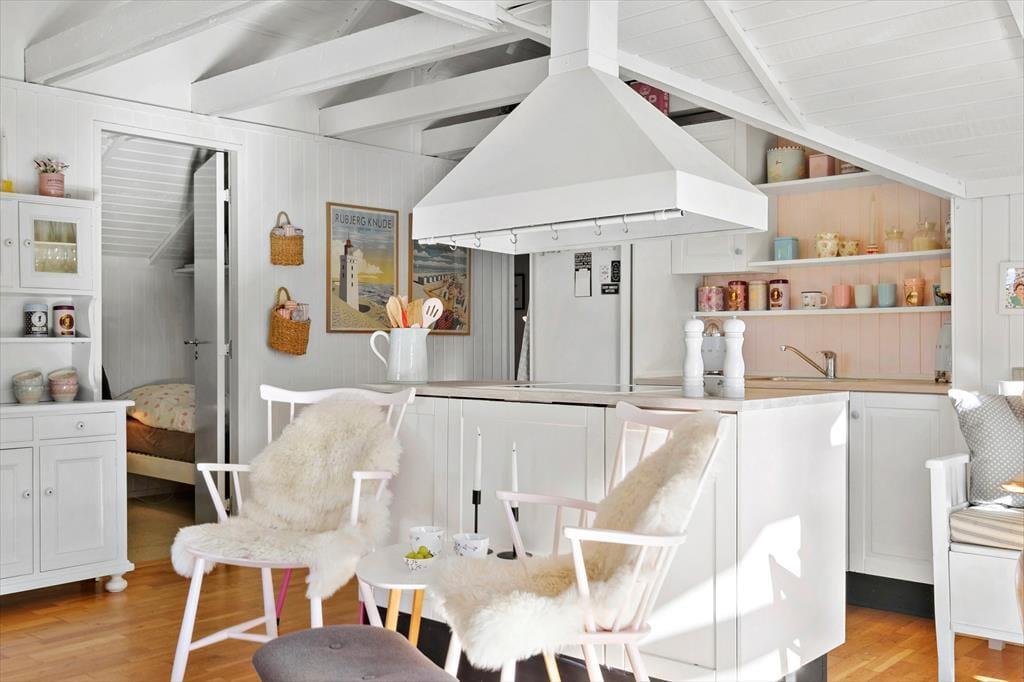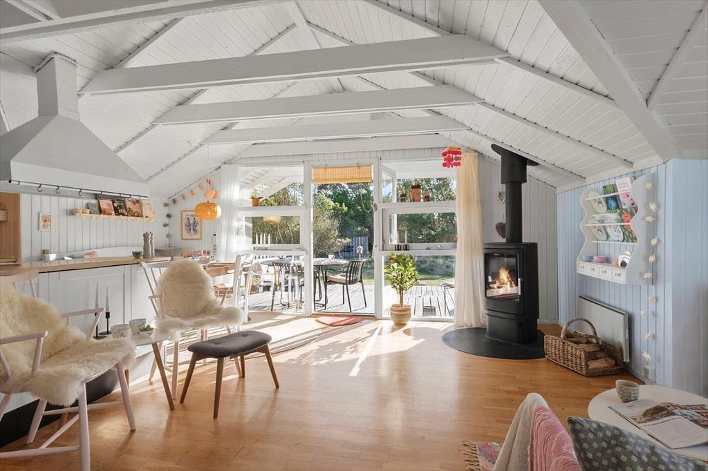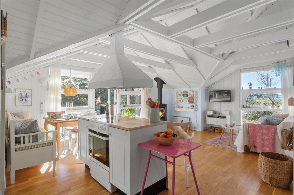 Når du træder ind i sommerhuset, mødes du af et lyst og åbent opholdsområde med loft til kip, der skaber en fantastisk rummelighed og lysindfald. Den åbne forbindelse mellem køkkenet og stuen giver et fantastisk samspil, og herfra har du udsigt til de flotte klitter, der kan ses gennem de store vinduer. Køkkenet er godt udstyret og ideelt til madlavning i fællesskab – og når maden er klar, kan du nyde den omkring spisebordet, mens solen strømmer ind i rummet. Sommerhuset byder på tre hyggelige soveværelser, der indbyder til en god nats søvn efter en aktiv dag. Det eneste badeværelse er indrettet med smag, og her finder du alt, hvad du behøver til dit daglige velvære.