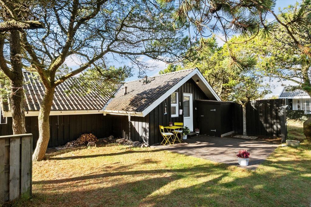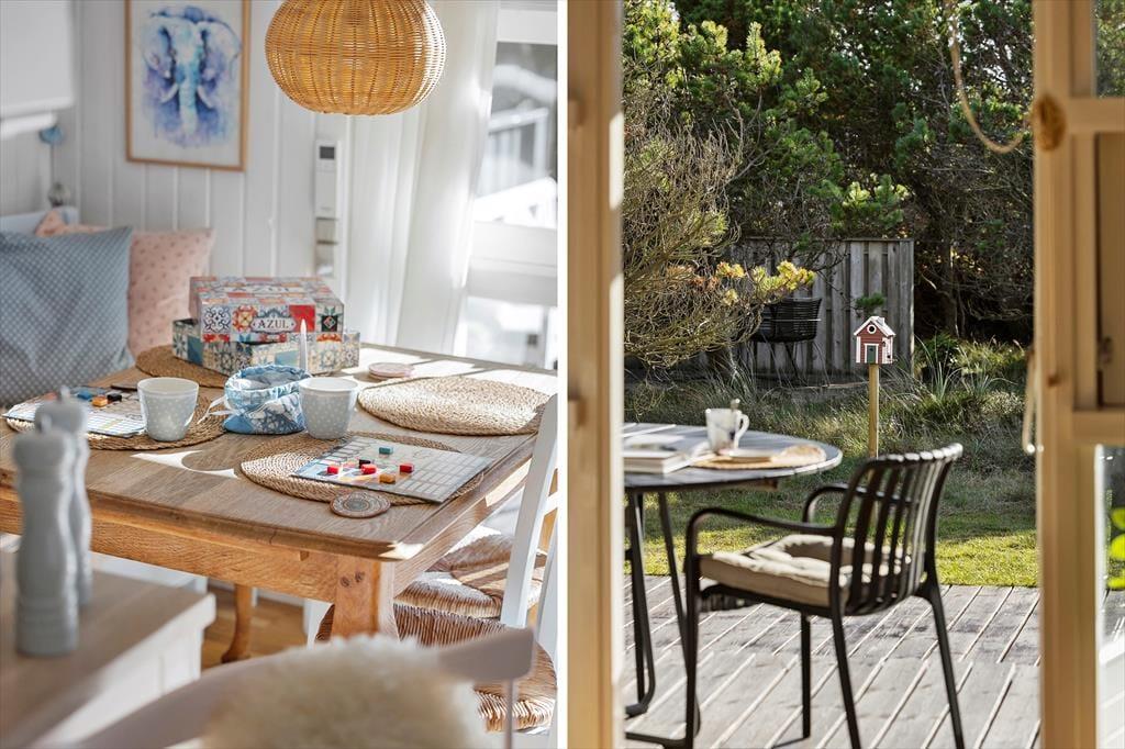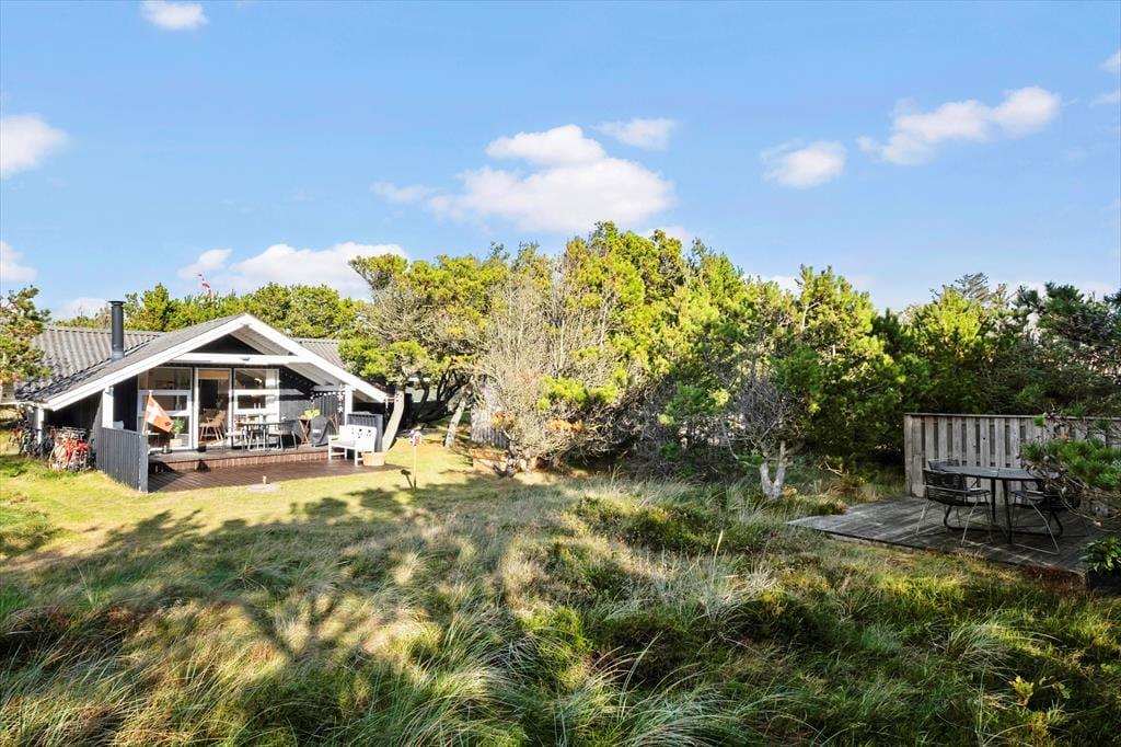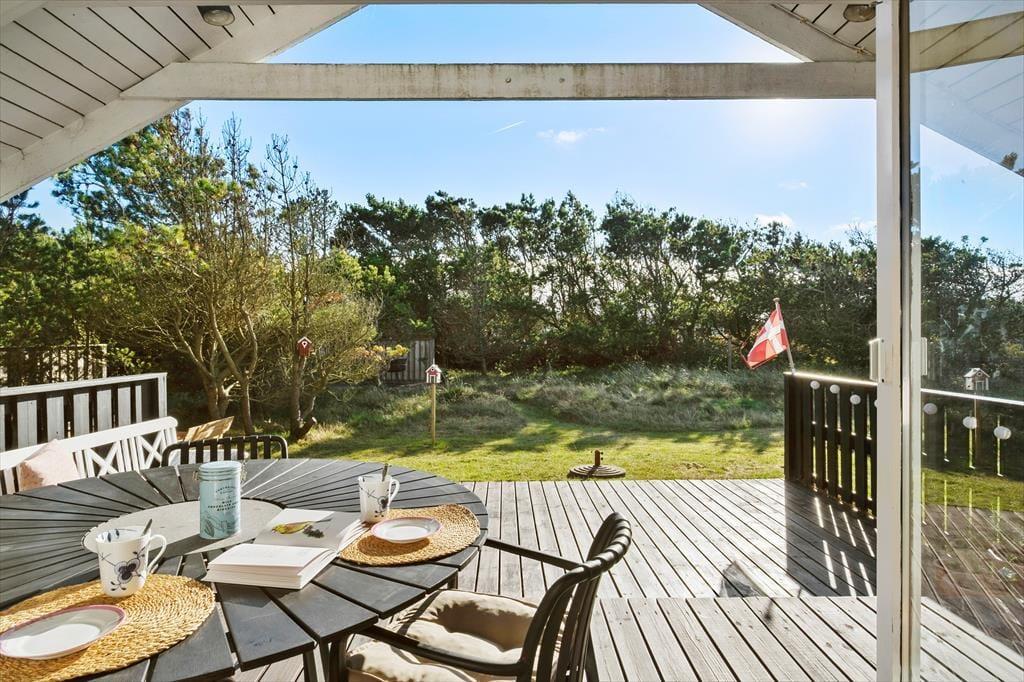 Udenfor kan du virkelig nyde den afslappede ferieatmosfære. Den overdækkede terrasse giver mulighed for at tilbringe tid udenfor, uanset vejret. Det er det perfekte sted at nyde morgenkaffen eller slappe af med en god bog, mens du lytter til lyden af fuglene i haven. Den store naturgrund omkring huset giver rig mulighed for både leg og afslapning, og med den korte afstand til stranden kan du hurtigt finde vej til den brede sandstrand for en forfriskende dukkert. Terrassen er også ideel til at tilberede middag på grillen, mens solen langsomt går ned, og den rolige stemning breder sig omkring dig.