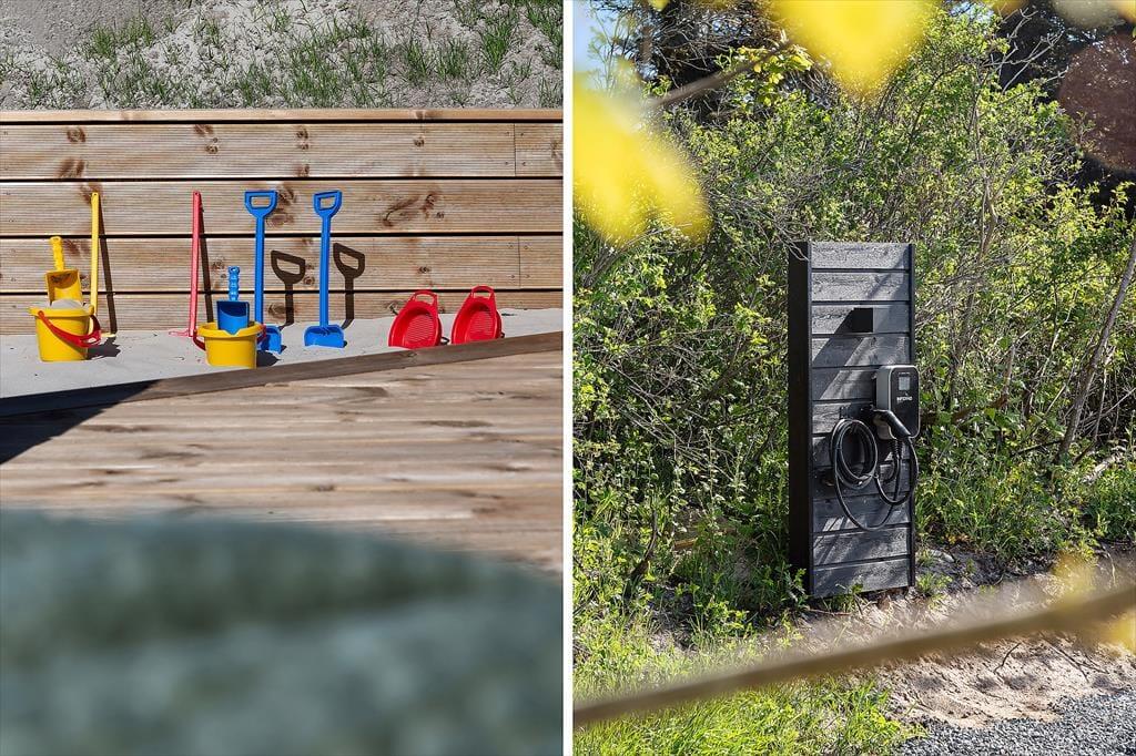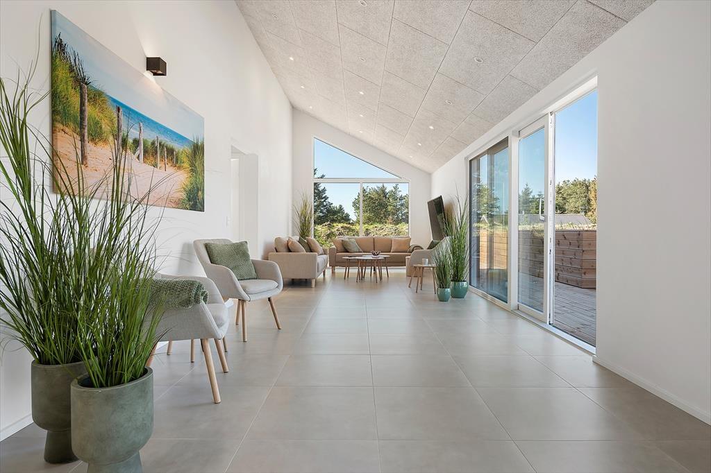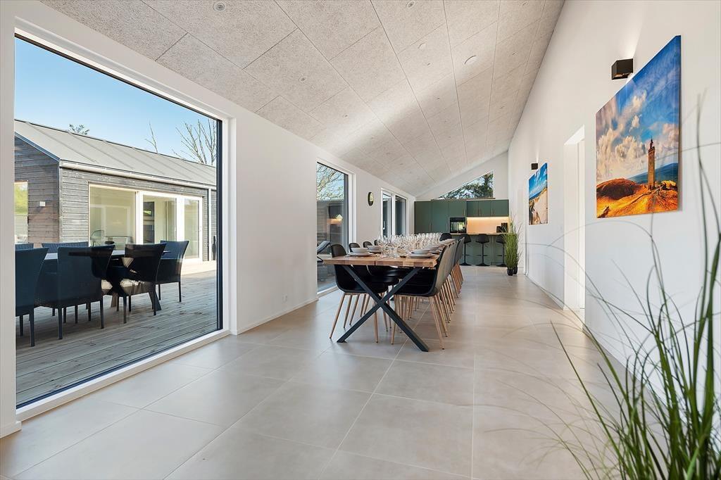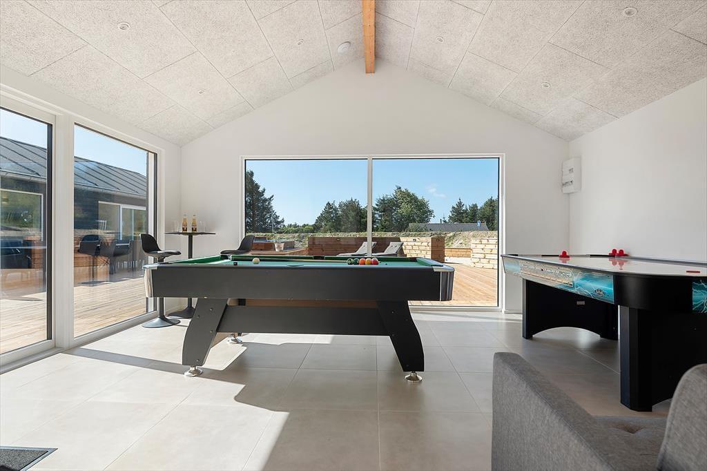 Inden døre er alt indrettet med tanke på den gode ferieoplevelse. Sommerhuset emmer af kvalitet og moderne komfort og er skræddersyet til ferier med mange mennesker – hvad enten det er hele familien, flere vennepar eller måske tre generationer samlet. De lyse rum indbyder til samvær, og det åbne opholdsmiljø skaber en skøn ramme for både madlavning, spil og hyggeaftener. Det veludstyrede køkken ligger i åben forbindelse med stuen, så du kan stå ved gryderne og stadig følge med i samtalen eller se børnene lege. Når I trænger til at koble helt af, kan I tage en tur i saunaen eller i spabadet på terrassen. Og for de mere energiske er aktivitetsrummet med både billardbord og airhockey et oplagt sted at udfordre hinanden på sjov og uformel vis – uanset alder.