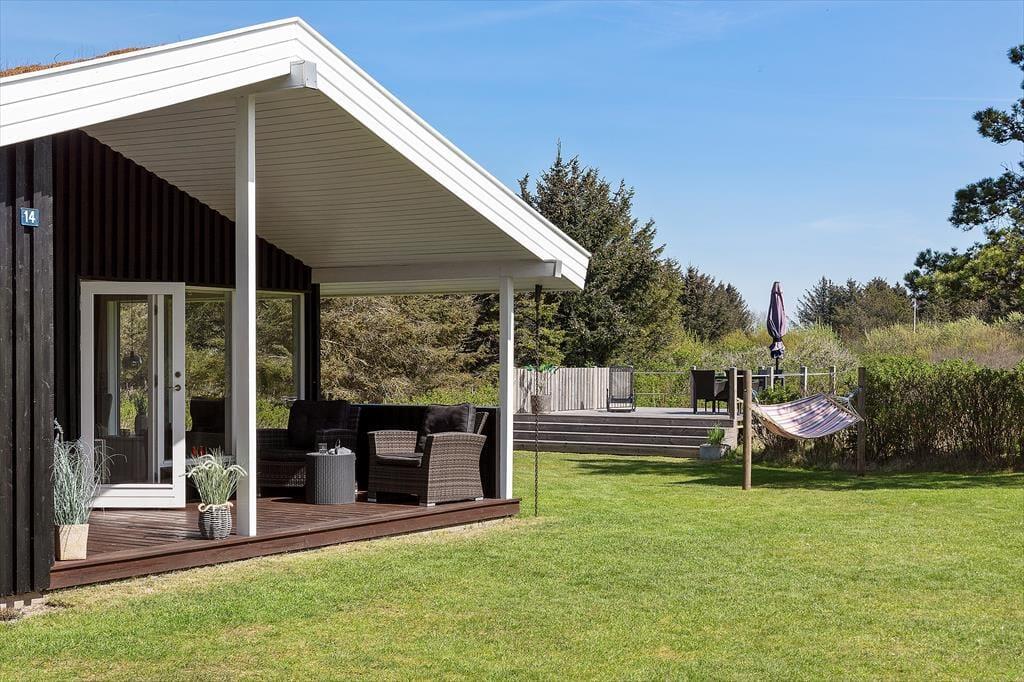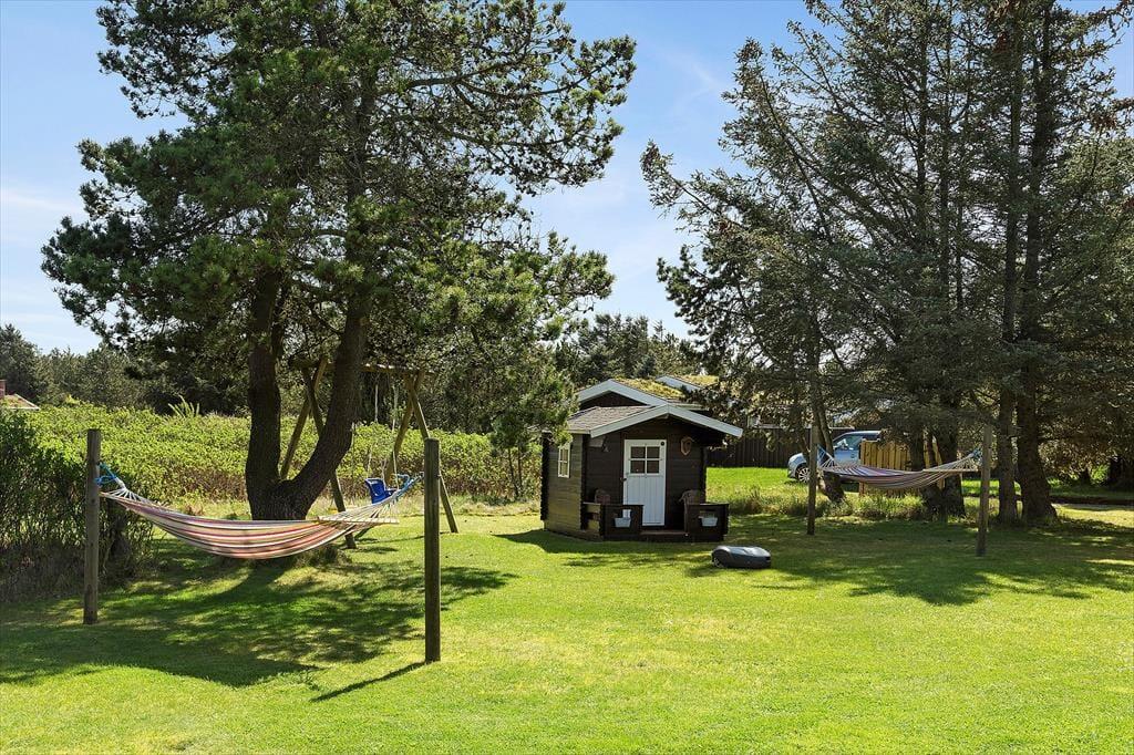 Udenfor venter en dejlig stor naturgrund, hvor du rigtig kan mærke feriefreden sænke sig. Det grønne landskab omkring huset indbyder til leg og afslapning, og børnene har masser af plads at boltre sig på, mens de voksne nyder en stille stund i liggestolen. Der er skabt et skønt terrassemiljø omkring huset, så der er altid en god krog at finde – hvad end du søger morgensolens lune stråler, en kop kaffe i skyggen midt på dagen eller aftensmad under åben himmel. Du kan nemt forestille dig, hvordan aftenerne kan forlænges med grillede retter og latter, mens solen går ned bag trætoppene og farver himlen i gyldne nuancer. Det er vaskeægte sommerhusliv, når det er bedst.