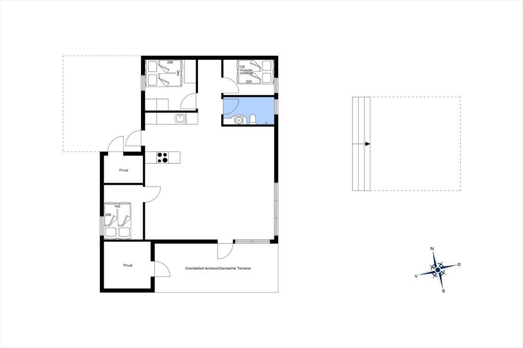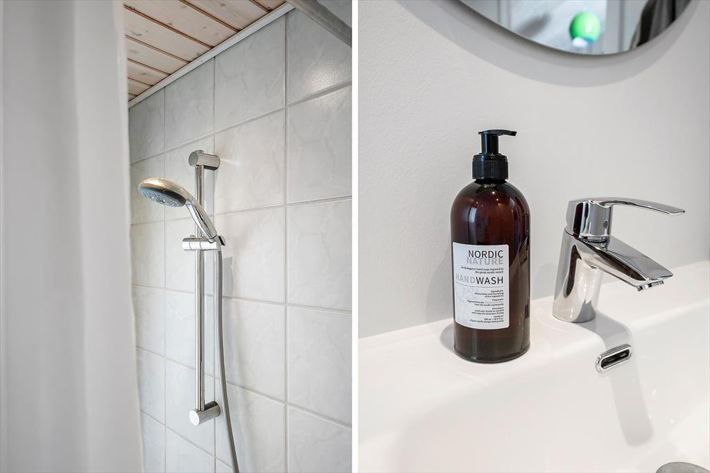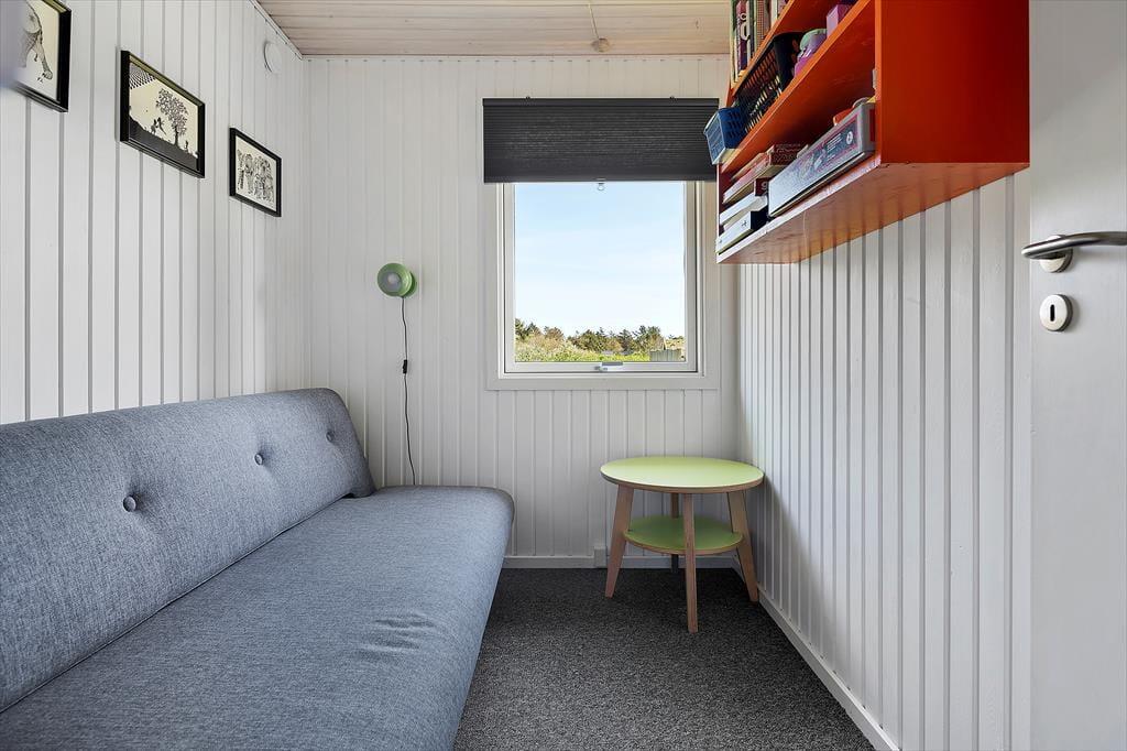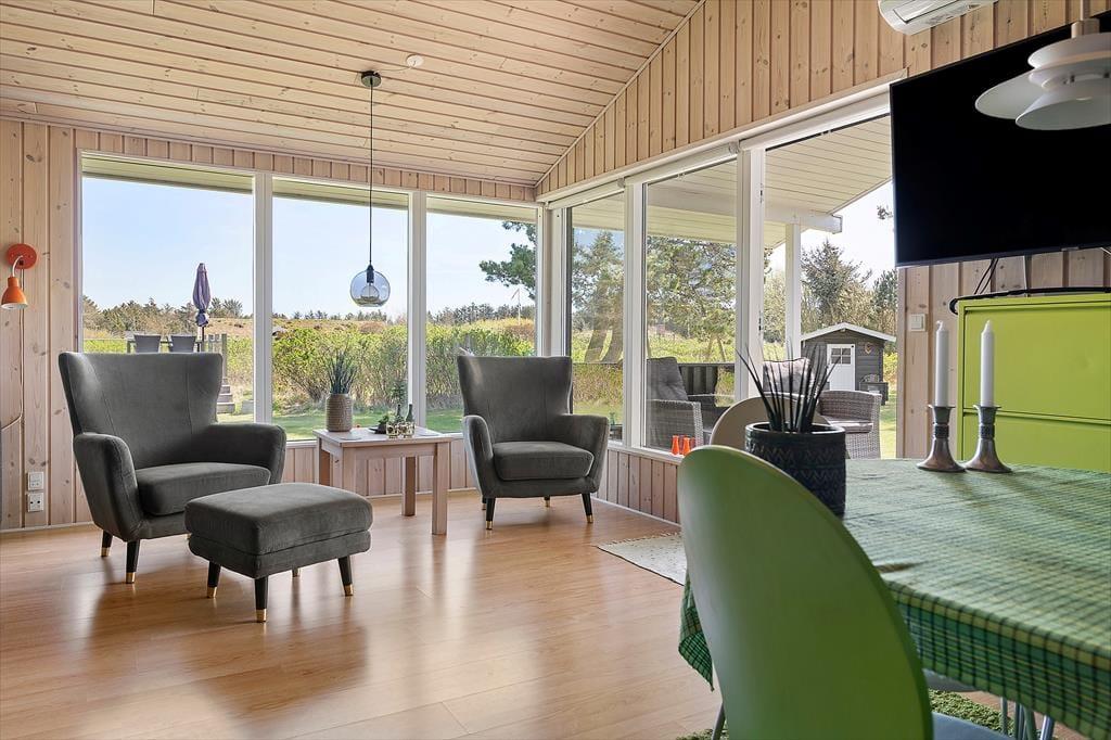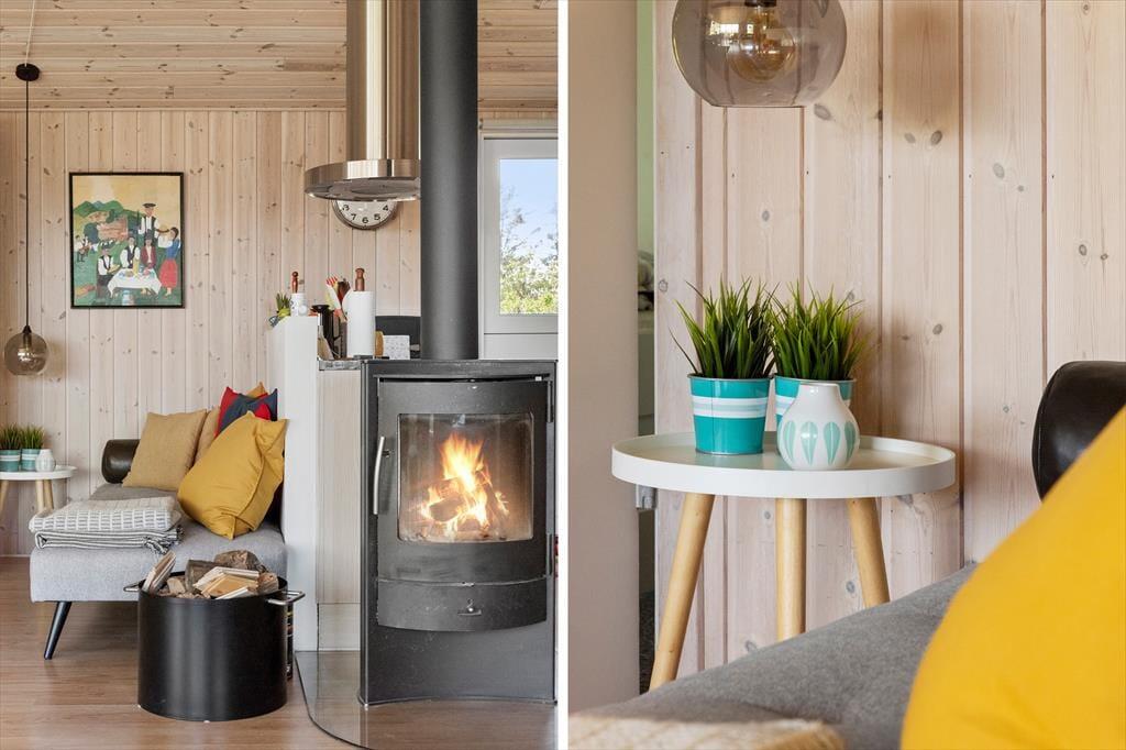 Når du træder ind i sommerhuset, bliver du mødt af en lys og indbydende atmosfære, hvor den gennemførte indretning skaber en afslappet stemning. Her kan du hurtigt finde dig til rette og mærke skuldrene sænke sig. Køkkenet og stuen er samlet i ét stort og hyggeligt opholdsrum, som gør det let at være sammen – uanset om der kokkereres, hygges med spil ved spisebordet eller slappes af i sofaen med en god film. I de kølige aftentimer kan du tænde op i brændeovnen, som spreder varme og hygge. Lyset strømmer ind gennem de store vinduer, og der er fra stuen direkte adgang til terrasseområdet, så du let kan lade inde og ude flyde sammen i løbet af dagen.