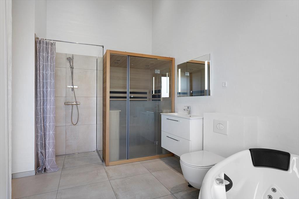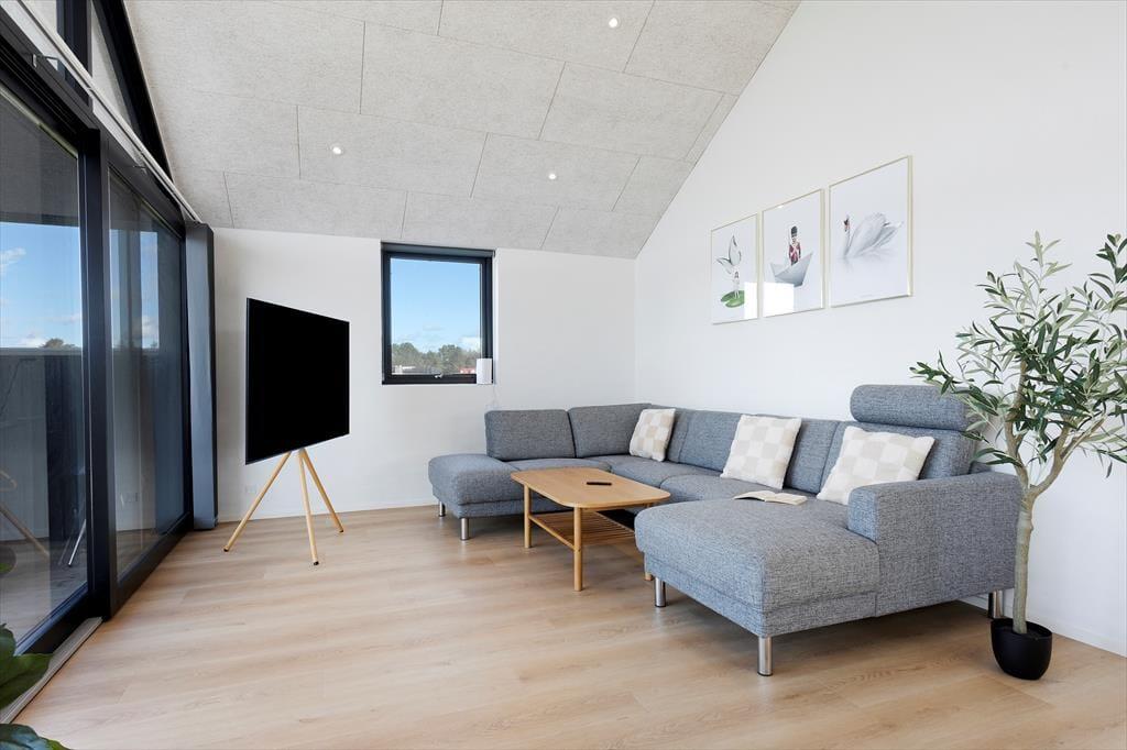 Det moderne sommerhus fra 2025 byder på lyse, åbne rum og en indretning, der skaber ro og rammerne for nærvær. Det centrale opholdsrum samler køkken og stue i ét, så du kan stå ved gryderne og stadig være en del af samtalen. Store vinduespartier lukker lyset og naturen ind og skaber en følelse af luft og frihed. Når dagen går på hæld, kan du forkæle dig selv med en tur i det varme spabad eller mærke varmen brede sig i kroppen i husets sauna. Det er den slags komfort, der gør det let at slappe helt af og finde ferieformen. Huset er rummeligt og velegnet til både store og små familier, og her er tænkt på, at alle skal føle sig hjemme.