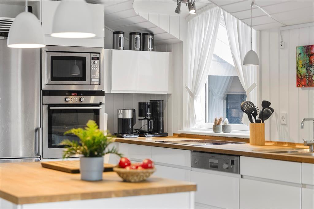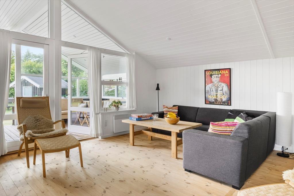 Sommerhuset er gennemtænkt indrettet, så lyset strømmer ind, og hver kvadratmeter udnyttes til fulde. De lyse rum giver en let og indbydende stemning, og fra to af soveværelserne kan du træde direkte ud på terrassen og starte dagen under åben himmel. Et af værelserne har endda en dobbeltseng med elevation, så komforten er helt i top, når det er tid til at slappe af. Køkken og stue er samlet i et åbent opholdsrum, hvor samtaler og samvær får lov at fylde, mens maden tilberedes. Herfra er der adgang til en hyggelig, lukket udestue, der forlænger sæsonen og giver mulighed for at nyde naturen – også på de køligere dage.