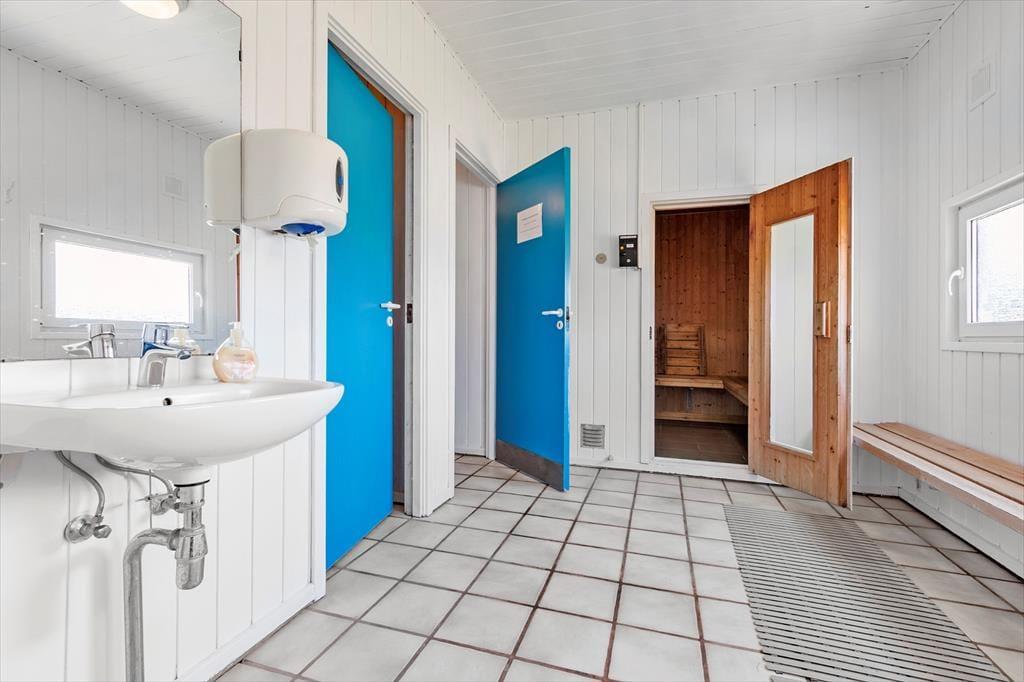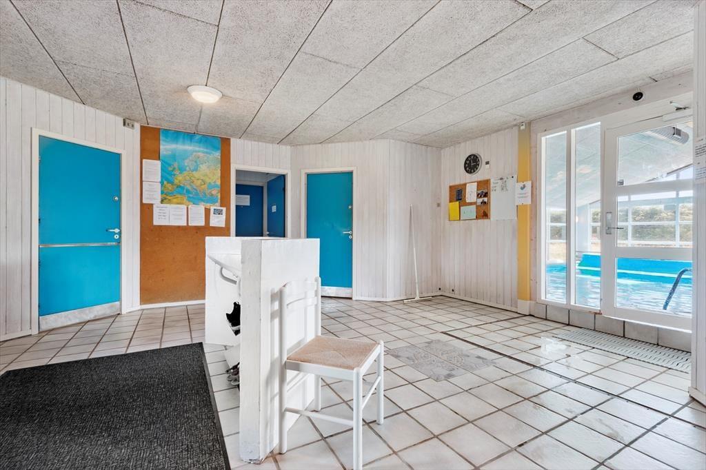 Den tilhørende fællesbygning er åben fra påske til og med uge 42, og her finder i en stor indendørs pool på 50 m2 og legeplads. Har man brug for at vaske og tørre tøj til de mange badeture i Vesterhavet er der vaskemaskine og tørretumbler til møntindkast i fællesbygning. Fra omklædningsrummene har man adgang til to saunaer; vær opmærksom på at saunaerne er kønsopdelte og kræver møntindkast, og at fællesbygningen ikke kan benyttes fra uge 43 og frem til påske.