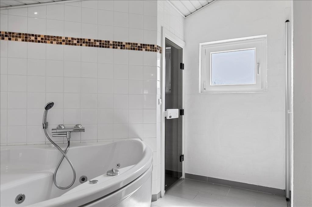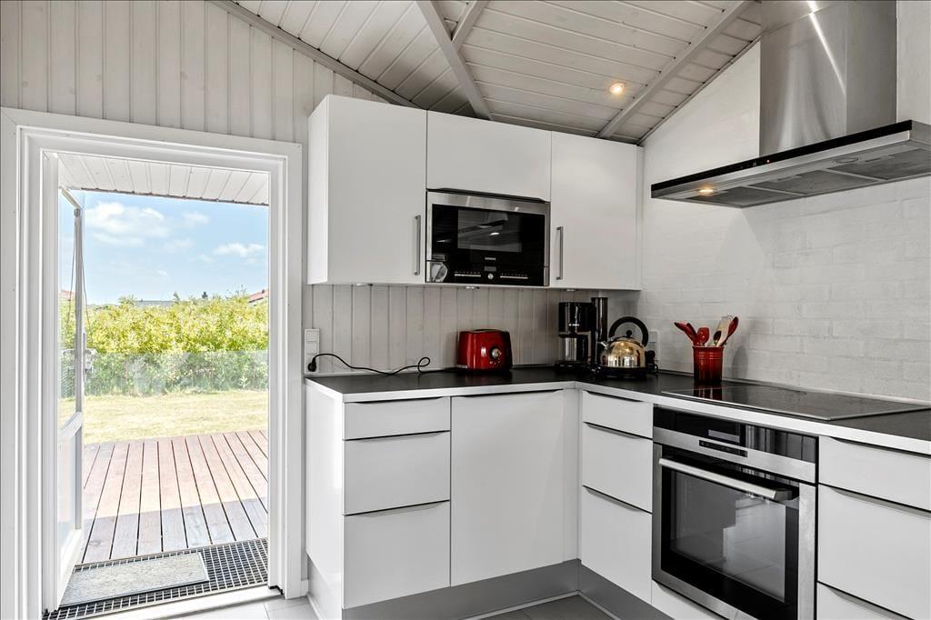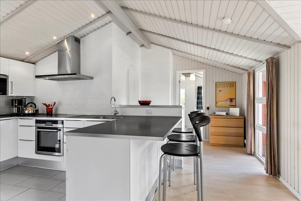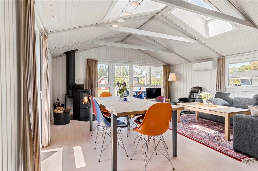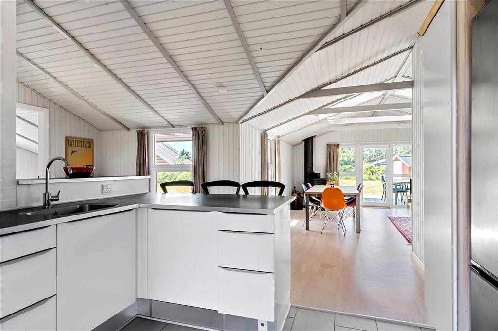 Sommerhuset har gennemgået en omfattende renovering og fremstår i dag i absolut topform. Fra indgangen kommer man direkte ind i det lyse og moderne køkken med højglansskabe og opvaskemaskine. I forlængelse heraf ligger stuen, hvor tagvinduerne giver et flot lysindfald. Stuen er lys og venlig og giver nem adgang til den delvist overdækkede terrasse. Sommerhuset råder over tre soveværelser, alle tre med dobbeltseng. På det flotte og lyst indrettede badeværelse kan man slappe af i spabadet og saunaen; her er kort sagt alt, hvad man kan forlange af en god og vellykket ferie.