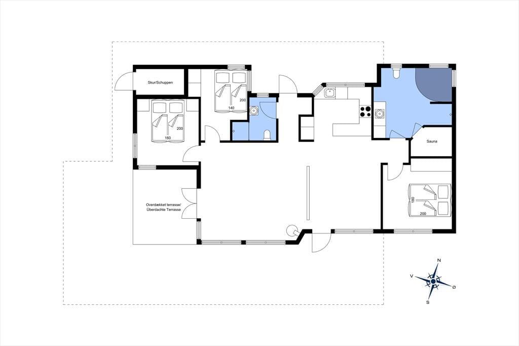 Fra entreen er der adgang til et af sommerhusets to flotte badeværelser og stuen. Stuen har loft til kip samt mange panoramavinduer, som året rundt giver en dejlig lys atmosfære. Stuen er også udstyret med en soundbar, som giver en rigtig god lyd. Det åbne og veludstyrede køkken ligger i forbindelse med spiseafdelingen, som er afgrænset via en halvhøj mur til stuen. I køkkenet er en airfryer, som gør madlavningen nem. Fra stuen er der adgang til et flot terrasseareal foran huset. Mod øst ligger et af husets tre soveværelser med en god dobbeltseng, og det store badeværelse med spa og sauna. Her er også husets hems med 2 madrasser. I den anden ende af huset ligger de to andre soveværelser der også har gode dobbeltsenge. Der er installeret varmepumpe, og huset er meget energivenligt og er egnet til udlejning hele året. Et hus man straks føler sig godt tilpas i, og det kan absolut danne rammen for en skøn ferie. Huset indeholder både sommer- og vinterdyner.