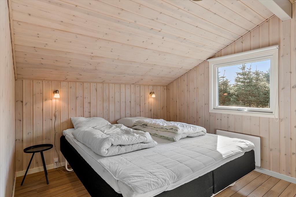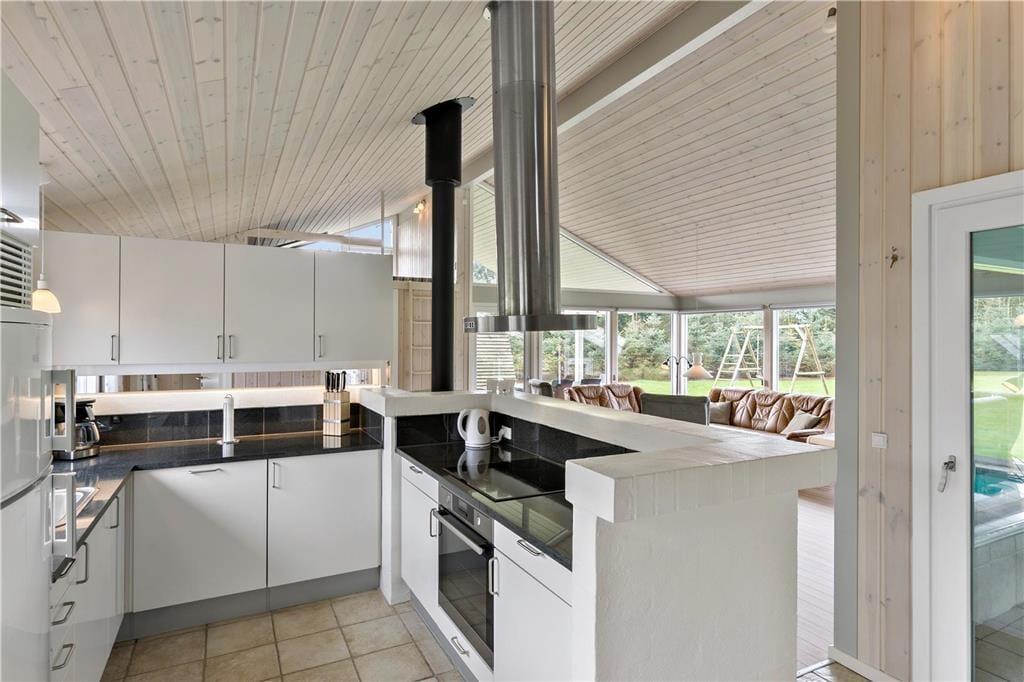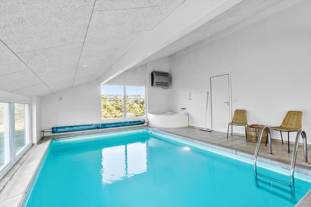 Fra stuen er der adgang til sommerhusets poolrum. Et dejligt rum med masser af lys og udsigt til haven fra de store vinduer. Bassinet er 19m2 stort med masser af plads til plask og leg, og når vandet begynder at føles lidt koldt, kan man gå i den varme sauna i det tilhørende badeværelse. Til de voksne anbefaler vi at fylde spabadet op og få løsnet musklerne efter en lang dag ved stranden eller i skoven.