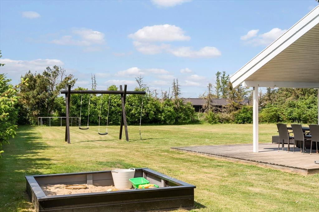 På den store naturgrund er der næsten garanti for et sjovt udendørsliv, med legehus, sandkasse, gynge og trampolin er alle muligheder i hvert fald til stede. Sommerhuset ligger godt i læ fra de høje træer, som omgiver det meste af grunden, og solen kan nydes fra de to terrasser; den ene i det sydøstlige hjørne har en overdækket del, og den anden østvendte er ideel til morgenkaffen.