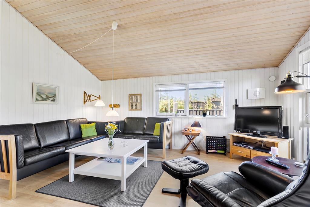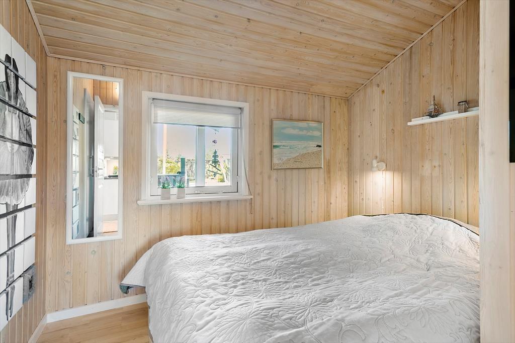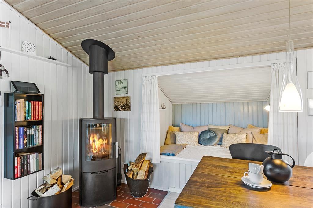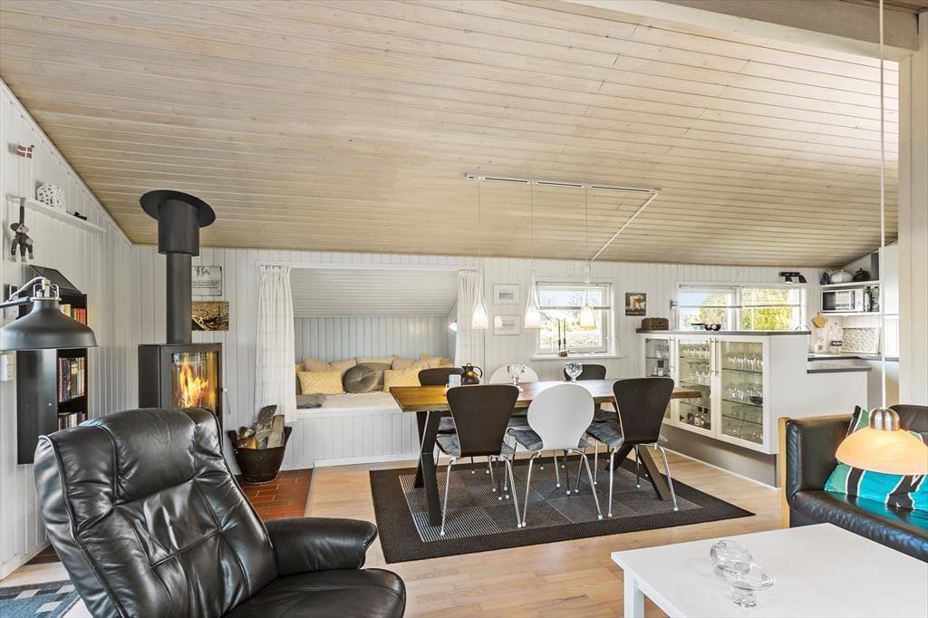 Et sommerhus med gennemført hyggelig indretning, hvor ejernes store kærlighed til stedet skinner klart igennem. Alt er velholdt og i fin kvalitet, så her kan man virkelig nyde sin ferie i de skønneste rammer. Køkkenet er af nyere dato og ligger ud-i-et med spisestue og stue, hvor der kan tændes op i brændeovnen, hvis vejret er køligt. Huset råder over tre soveværelser med dobbeltsenge, hvoraf de to er placeret i en moderne vinkeltilbygning ved entreen, og i stuen finder man en indbygget alkove, som kan bruges til hyggested eller som en ekstra soveplads. Overalt kan man gå på det gratis og trådløse internet, så det er en god ide at pakke pc eller tablets med til opholdet.